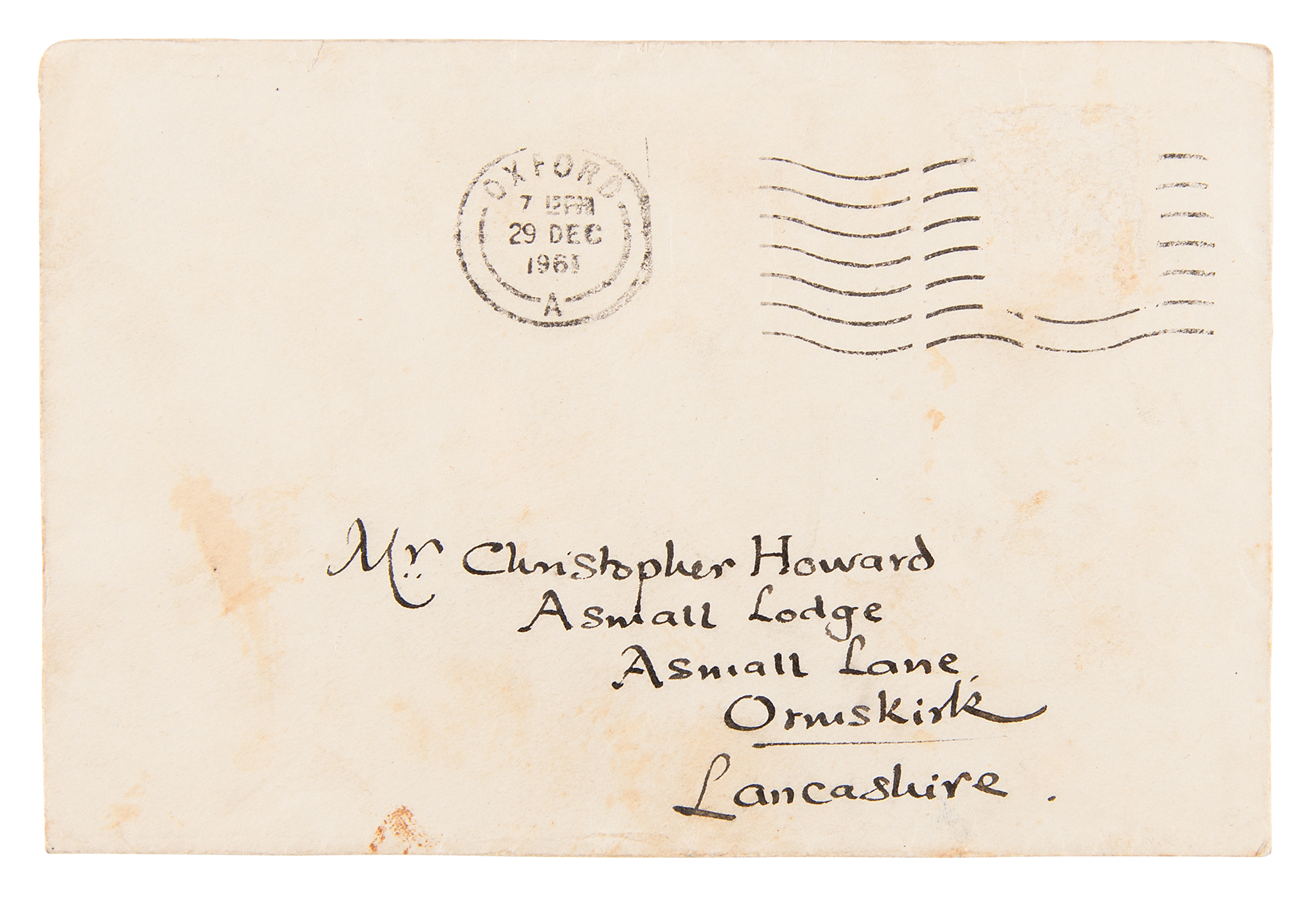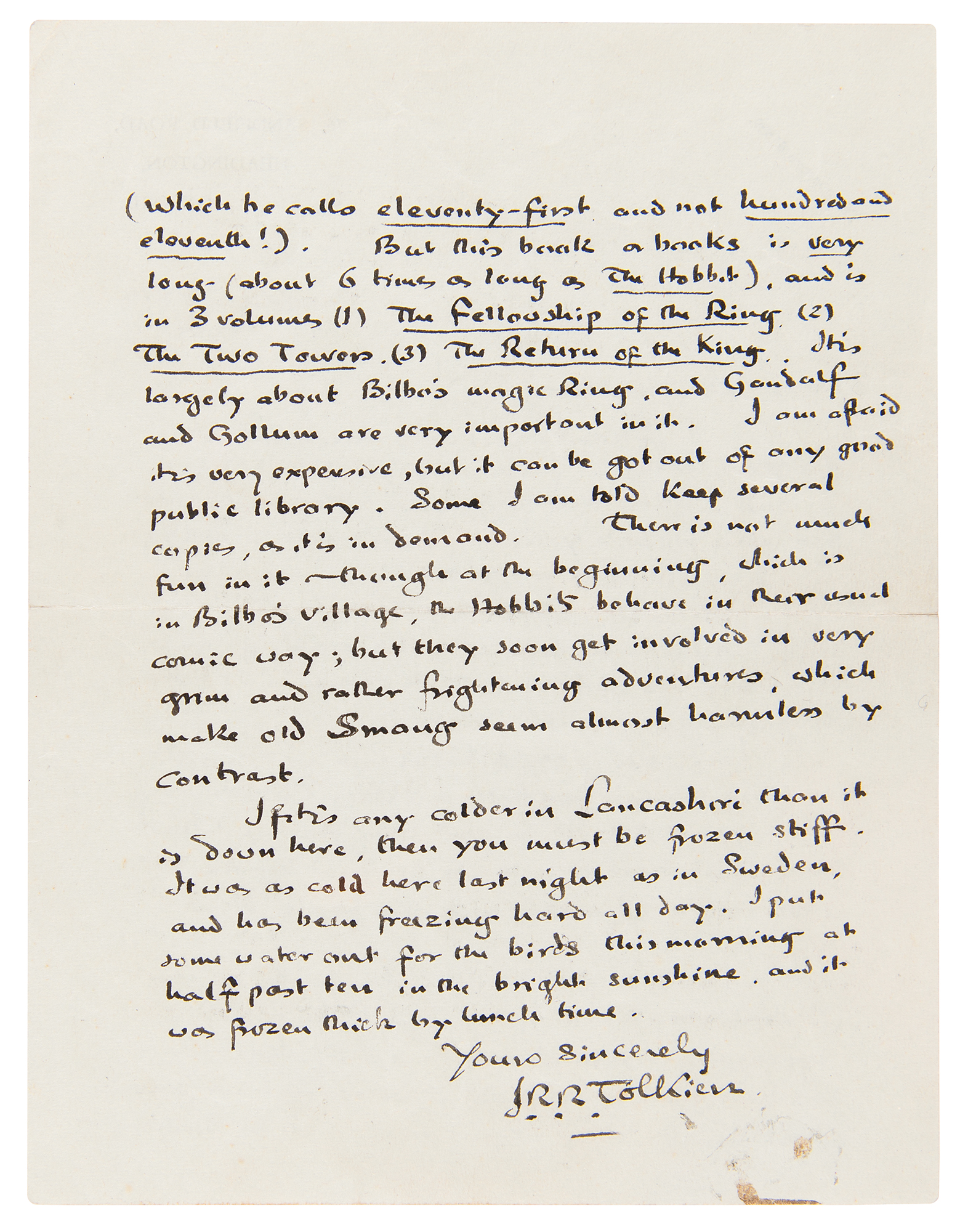 If it is any colder in Lancashire than it is down here, then you must be frozen stiff. It was as cold here last night as in Sweden and has been freezing hard all day. I put some water out for the birds this morning at half past ten in the bright sunshine, and it was frozen solid by lunch time.” In fine condition. Accompanied by the original mailing envelope hand-addressed by Tolkien.