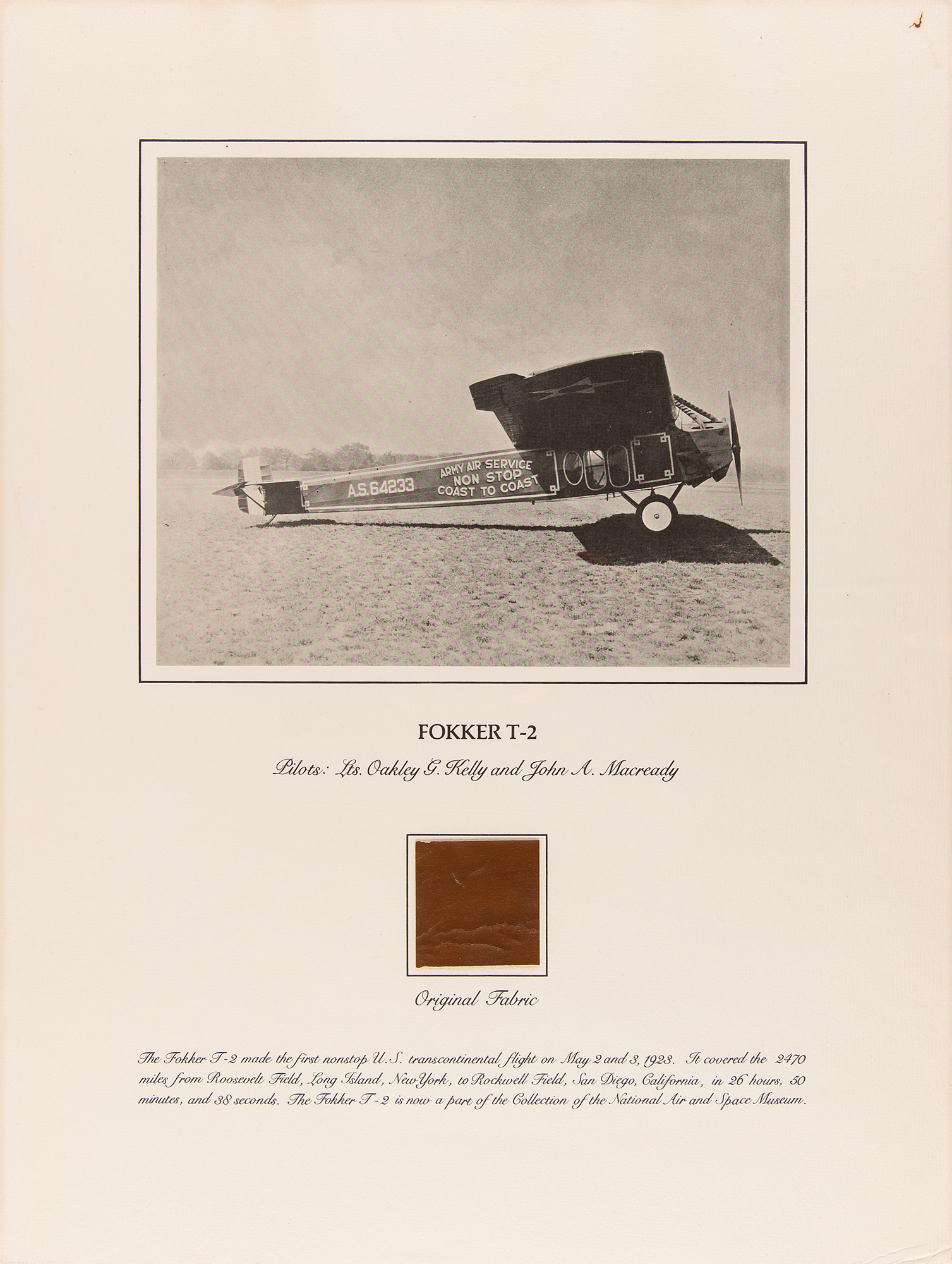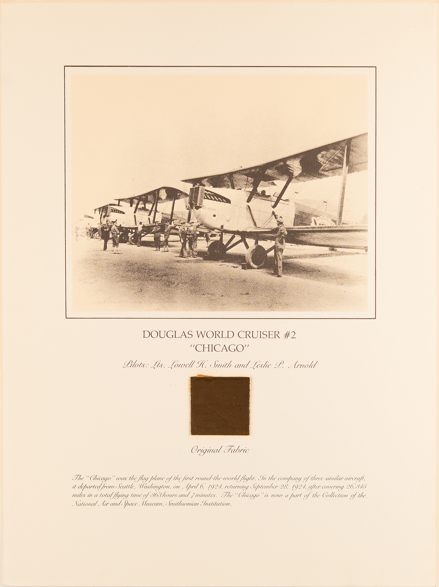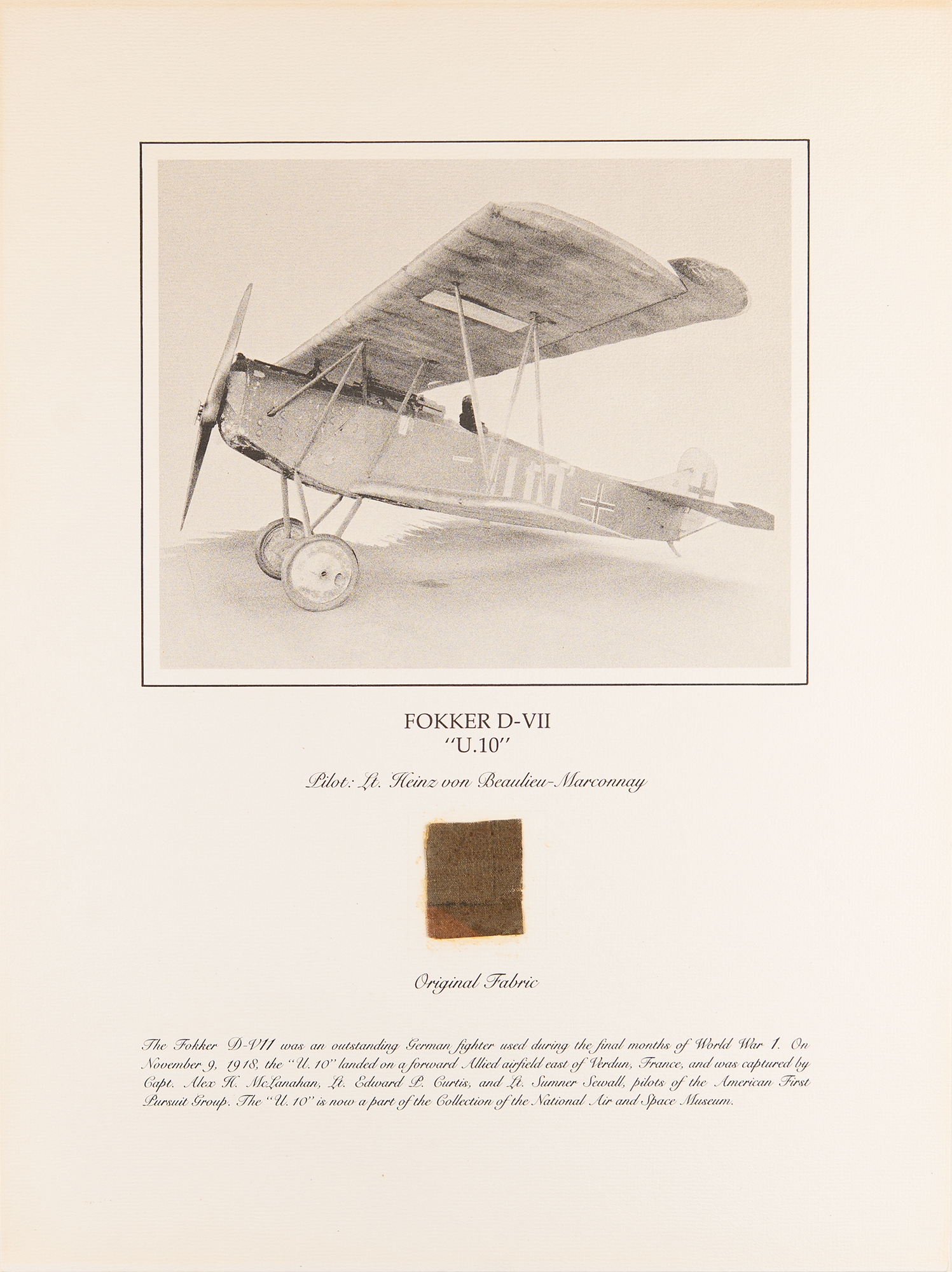 Complete set of the nine flown fabric presentations created by the Smithsonian Institution National Air and Space Museum with fabric removed during restoration of historically important aircraft. Each swatch measures about 2 x 2 and is affixed to its respective 15 x 20 informational poster. The artifacts include: a brown swatch from Calbraith Perry Rodgers's Wright Brothers Vin Fiz; a red swatch from Amelia Earhart's Lockheed Vega 5B; a dark brown swatch from Oakley Kelly and John Macready's Fokker T-2 (detached but present); a beige swatch from the Bleriot XI; a dark brown swatch from the Douglas World Cruiser 'Chicago' that made the first around-the-world flight in 1924; a dark brown swatch from Lt. Heinz von Beaulieu-Marconnay's Fokker D-VII 'U.10'; a brown swatch from the Albatros D.Va No. 7161/17; a light brown swatch from the Curtiss NC-4 Flying Boat that made the first transatlantic flight in 1919; and a dark brown swatch from the De Havilland DH-4 WWI bomber. In overall fine condition. A remarkable collection of relics from some of the most important aircraft in aviation history—rarely offered as a complete set.