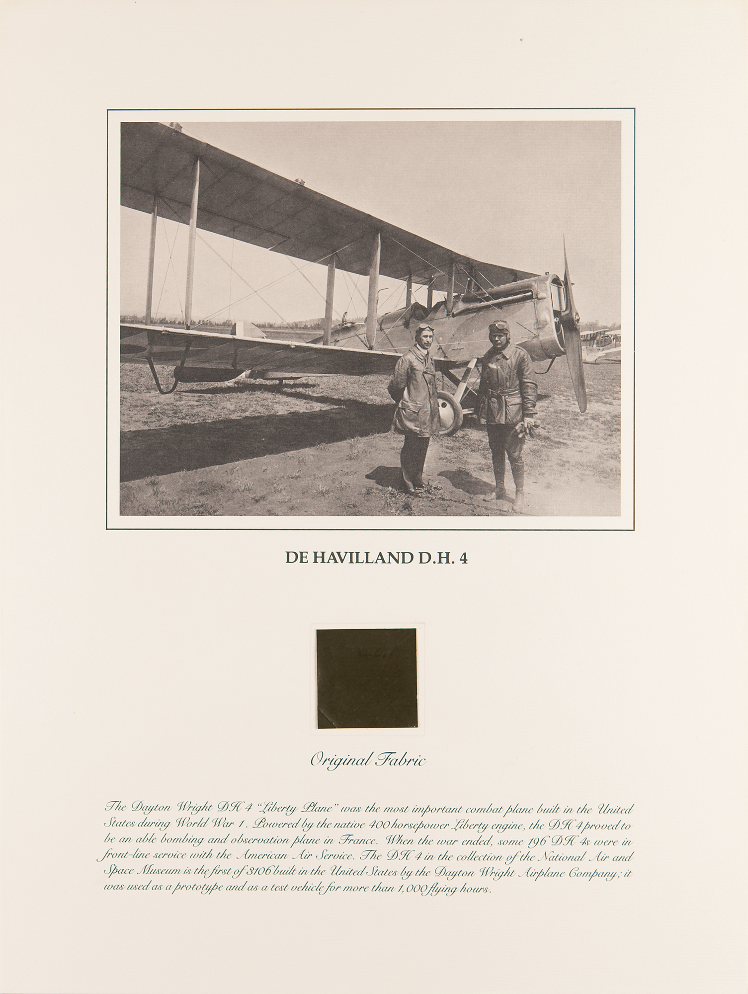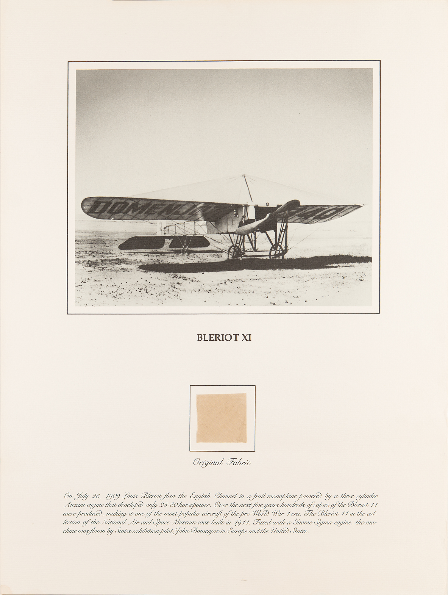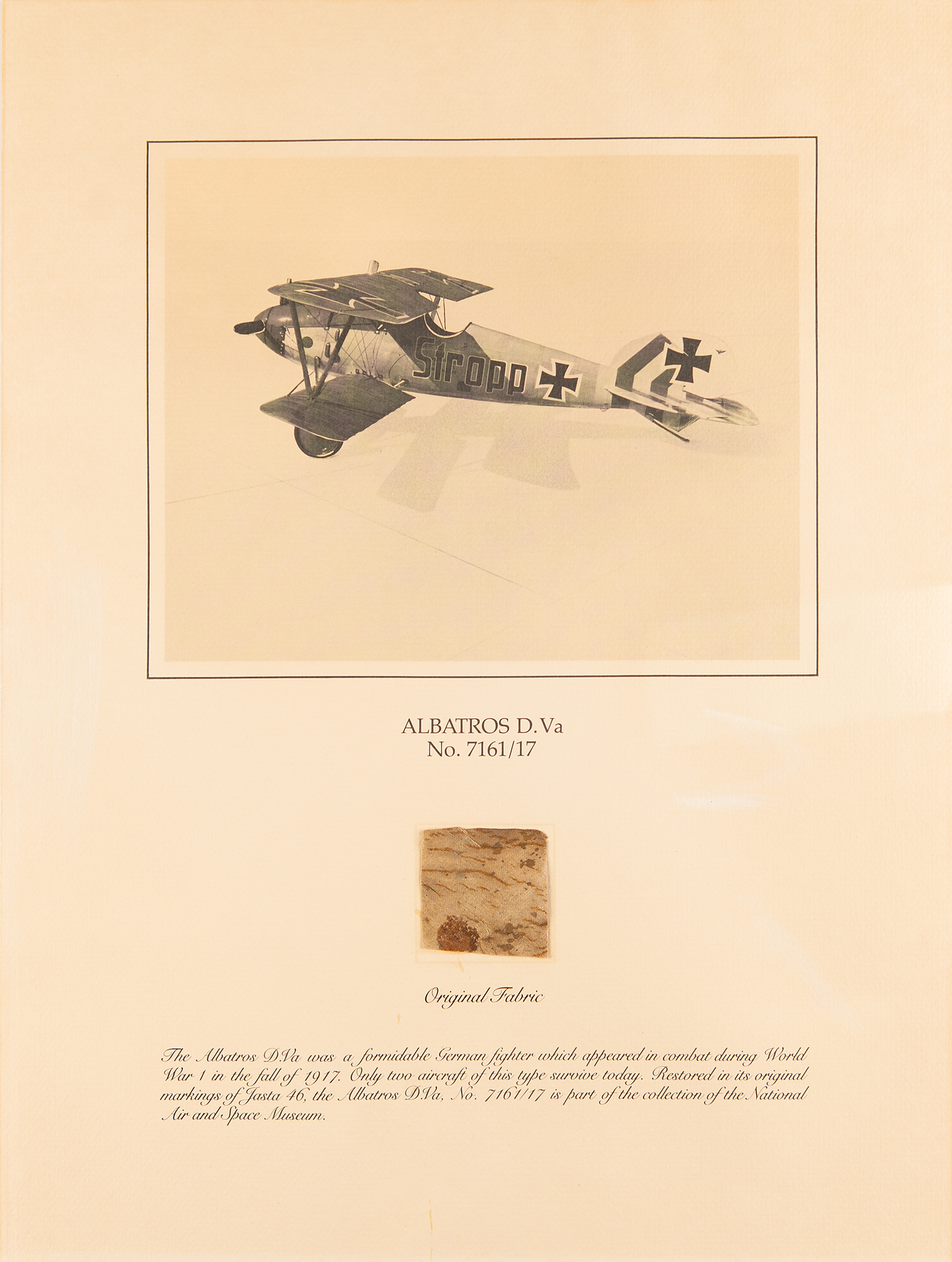 Complete set of the nine flown fabric presentations created by the Smithsonian Institution National Air and Space Museum with fabric removed during restoration of historically important aircraft. Each swatch measures about 2 x 2 and is affixed to its respective 15 x 20 informational poster. The artifacts include: a brown swatch from Calbraith Perry Rodgers's Wright Brothers Vin Fiz; a red swatch from Amelia Earhart's Lockheed Vega 5B; a dark brown swatch from Oakley Kelly and John Macready's Fokker T-2 (detached but present); a beige swatch from the Bleriot XI; a dark brown swatch from the Douglas World Cruiser 'Chicago' that made the first around-the-world flight in 1924; a dark brown swatch from Lt. Heinz von Beaulieu-Marconnay's Fokker D-VII 'U.10'; a brown swatch from the Albatros D.Va No. 7161/17; a light brown swatch from the Curtiss NC-4 Flying Boat that made the first transatlantic flight in 1919; and a dark brown swatch from the De Havilland DH-4 WWI bomber. In overall fine condition. A remarkable collection of relics from some of the most important aircraft in aviation history—rarely offered as a complete set.