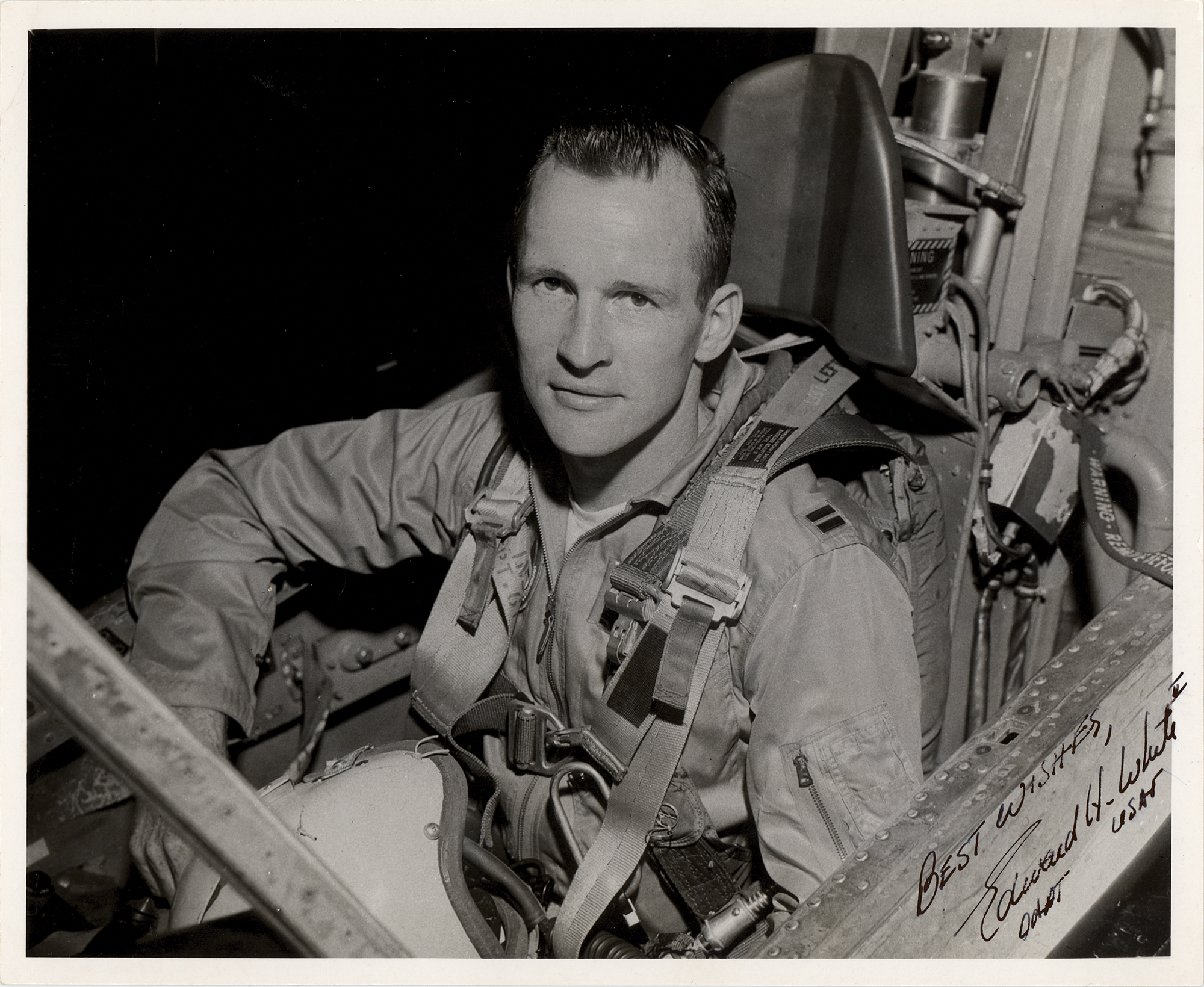 Vintage glossy 10 x 8 photo of Ed White in the cockpit of a USAF aircraft, neatly signed in fountain pen, "Best wishes, Edward H. White II, Capt. USAF.” In fine condition, with light surface impressions near the top edge from a collector's notation on the back.