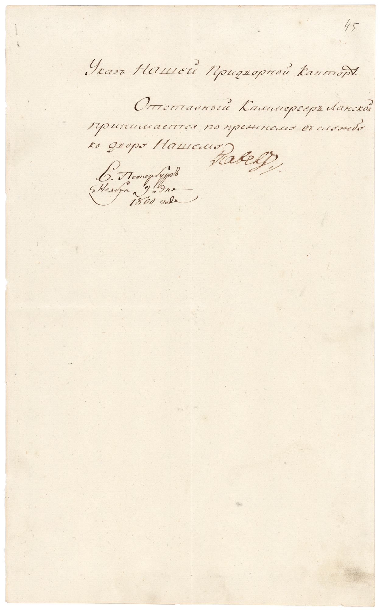 Emperor of Russia (born 1754) from 1796 until his assassination in 1801. The son of Catherine the Great and Peter III, Paul I was a champion of the poorer classes, his sweeping reforms alienated the Russian nobility and were thought to have provided a prime motivation for the conspiracy that led to his brutal death. Manuscript DS in Russian, one page, 7.75 x 12.75, 1800. Untranslated document approved by the emperor of Russia. In fine condition.