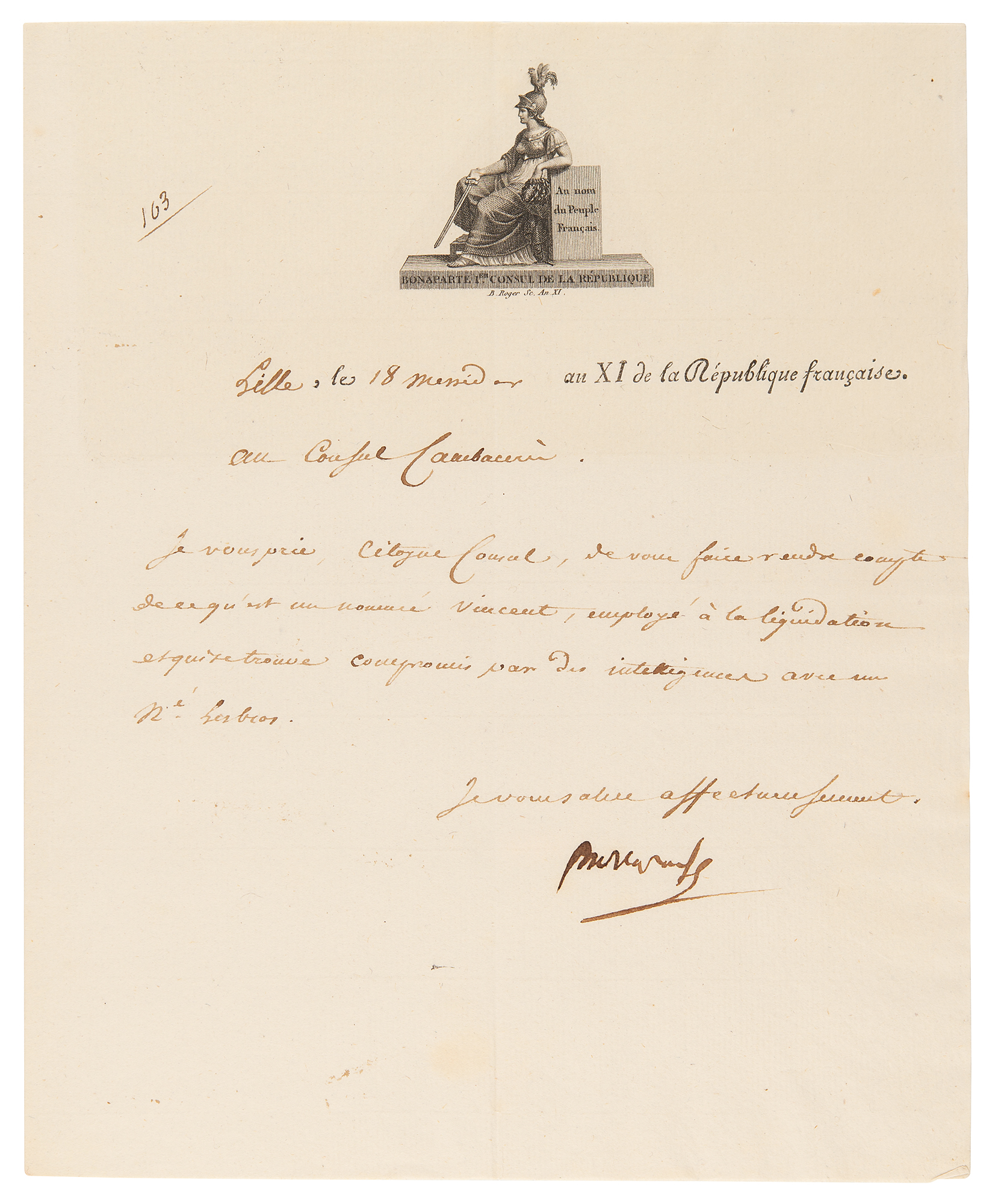LS in French, signed “Bonaparte,” one page, 7.5 x 9.25, personal engraved 'Bonaparte I Consul of the Republic' letterhead, July 7, 1803. Letter to Jean-Jacques Cambacérès asking him to obtain information regarding a plotter, in part (translated): “I ask you, Citizen Consul, to obtain information regarding one Vincent, employed at the liquidation and who has been compromised by association with a M. Lesbros.” In fine condition.
