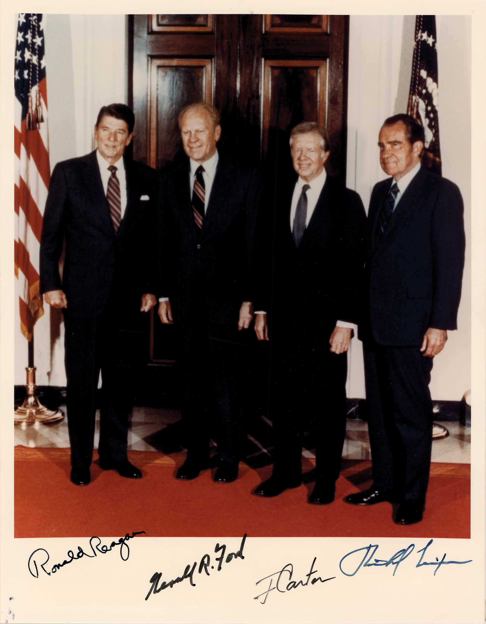 Sought-after color satin-finish 8 x 10 photo of Presidents Nixon through Reagan gathered at the White House before departing for Anwar Sadat's funeral in 1981, signed in the lower border in black felt tip, “Ronald Reagan,” "Gerald R. Ford," "J. Carter," and “Richard Nixon.” In fine condition, with small stray ink marks in the lower left corner.