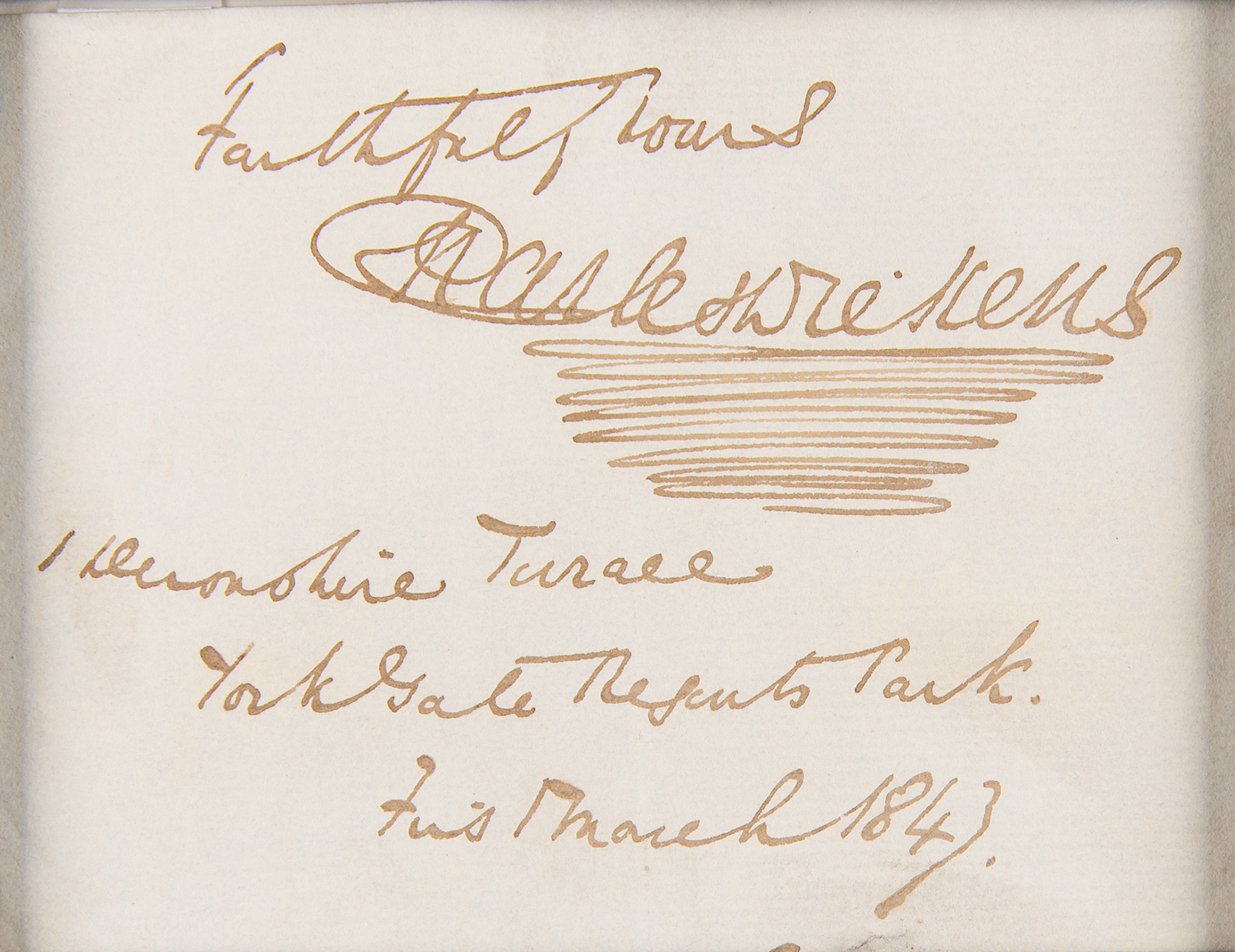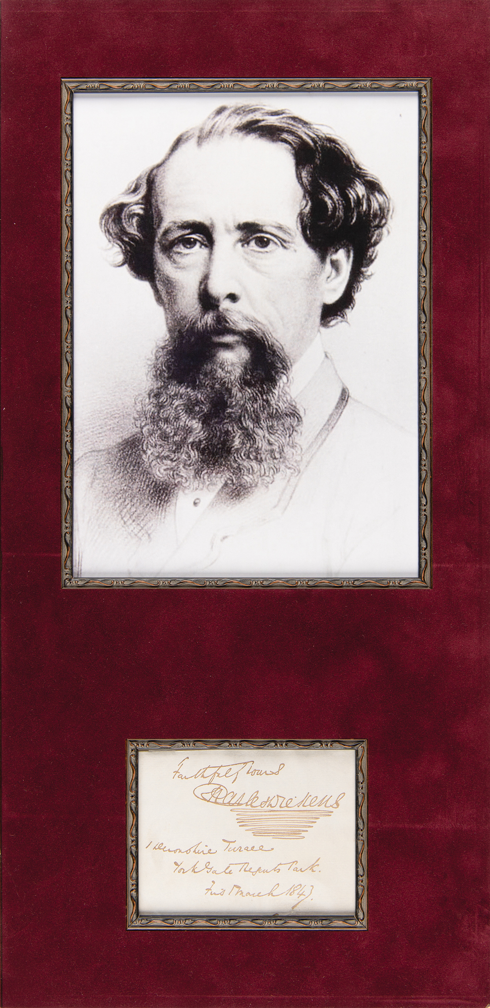 Superb ink signature, "Faithfully yours, Charles Dickens, 1 Devonshire Terrace, York Gate Regents Park, First March 1843,” on an off-white 4.25 x 3.25 sheet. Suede-matted with a portrait to an overall size of 9.75 x 20. In fine condition. A desirable autographic example that dates to the publication year of his classic novella A Christmas Carol.