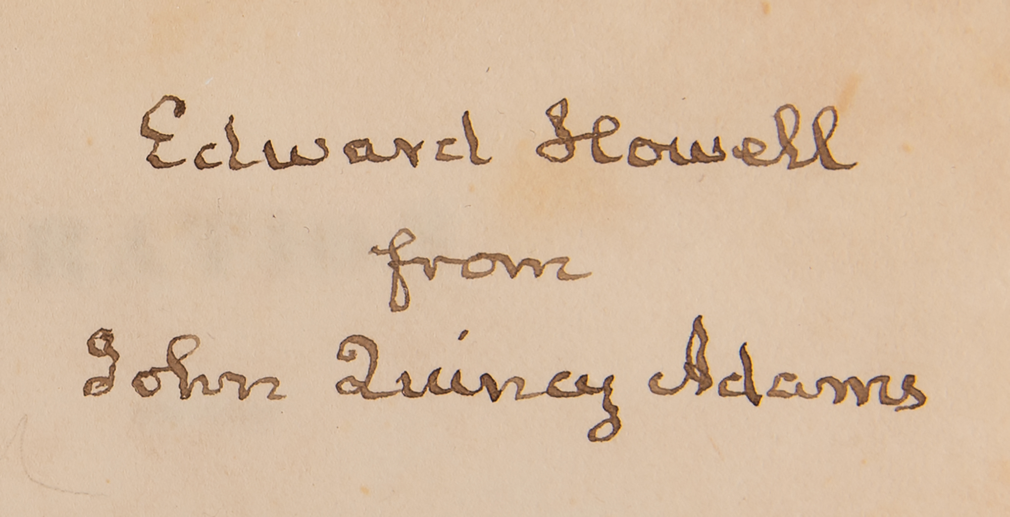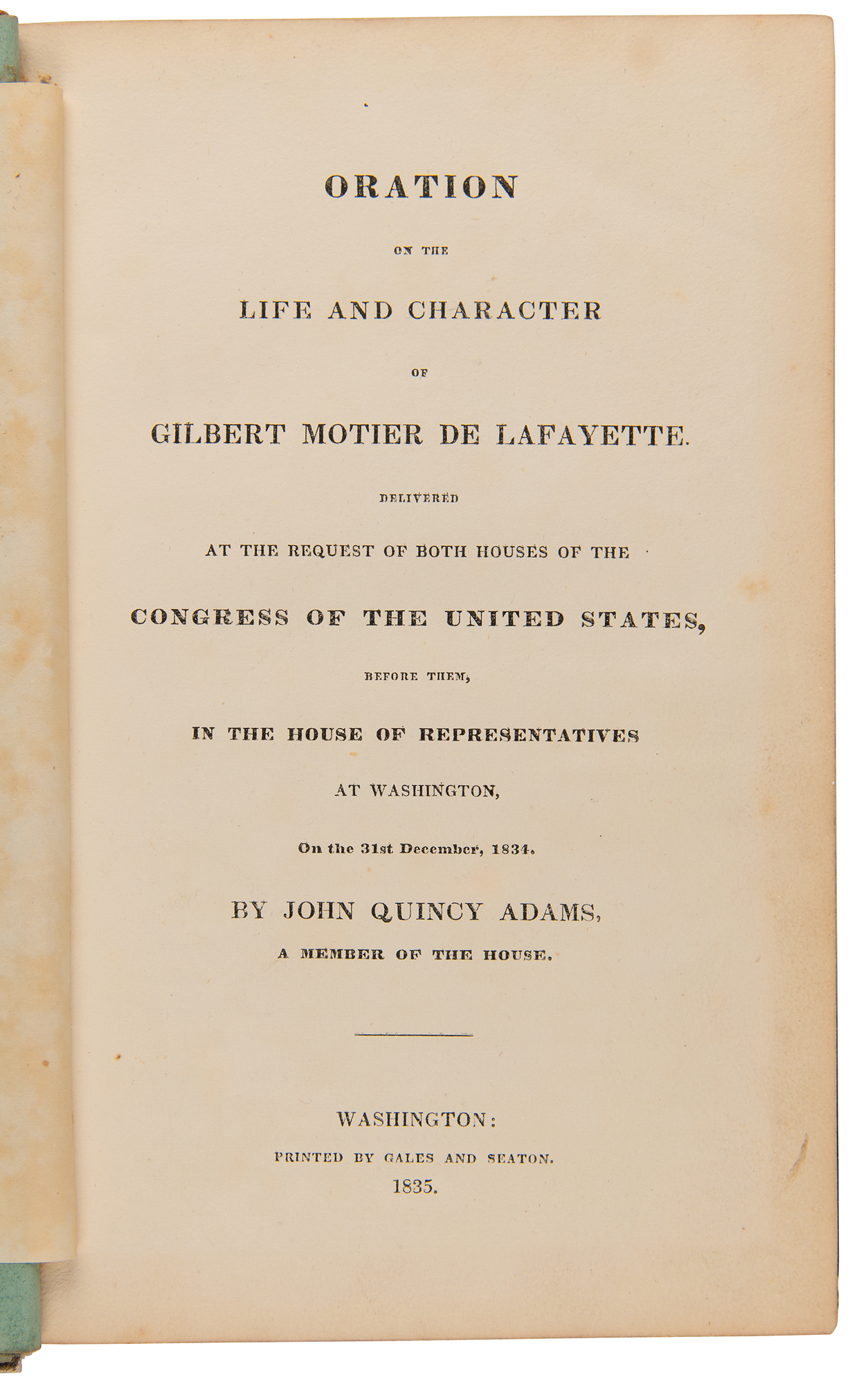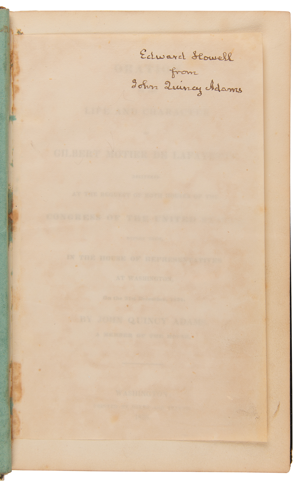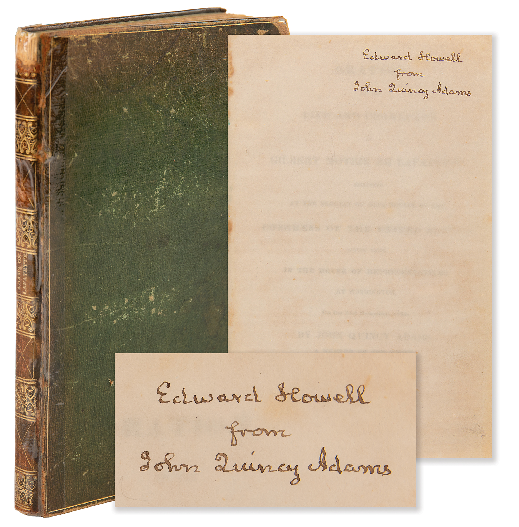 Signed book: Oration on the life and character of Gilbert Motier de Lafayette, Delivered at the request of both houses of the Congress of the United States, before them, in the House of Representatives at Washington, on the 31st December, 1834. First edition. Washington: Gales and Seaton, 1835. Hardcover bound in full green morocco, 5.5 x 8.75, 94 pages. Signed and inscribed on a slip tipped to the title page in ink, "Edward Howell from John Quincy Adams." Adams was out of the country when this booklet was published, so he pre-inscribed slips for the printer to tip in and present to his friends. Autographic condition: fine, with faint mottled staining. Book condition: G/None, with crude tape repairs to joints and spine, staining and scuffling to boards, and heavy wear to corners.