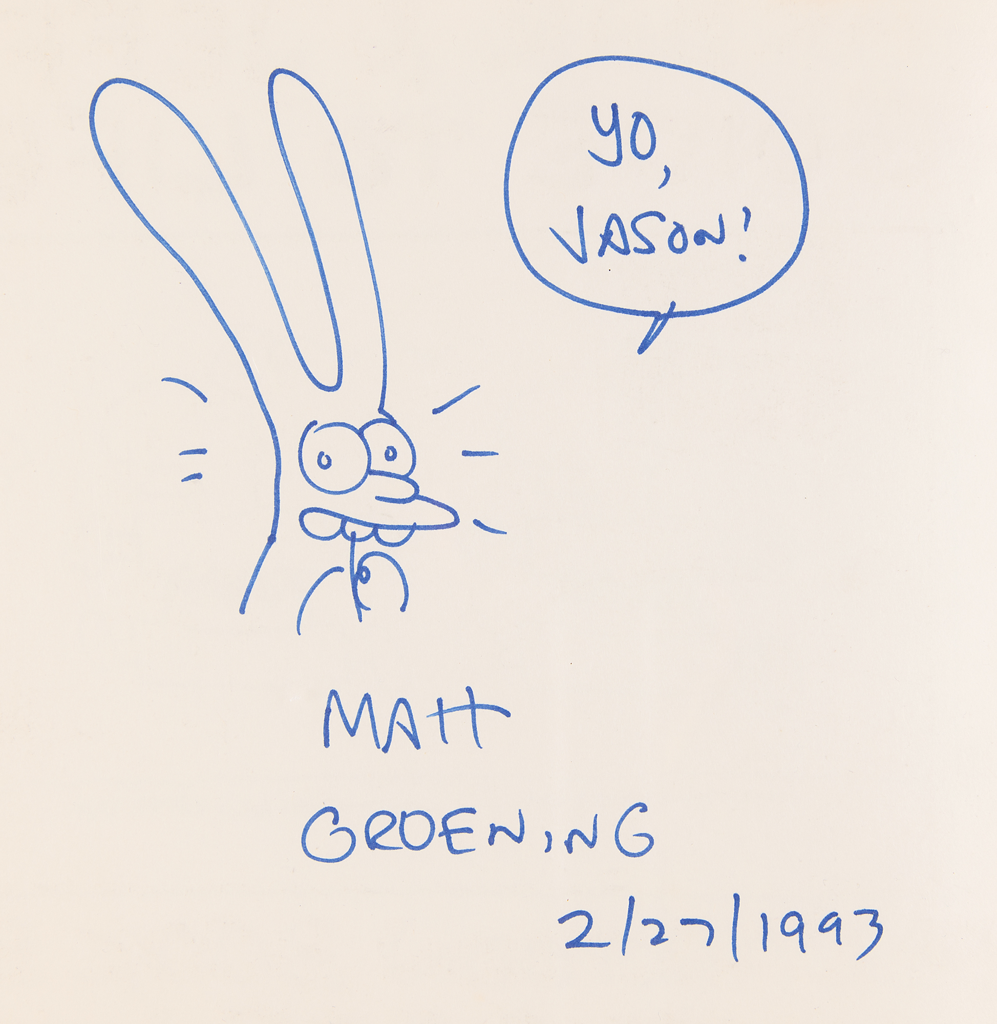 Signed book: Akbar & Jeff's Guide to Life. First edition. NY: Pantheon Books, 1989. Softcover, 9 x 9, 48 pages. Signed on the inside front cover in blue felt tip, “Matt Groening, 2/27/1993," who adds a sketch of Binky the rabbit from his Life in Hell comic strip, with Groening adding a speech bubble inscription above, “Yo, Jason!” In fine condition, with toning and scuffing to covers, and trivial dampstaining to edges.