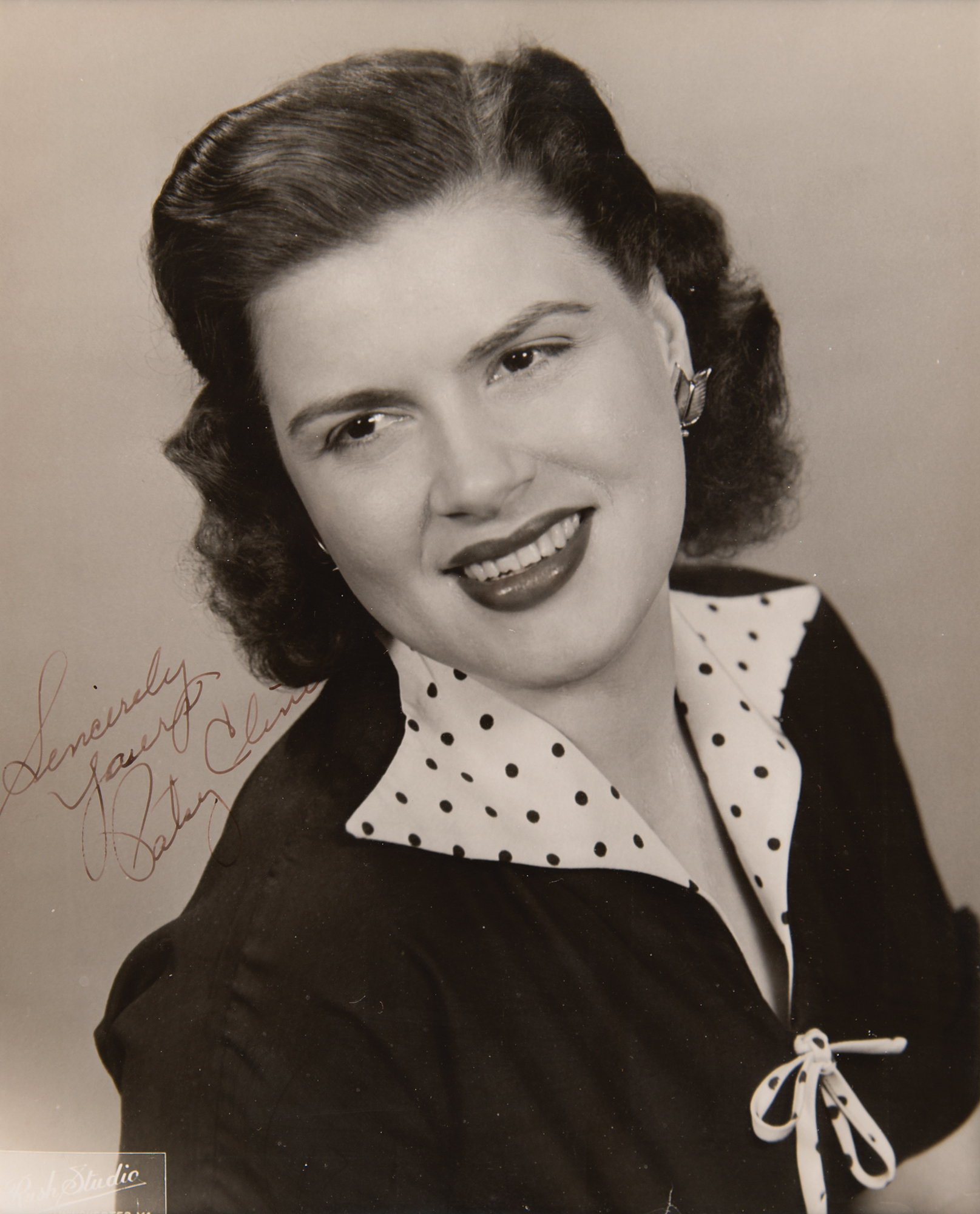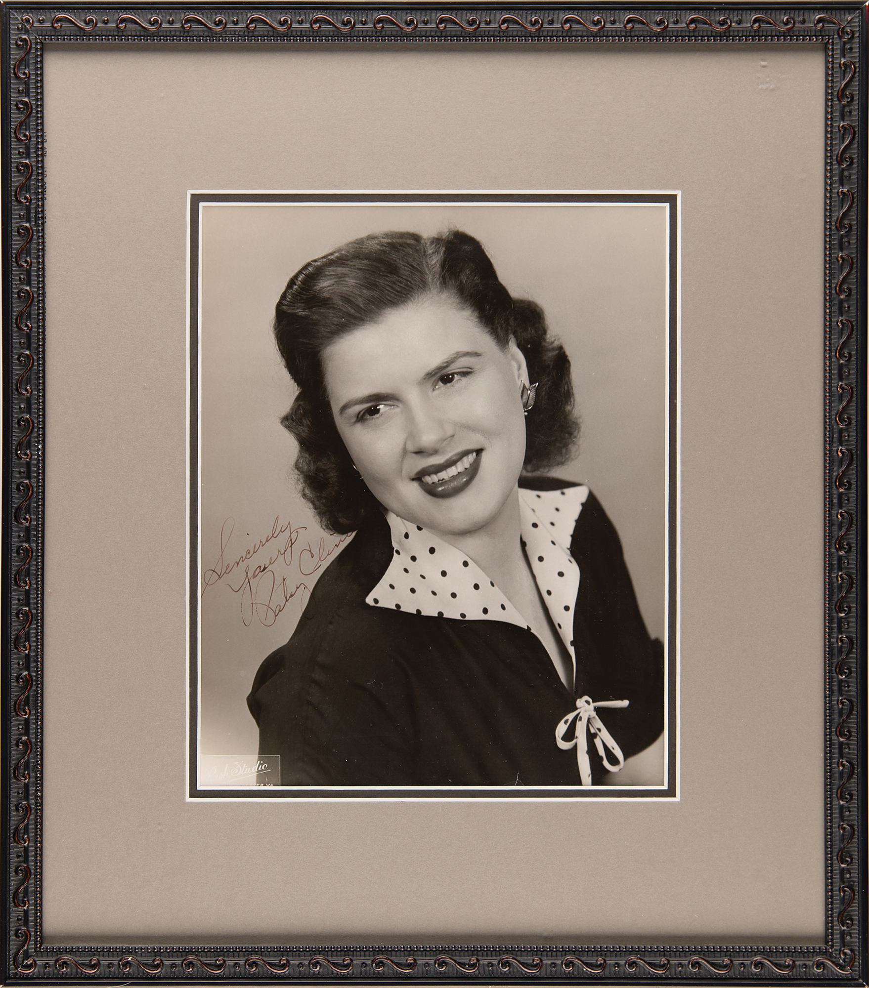 Popular and distinctive country-and-western 'crossover' star (1932–1963) who achieved iconic status upon her death in a plane crash at the age of 30. Superb vintage glossy 7.5 x 9.5 Rush Studio portrait of Cline in a dark dress with a polka-dot collar, nicely signed in fountain pen, "Sincerely yours, Patsy Cline." Archivally double-matted and framed to an overall size of 14 x 16. In fine condition.