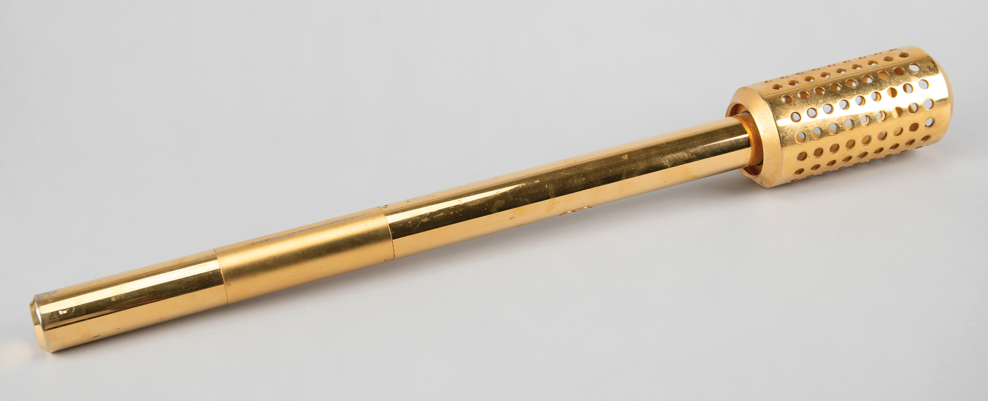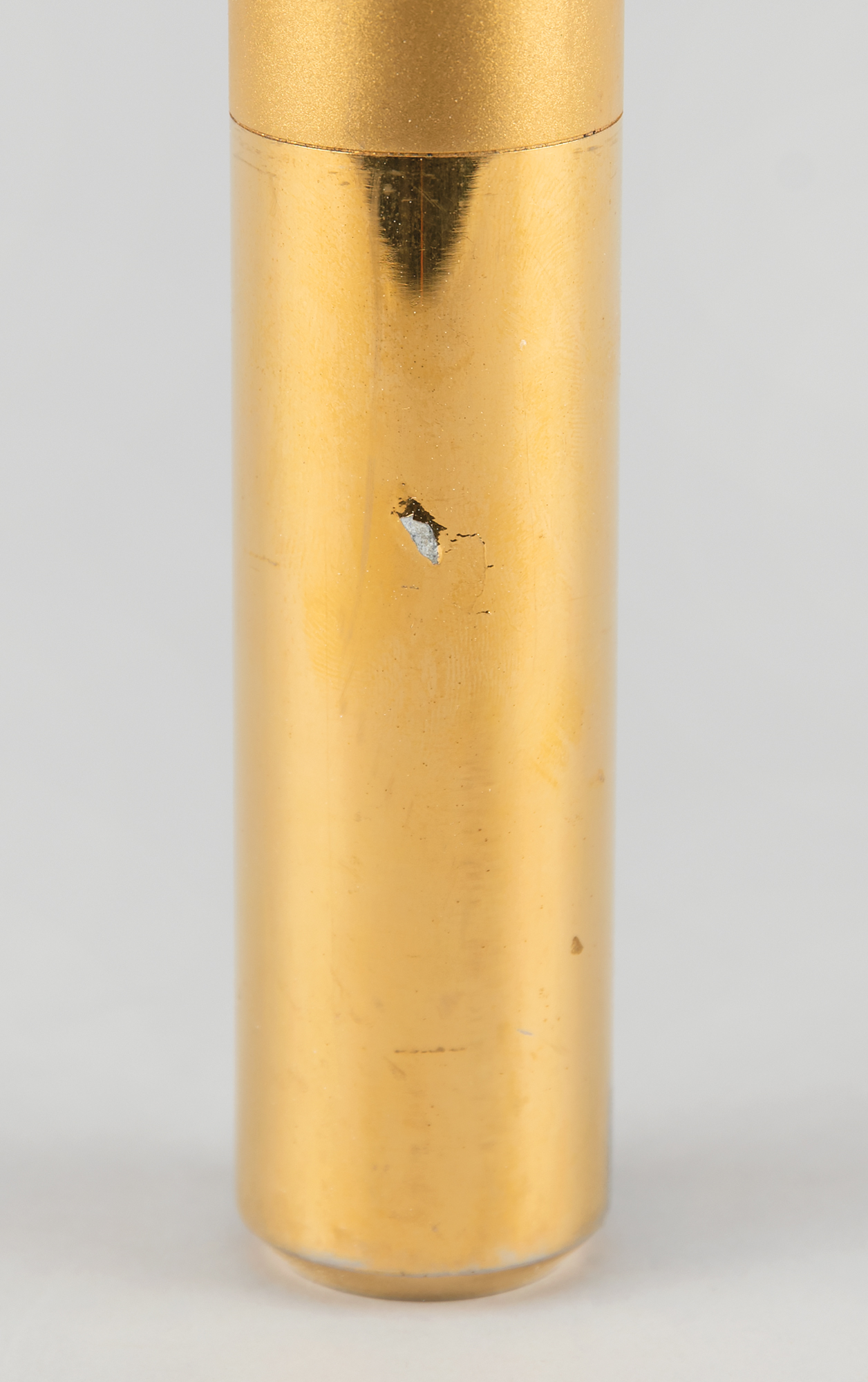 Exceedingly rare golden 1976 Montreal Olympics torch, comprised of gold-plated aluminum, measuring 26″ in length and 3″ at its widest point, designed by Georges Huel and Michel Daillaire. Unlike its official relay-used variant, which featured a red handle, white logo, and a black flame ‘basket,’ this regal presentation example is entirely gilt-coated from top to bottom, with the Montreal Games emblem engraved just above the handle grip section. The torch bears light scattered scuffs, and the lower handle section features wear and two small nicks. This glorious Montreal Olympic torch was made in a very limited quantity – believed to be 20 – and was presented exclusively to high-profile dignitaries who attended the Games of the XXI Olympiad.