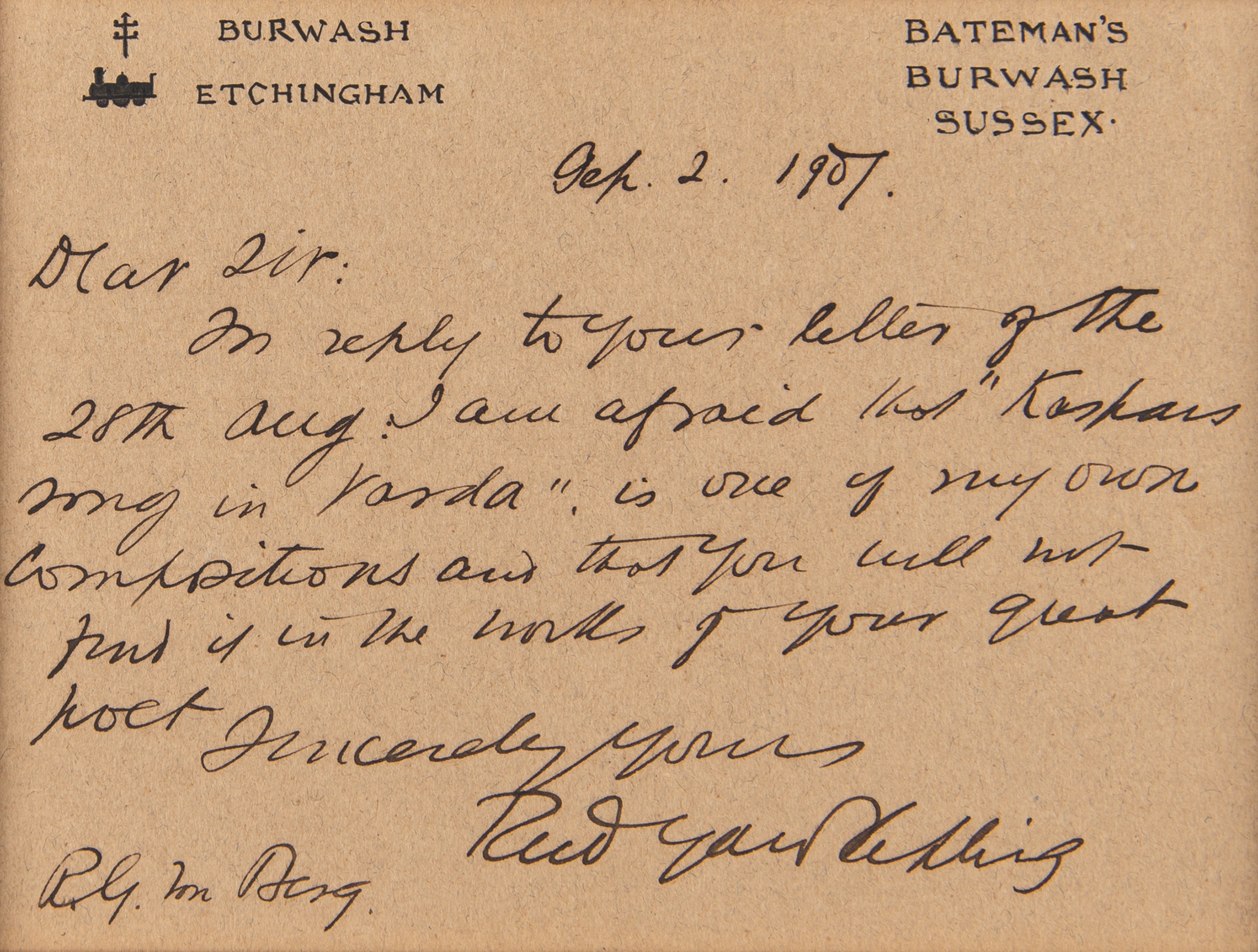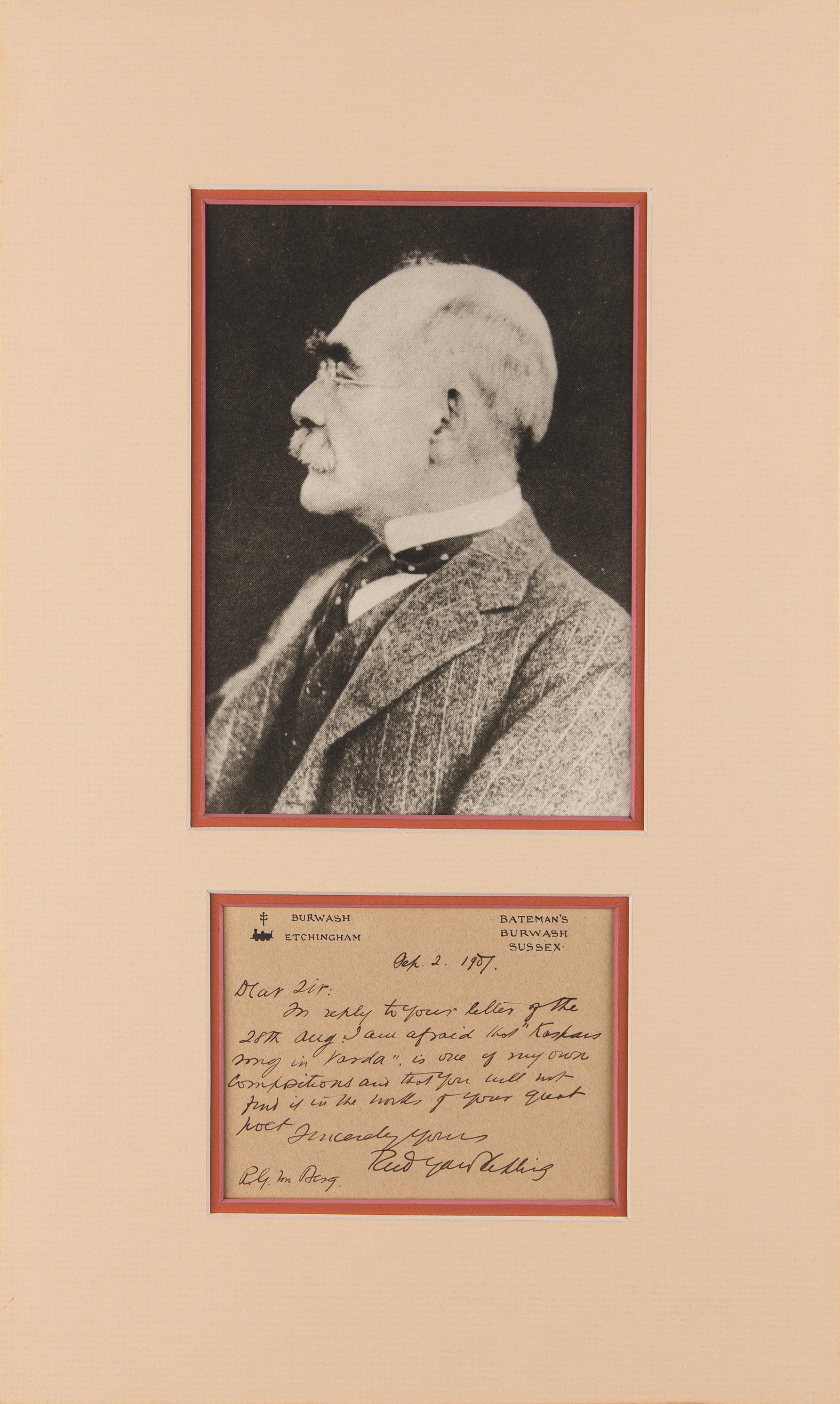ALS, one page, 4.25 x 3.25, Burwash, Etchingham letterhead, September 2, 1907. Handwritten letter to R. G. Von Berg, in full: “In reply to your letter of the 28th Aug. I am afraid that ‘Kaspar's Song In Varda’ is one of my own compositions and that you will not find it in the works of your great poet.” Double-matted with a portrait photo to an overall size of 9.25 x 15.5. In fine condition. Also known as Butterflies, Kaspar's Song in Varda was a sister-poem that accompanied Kipling’s short story ‘Wireless,’ first published in Scribner's Magazine in 1902 and later collected in Traffics and Discoveries. Kipling claimed the poem to have been a translation of an old Swedish poem (from the Swedish of Stagnelius).