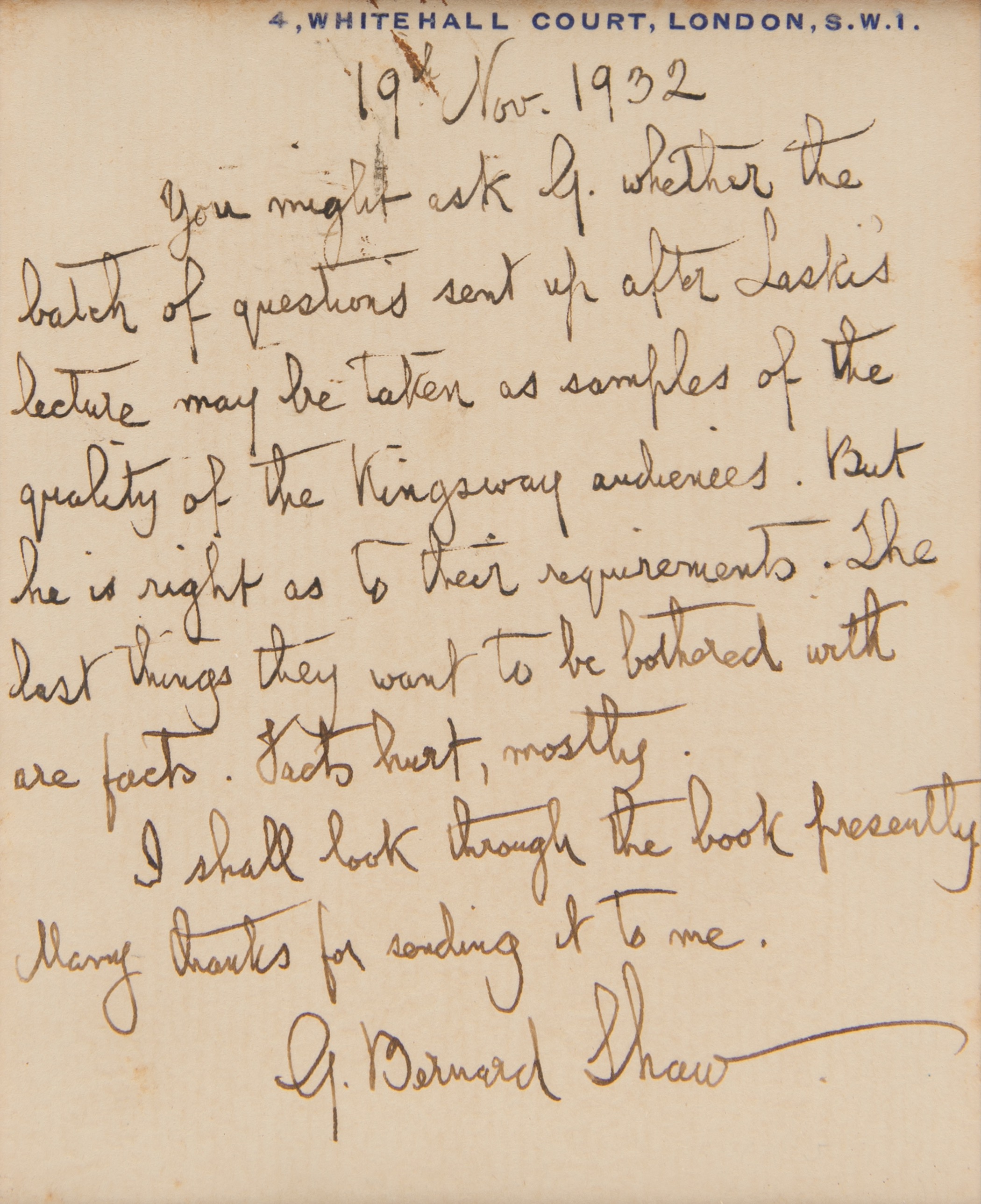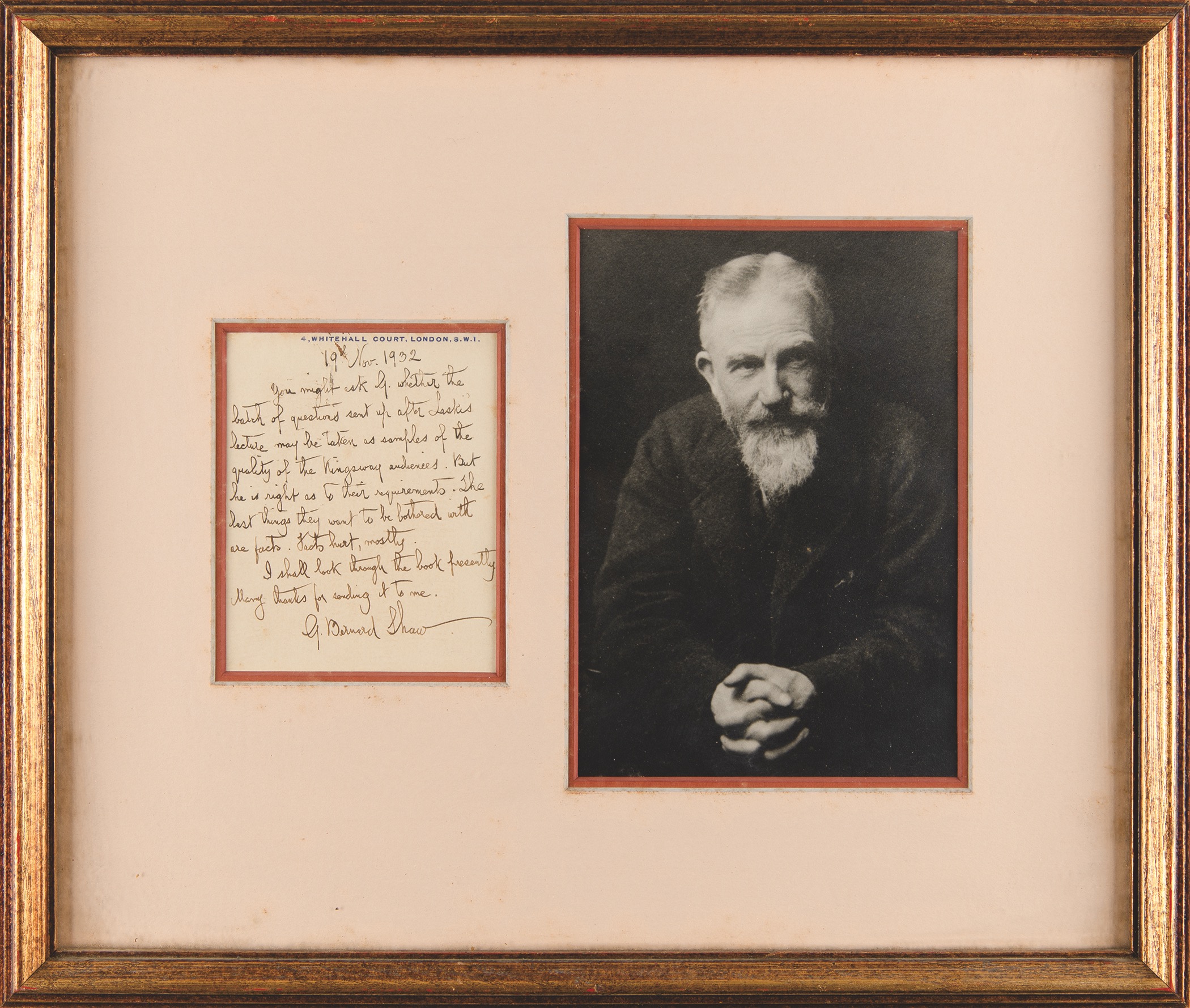 ALS signed “G. Bernard Shaw,” penned on his personal 3.25 x 4.25, 4 Whitehall Court postal card, November 19, 1932. Handwritten letter, in full: “You might ask G. whether the batch of questions sent up after Laske’s lecture may be taken as samples of the quality of the Kingsway audiences. But he is right as to their requirements. The last things they want to be bothered with are facts. Facts hurt, mostly. I shall look through the book presently. Many thanks for sending it to me.” Double-matted and framed with a vintage portrait photo of Shaw to an overall size of 14.5 x 13.5; window to the frame backing reveals the reverse of postcard, which Shaw has addressed in his own hand. In fine condition.