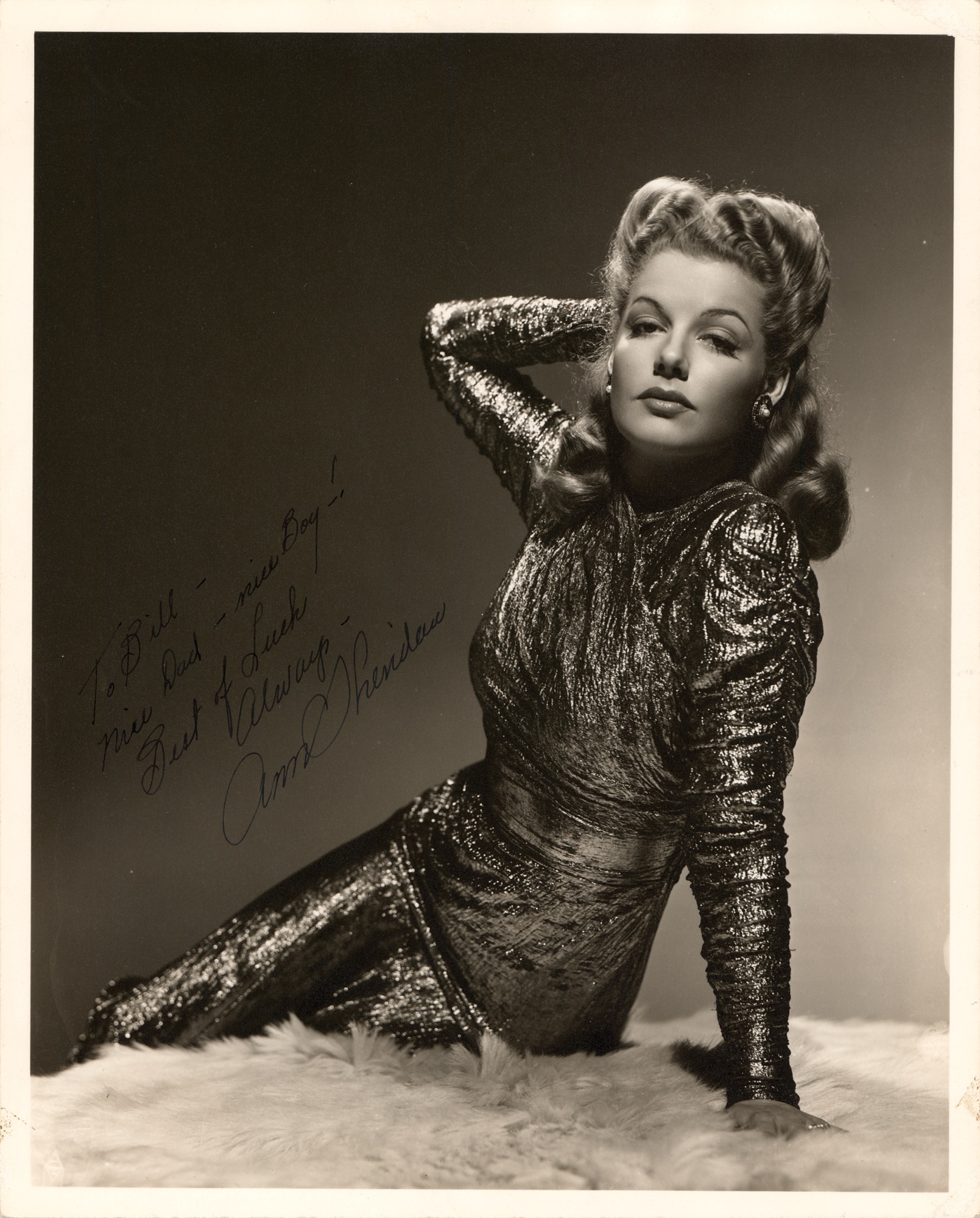 Vintage matte-finish 8 x 10 photo of the actress on a white rug in a shimmering dress, signed and inscribed in fountain pen, "To Bill – nice dad – nice boy – best of luck, always, Ann Sheridon.” Reverse bears a "Photograph by Melbourne" stamp crediting the photo to Melbourne Spurr. In very fine condition, with moderate handwriting contrast.
