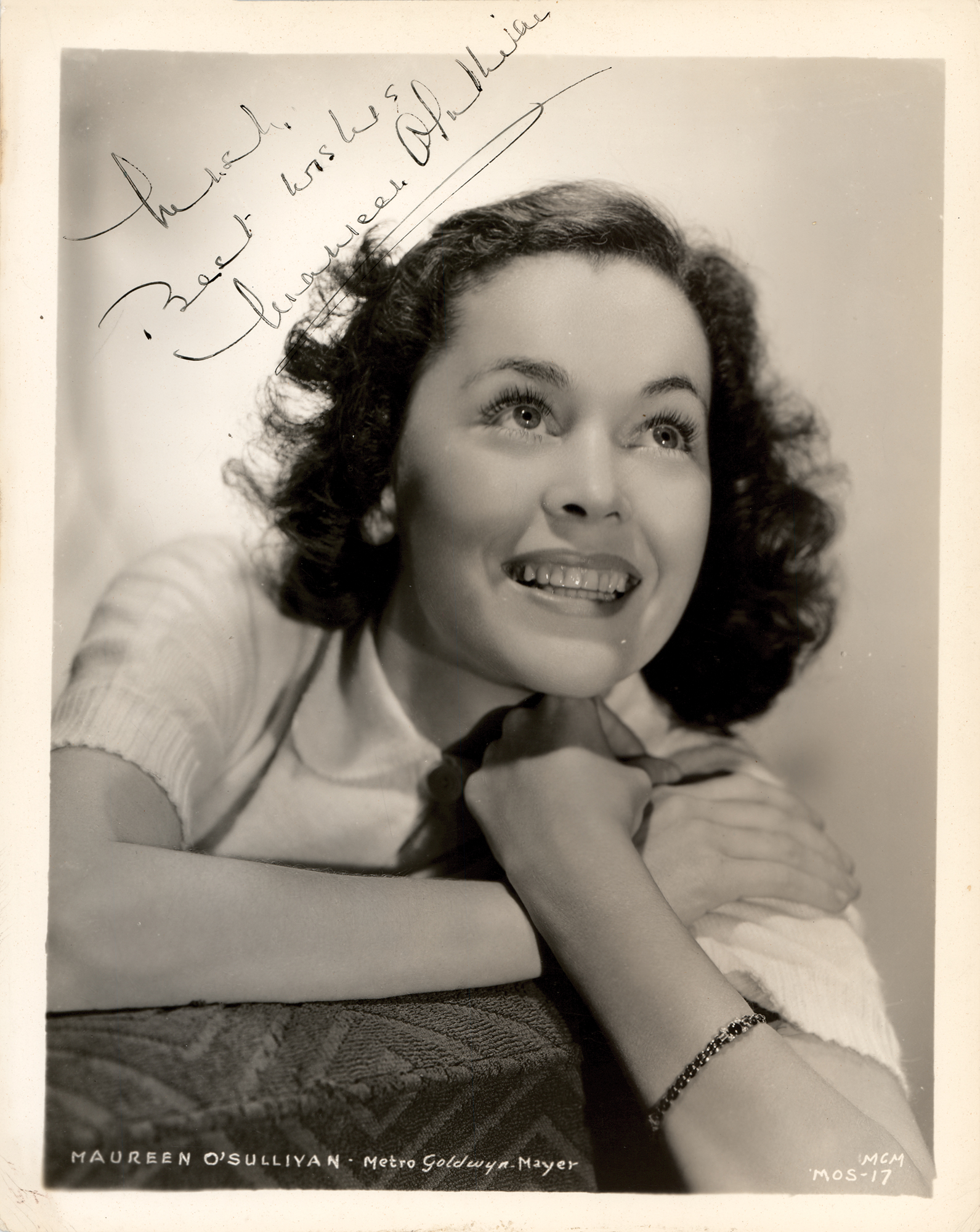 Vintage glossy 8 x 10 MGM publicity photo of the Iris actress smiling in a white shirt, signed and inscribed in fountain pen, "Mush, best wishes, Maureen O'Sullivan.” Reverse bears a notation indicating that the autograph was obtained on August 26, 1937. In very good to fine condition, with scattered small creases.