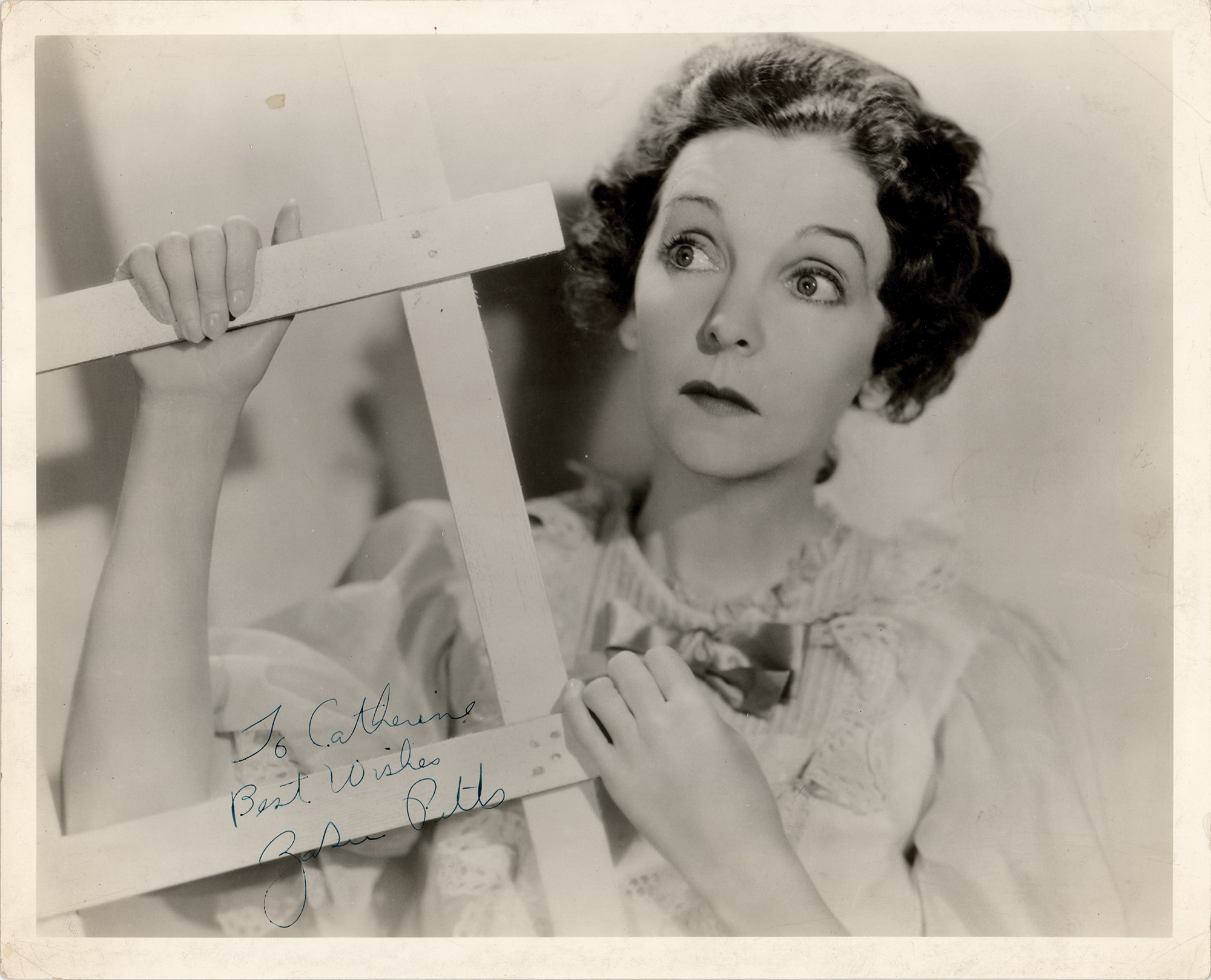 Glossy 10 x 8 photo of Pitts in a frilly white outfit, signed and inscribed in fountain pen, "To Catherine, best wishes, ZaSu Pitts.” In very good to fine condition, with scattered light creasing.