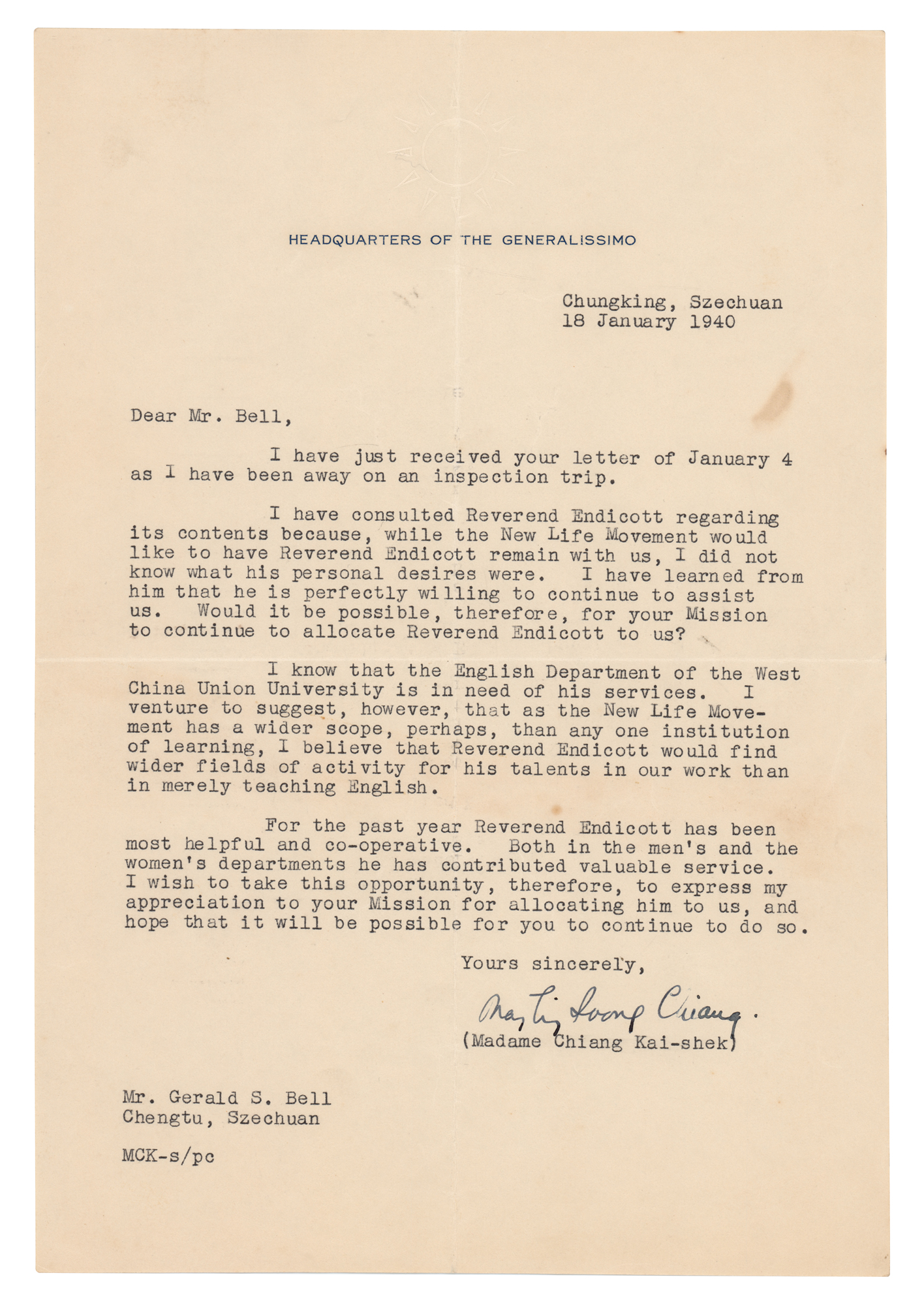 World War II-dated TLS signed “Mayling Soong Chiang,” one page, 7.5 x 10.75, Headquarters of the Generalissimo letterhead, January 18, 1940. Addressed from Chungking, Szechwan, a letter to Rev. George S. Bell, a Canadian missionary in China, in full: “I have just received your letter of January 4 as I have been away on an inspection trip. I have consulted Reverend Endicott regarding its contents because, while the New Life Movement would like to have Reverend Endicott remain with us, I did not know what his personal desires were. I have learned from him that he is perfectly willing to continue to assist us. Would it be possible, therefore, for your Mission to continue to allocate Reverend Endicott to us?