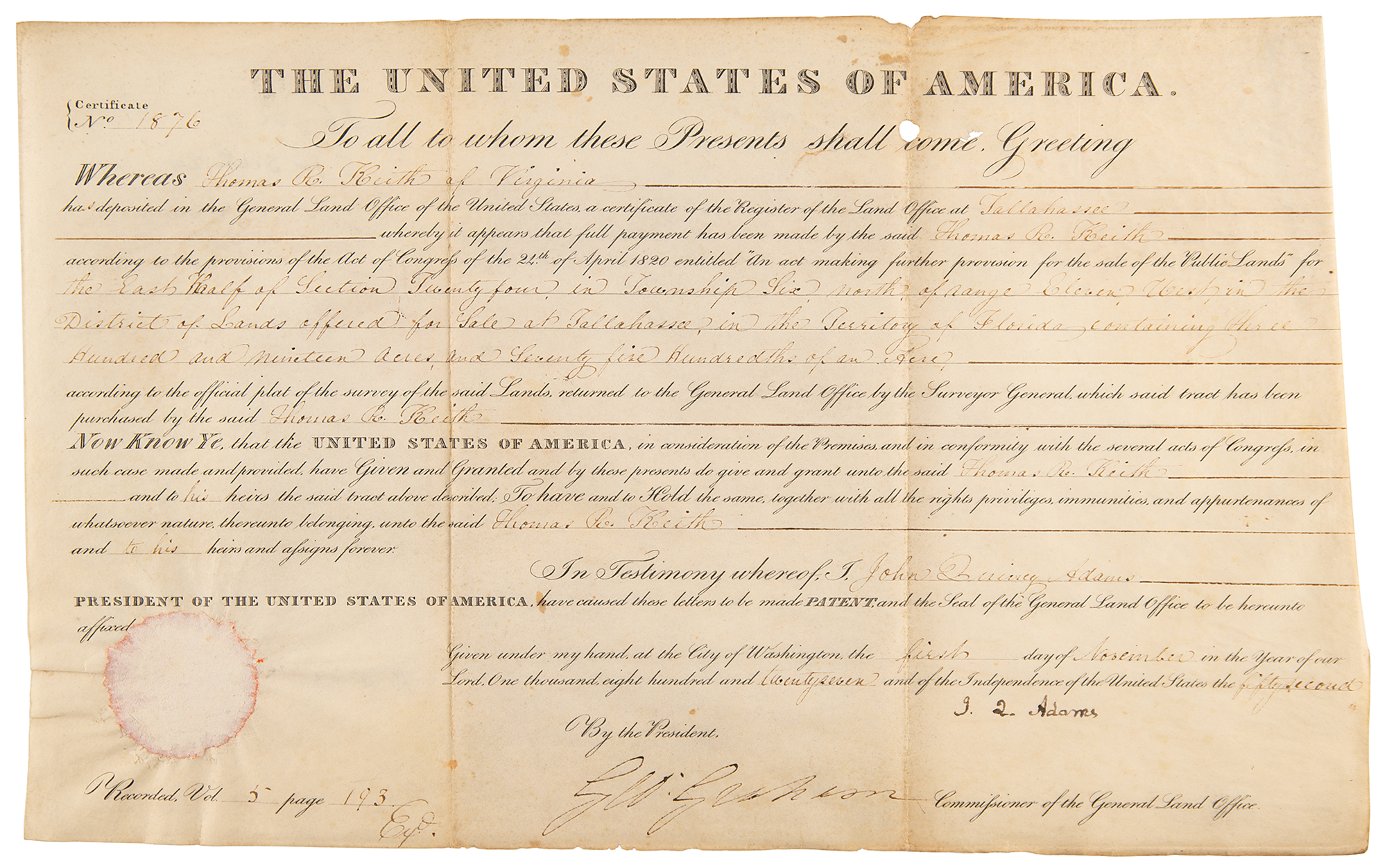 Partly-printed vellum DS as president, signed “J. Q. Adams,” one page, 15.75 x 9.75, November 1, 1827. President Adams grants to “Thomas R. Keith of Virginia” a parcel of land "offered for sale at Tallahassee, in the Territory of Florida, containing three hundred and nineteen acres and seventy five hundredths of an acre." Signed at the conclusion by John Quincy Adams and countersigned by Commissioner of the General Land Office George Graham. In fine condition, with two small holes at the top, affecting none of the text, and the original seal no longer present.