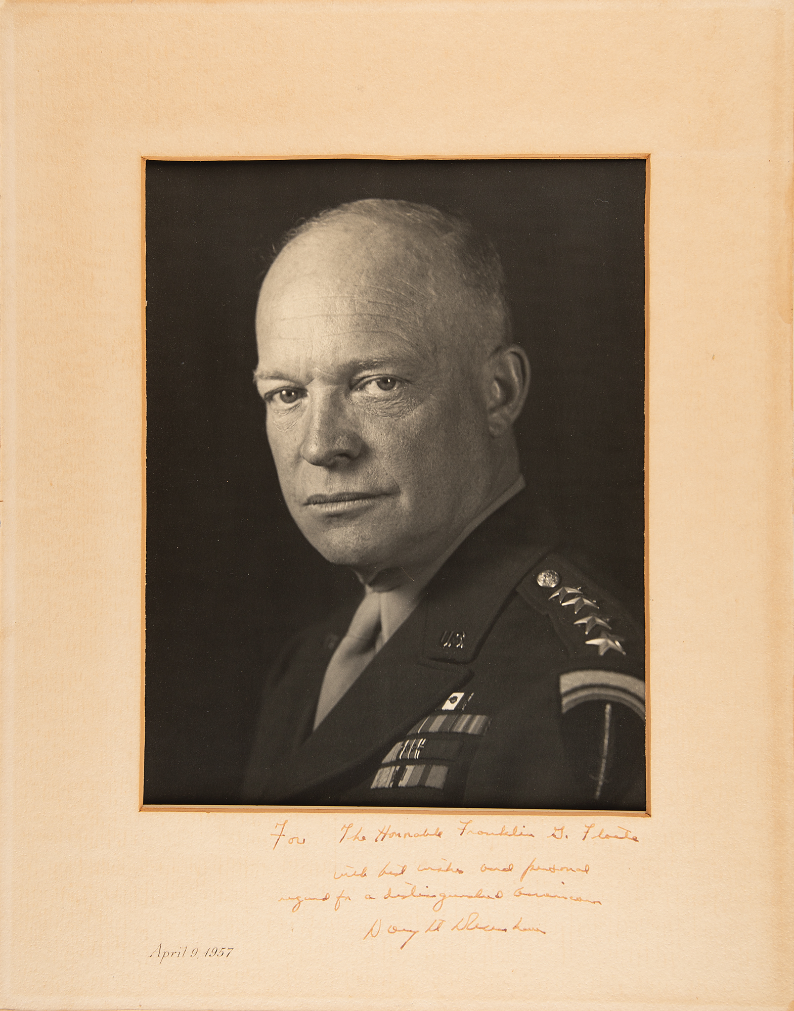 Magnificent vintage matte-finish 10 x 13 portrait photo of Eisenhower wearing his ‘four-star’ military uniform in a bust-length pose, matted to an overall size of 15.75 x 20, signed and inscribed on the mat in black ink, "For The Honorable Franklin G. Floete, with best wishes and personal regard for a distinguished American, Dwight D. Eisenhower.” The mat bears a printed date of April 9, 1957, which indicates that this photo was signed by Eisenhower as president. In fine condition, with light toning to the mat from prior display. Franklin G. Floete was an American businessman (1887–1973) who served as the Assistant Secretary of Defense for Properties and Installations from 1953 to 1956 and as Administrator of the General Services Administration from 1956 to 1961.