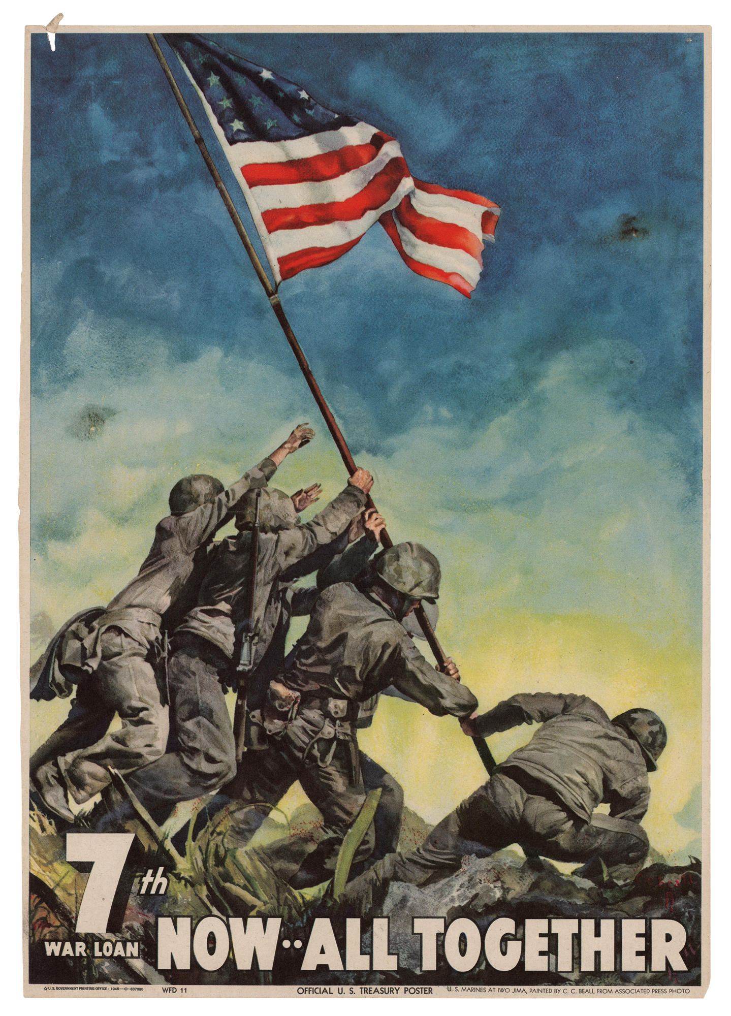 Iconic original color 9 x 12.75 World War II poster distributed by the U.S. Treasury in 1945, showing the classic image of the Iwo Jima flag raising, with "7th War Loan Now…All Together," in white text below the image. Printed at the bottom is "U.S. Government Printing Office: 1945-O-637980." In fine condition, with an unobtrusive central horizontal fold, and tack holes to the top corners. A beautiful, vibrant example of one of the most recognizable images in American history.
