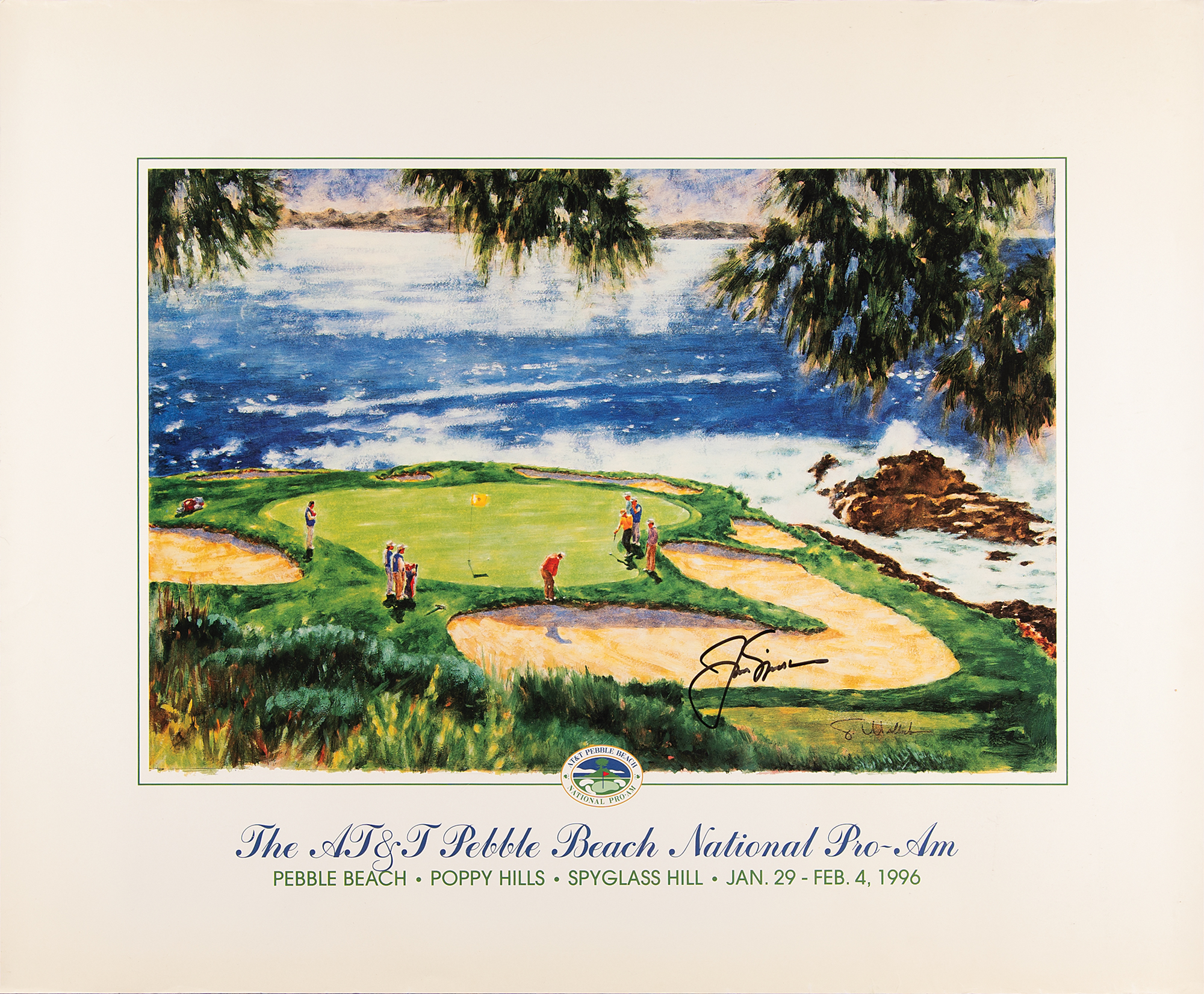 Color 25.5 x 21 poster for the AT&T Pebble Beach Pro-Am scheduled for January 29 to February 4, 1996, featuring an attractive painting of the course’s famous coastline 18th hole, signed nicely in black felt tip by Jack Nicklaus. Rolled and in fine condition, with some scattered small creases, and a tiny tear to the bottom edge. Originally obtained by in-person specialist Mike Wehrmann.