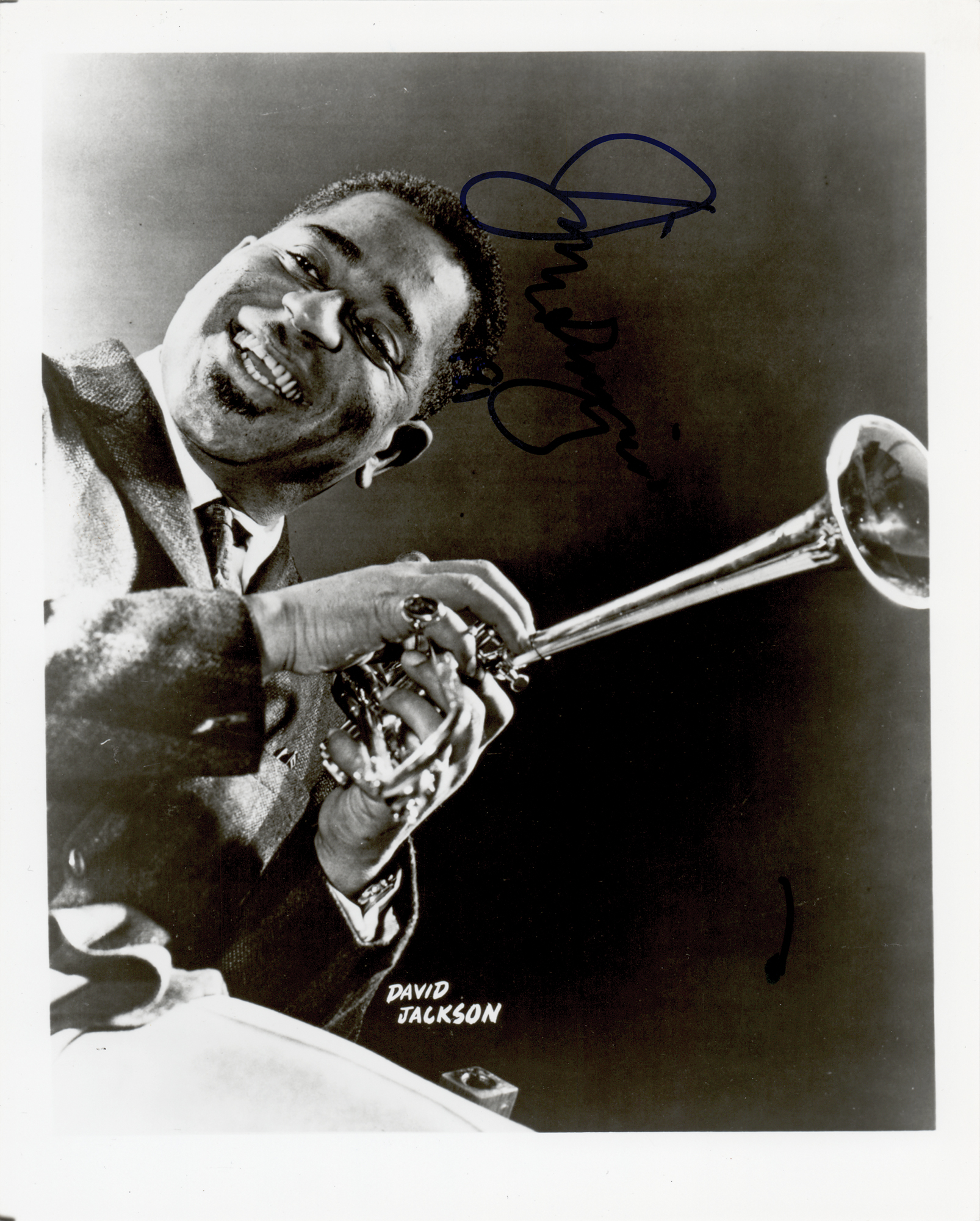 Glossy 8 x 10 David Jackson photo of a jubilant Gillespie holding his trumpet, signed in blue felt tip, "Dizzy Gillespie, '91.” In very fine condition, with a stray ink mark in the lower background area. Originally obtained by in-person specialist Mike Wehrmann.