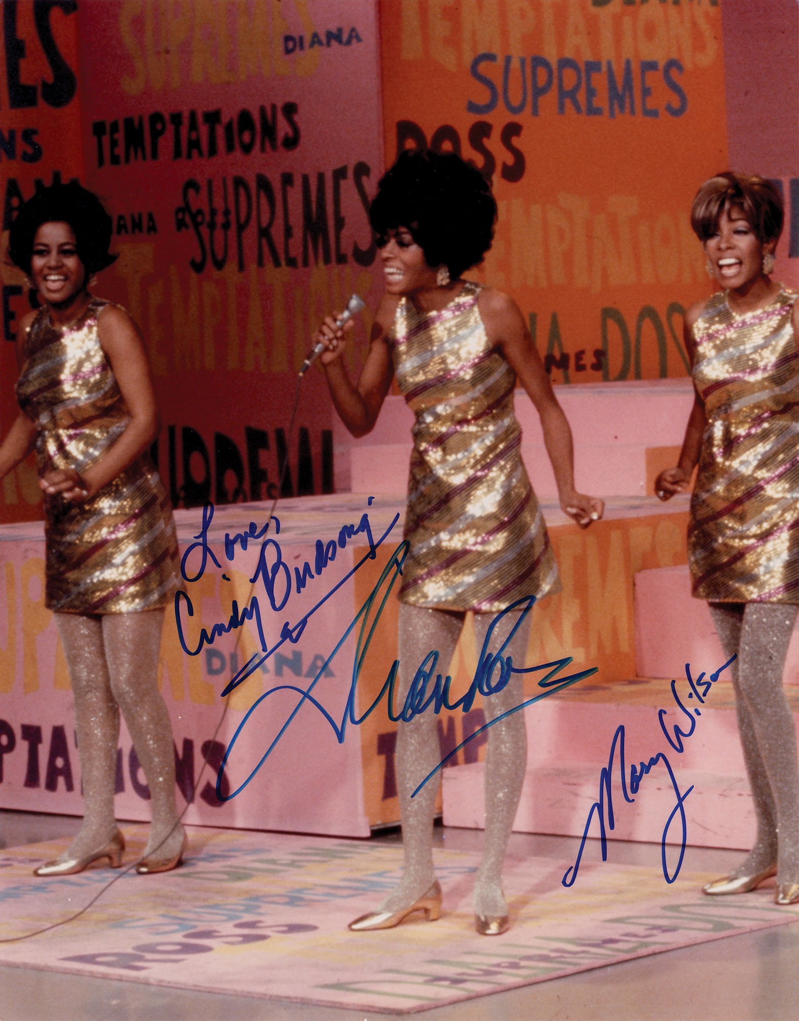 Color satin-finish 11 x 14 photo of legendary Motown group The Supremes performing, signed by each member in blue felt tip, "Love, Cindy Birdsong," "Diana Ross," and "Mary Wilson.” In fine condition. Originally obtained by in-person specialist Mike Wehrmann.