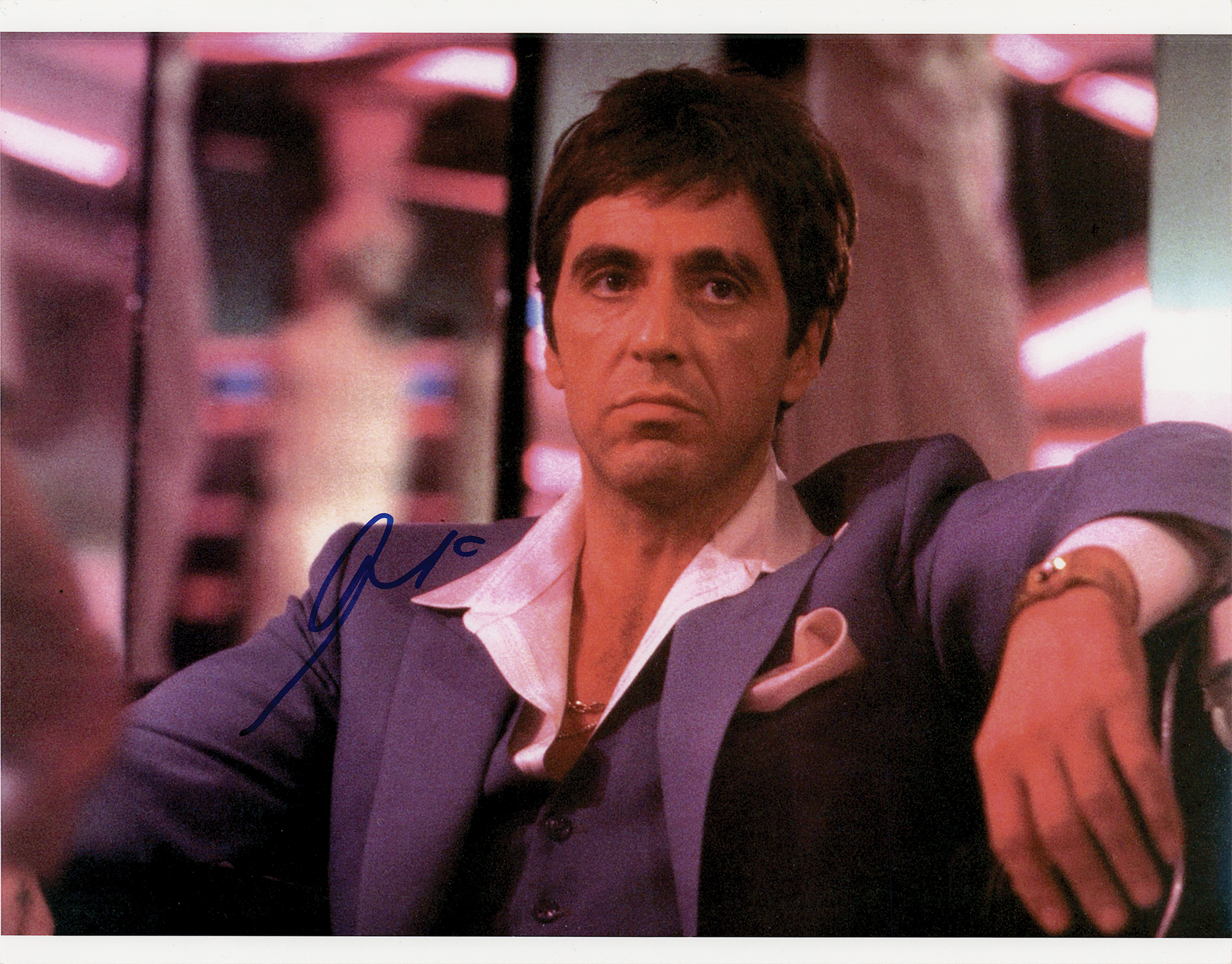 Color satin-finish 14 x 11 photo of Al Pacino as Tony Montana in the 1983 film Scarface, signed in blue felt tip. In fine condition. Originally obtained by in-person specialist Mike Wehrmann.