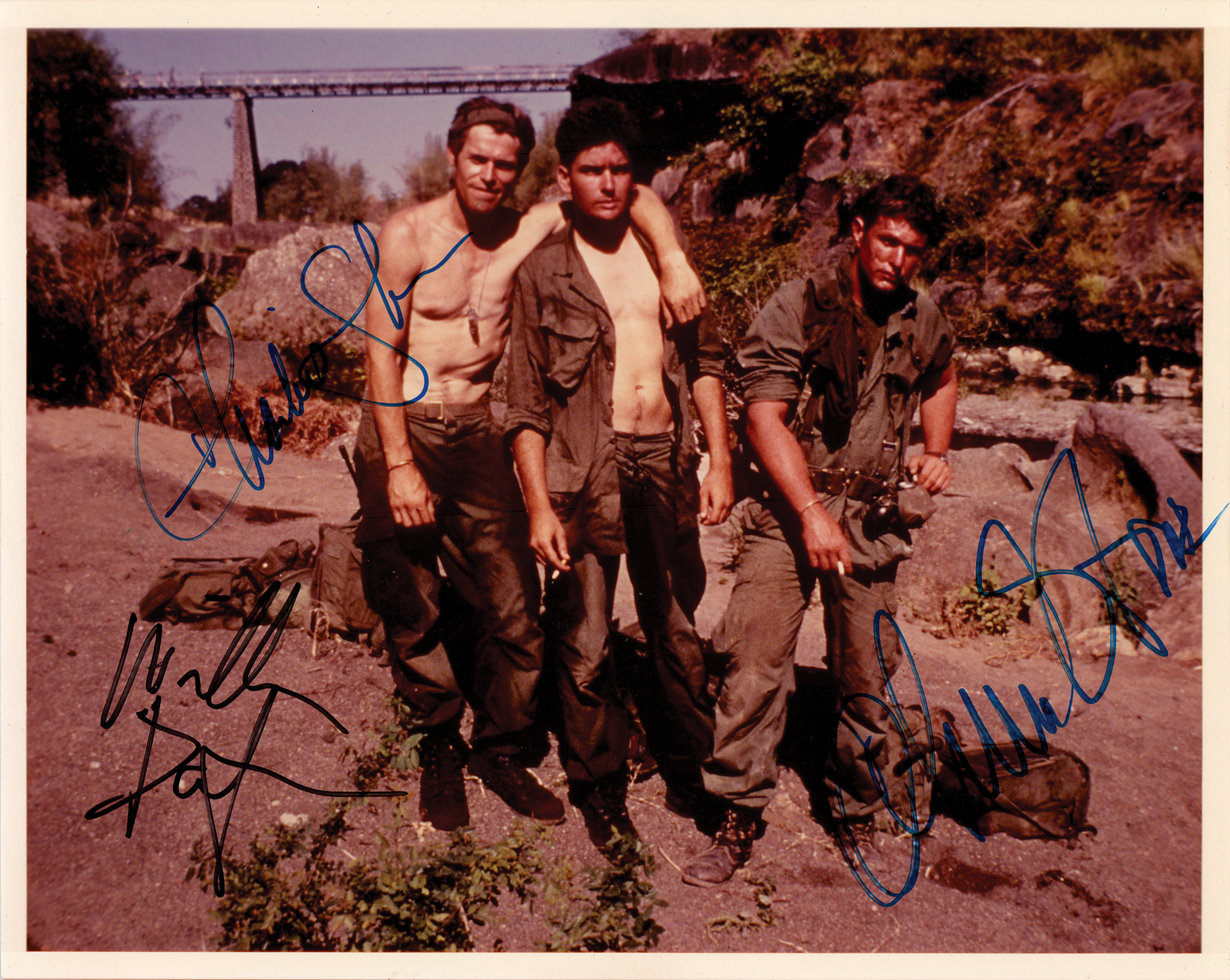 Color glossy 10 x 8 photo of Chris, Sergeant Elias, and Sergeant Barnes in the 1986 war film Platoon, signed in black felt tip by Willem Dafoe and blue felt tip by Charlie Sheen and director Oliver Stone. In very fine condition.