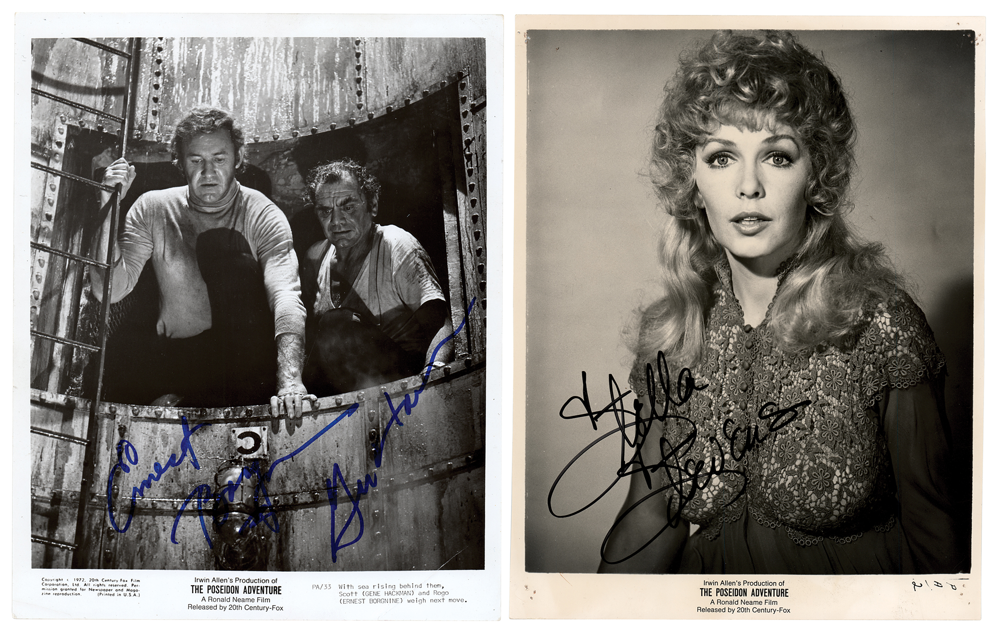 Two photos signed by stars of the The Poseidon Adventure: a glossy 8 x 10 20th Century-Fox publicity photo of Frank Scott and Mike Rogo, signed in blue felt tip by Gene Hackman and Ernest Borgnine; and a glossy 7.75 x 10 20th Century-Fox publicity photo of Linda Rogo, signed in black felt tip by Stella Stevens. In very good to fine condition, with tack holes to the corners of the Stevens photo.