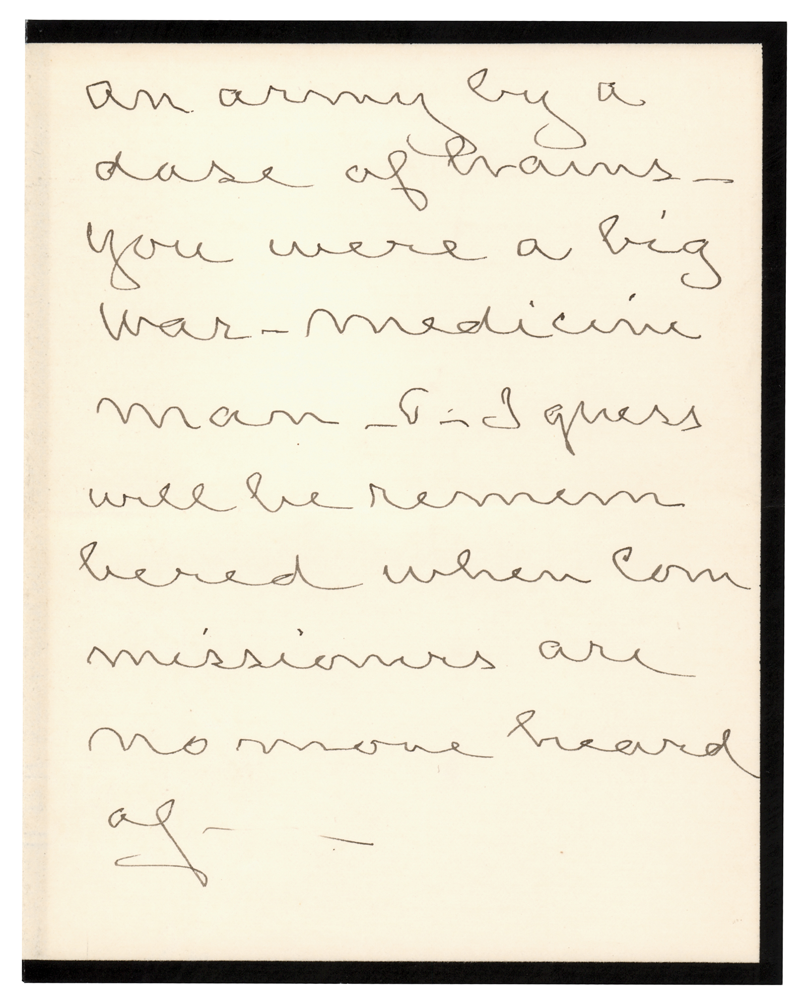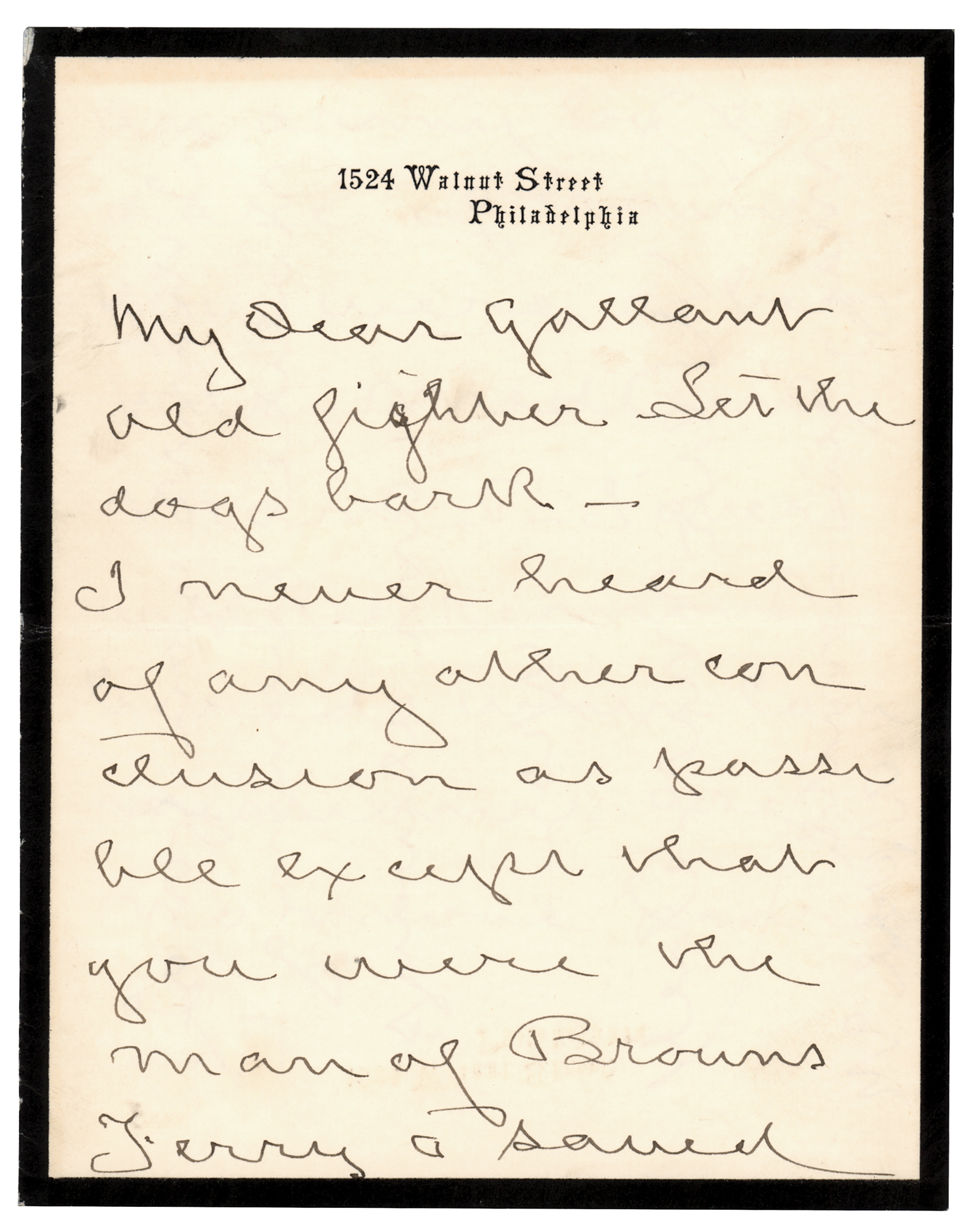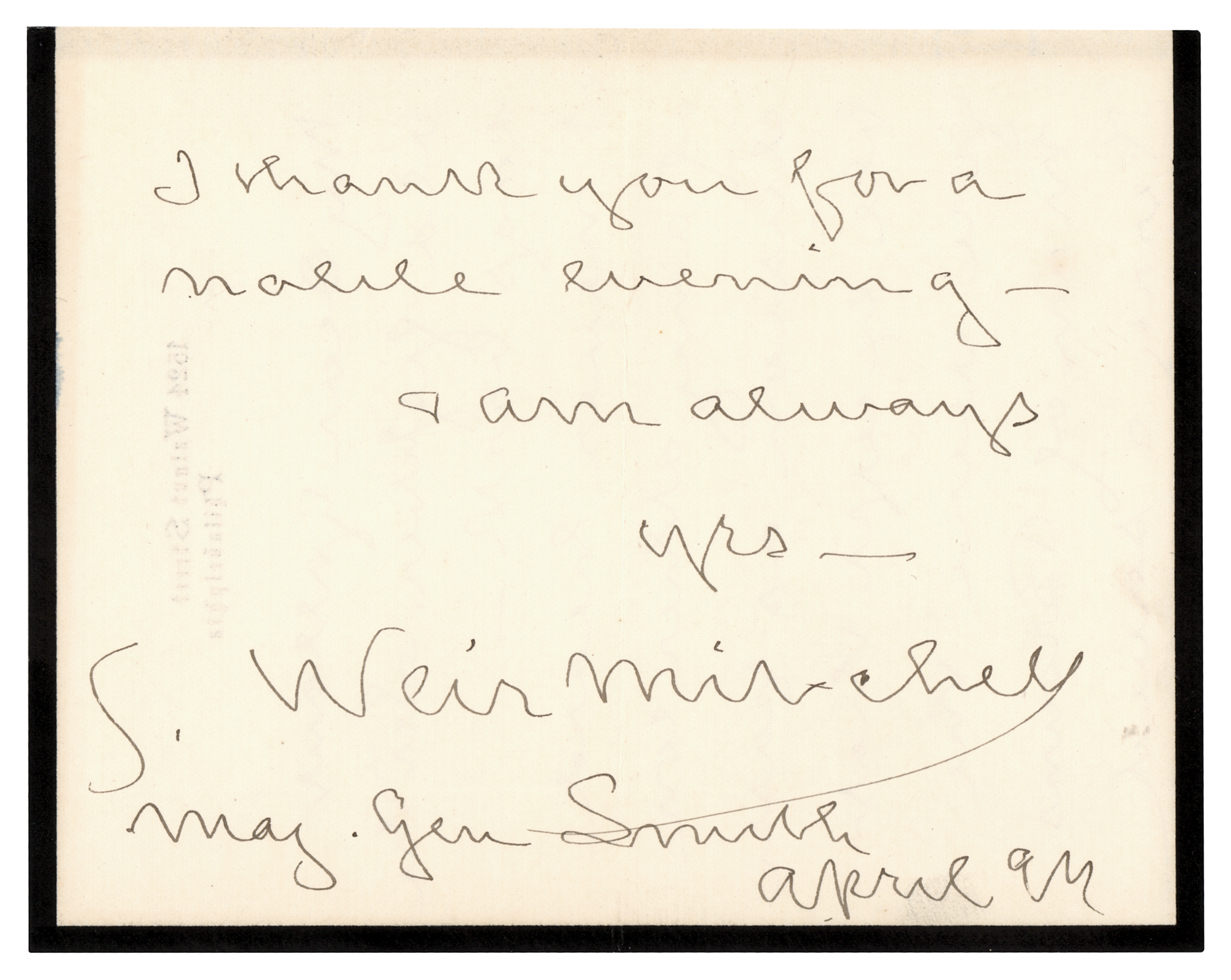 Physician and writer (1829–1914) considered to be the 'father of medical neurology,' known for his discovery of causalgia. ALS signed “S. Weir Mitchell,” three pages on two adjoining sheets, 5 x 6.25, personal letterhead, April 1894. Handwritten letter to Gen. William Farrar 'Baldy' Smith, addressing him as "My dear gallant old fighter." In part: "I never heard of any other conclusion as passable except that you were the man of Brown's Ferry…You were a big war-medicine man—& I guess will be remembered when commissioners are no more heard of." In fine condition. Accompanied by the original sales folder from early 20th century antiquarian bookseller Ernest Dressel North.