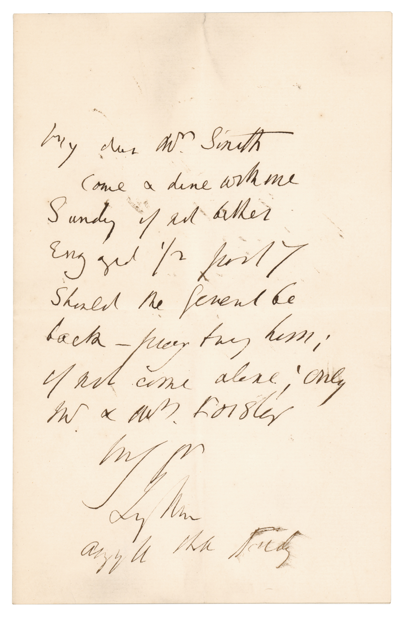 English politician, poet, playwright, and prolific novelist (1803-1873) remembered for coining such phrases as 'pursuit of the almighty dollar,' 'the pen is mightier than the sword,' and 'it was a dark and stormy night.' ALS signed “Lytton,” one page, 4.5 x 7, no date. Handwritten letter to the wife of Gen. William Farrar 'Baldy' Smith, in part: "Come & dine with me Sunday if not better engaged." In fine condition. Accompanied by the original sales folder from early 20th century antiquarian bookseller Ernest Dressel North.