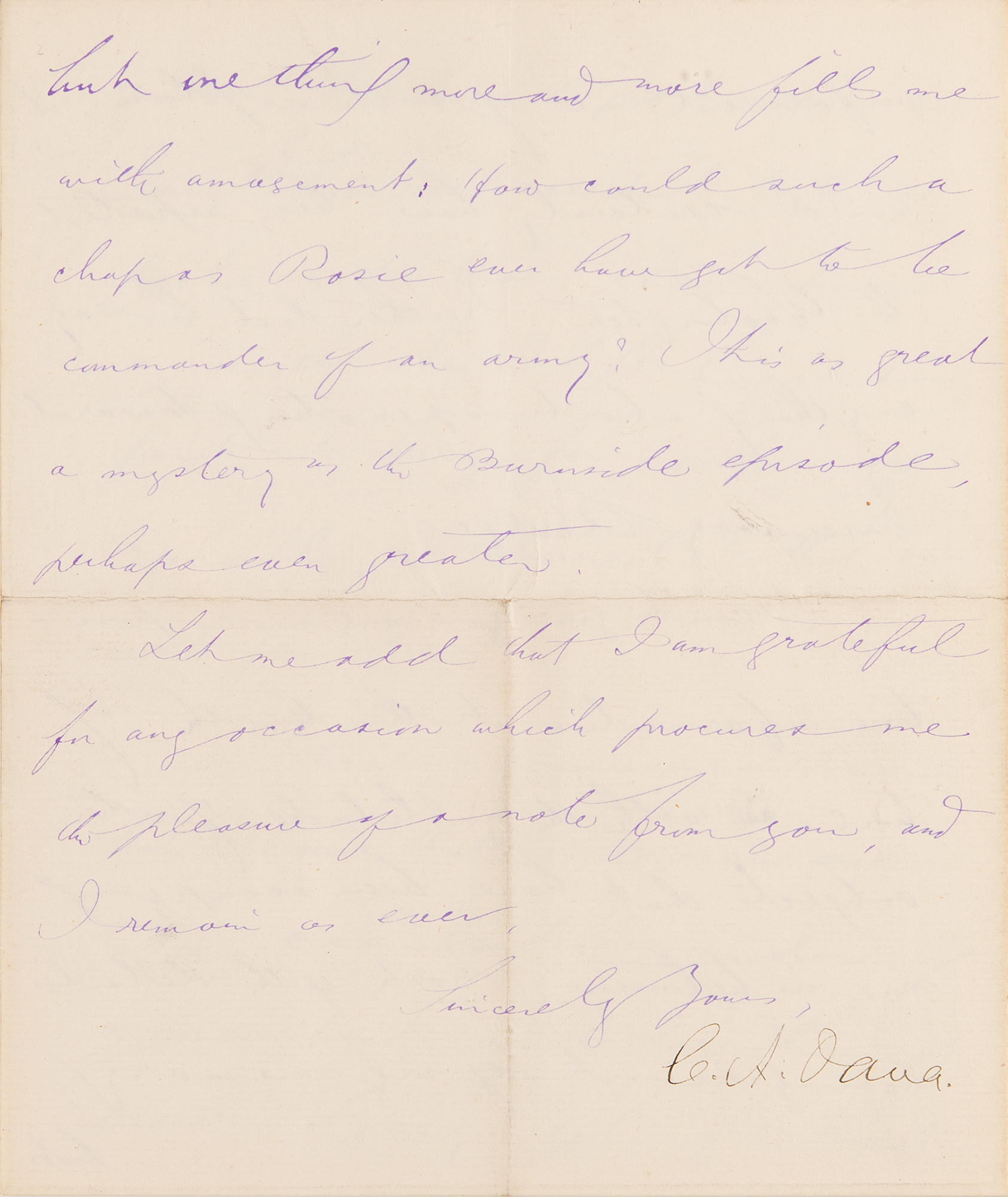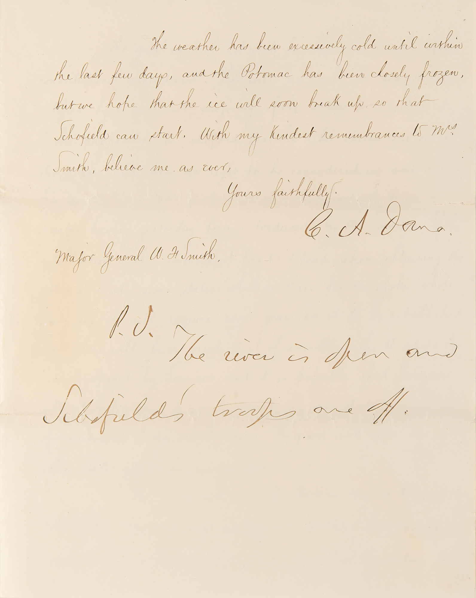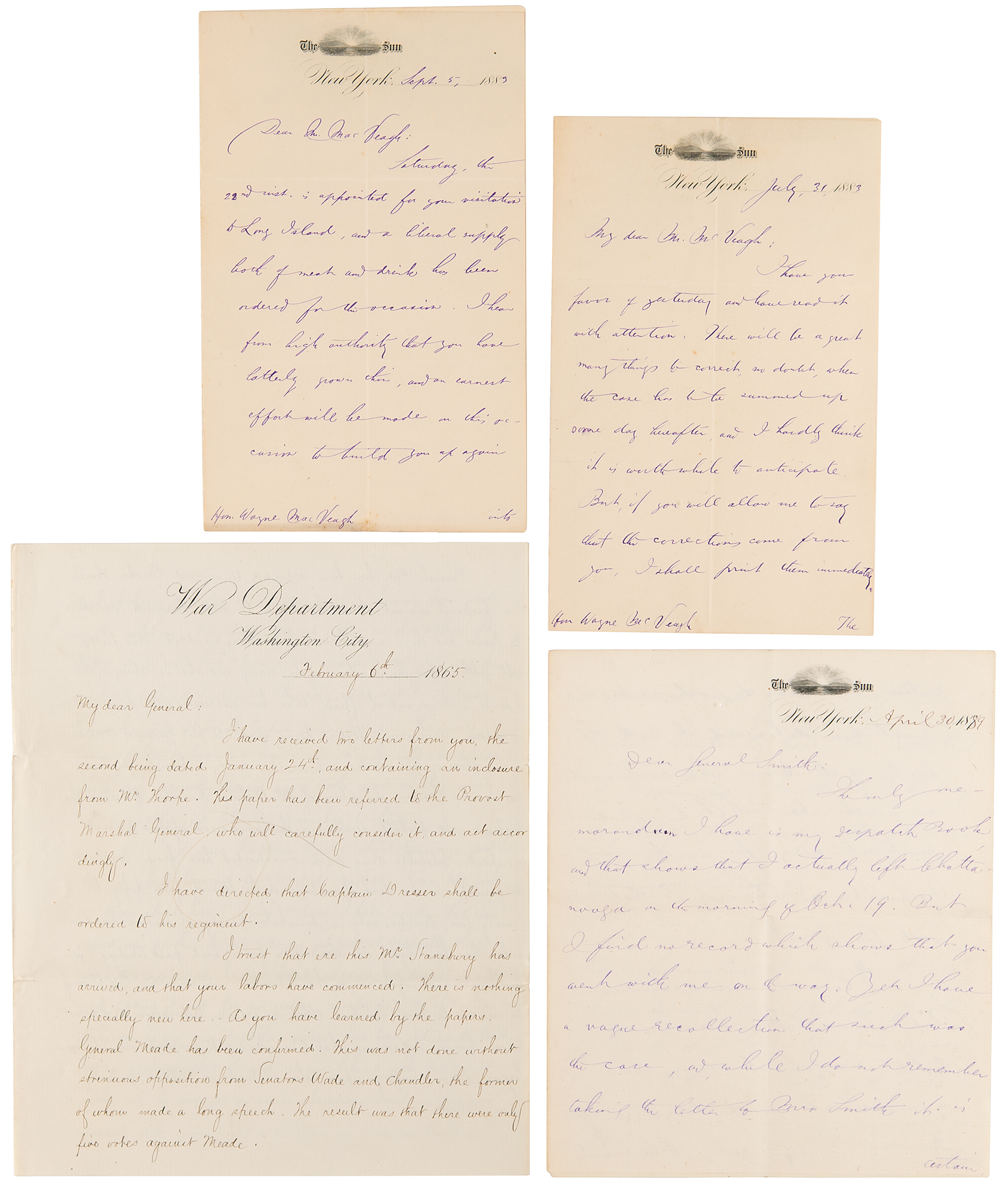 Journalist (1819-1897) best known for his support of Grant during the Civil War and his aggressive postwar political advocacy through the New York Sun newspaper. Four LSs, signed "C. A. Dana," totaling 14 pages on sets of adjoining sheets, ranging in size from 5 x 8 to 8 x 10, dated from 1865 to 1889. Includes two letters to "General [William F. 'Baldy'] Smith" and two letters to "Mr. MacVeagh." The highlight is a lengthy letter on War Department letterhead, February 6, 1865, with commentary on the makeup of President Lincoln's cabinet, the passage of the 13th Amendment (abolishing slavery in the United States), and the 'Hampton Roads Conference,' in which Confederate commissioners met with Lincoln in an effort to negotiate an end to the Civil War.