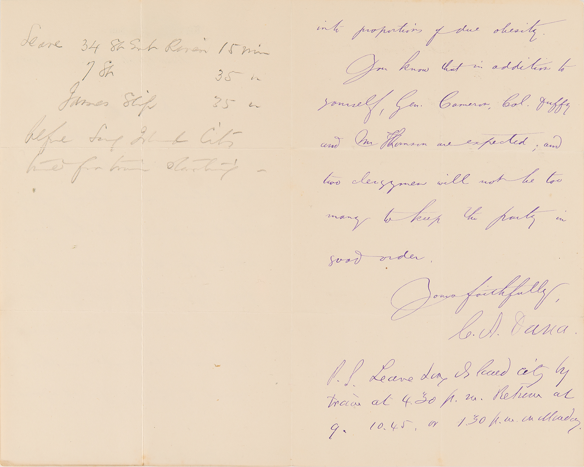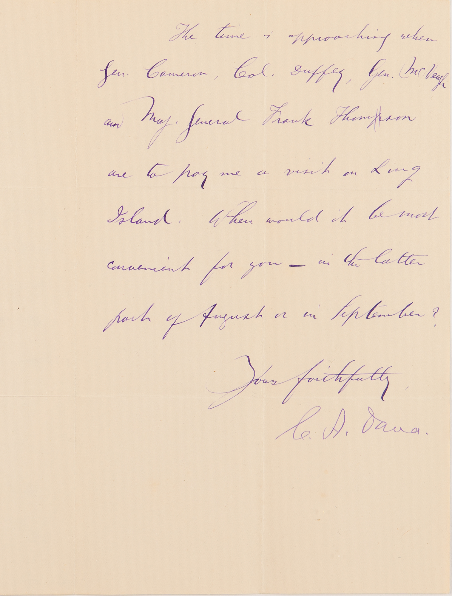 Major Eckert, who was sent down previous to the interview to meet the rebel commissioners, and who saw a great deal of them, describes their appearance as having been seedy in the extreme. They were dressed either in threadbare old clothes, or in new homespun of the coarsest material, and the most uncivilized fashion. The only good article of dress they wore was shoes of English manufacture. They were considerably embarrassed and confused. The only hospitality which they especially desired was a little good whiskey, which was promptly and liberally furnished to them." In the other letters, Dana arranges visits and comments on some recollections of the Civil War. In fine condition. Accompanied by the original sales folder from early 20th century antiquarian bookseller Ernest Dressel North.