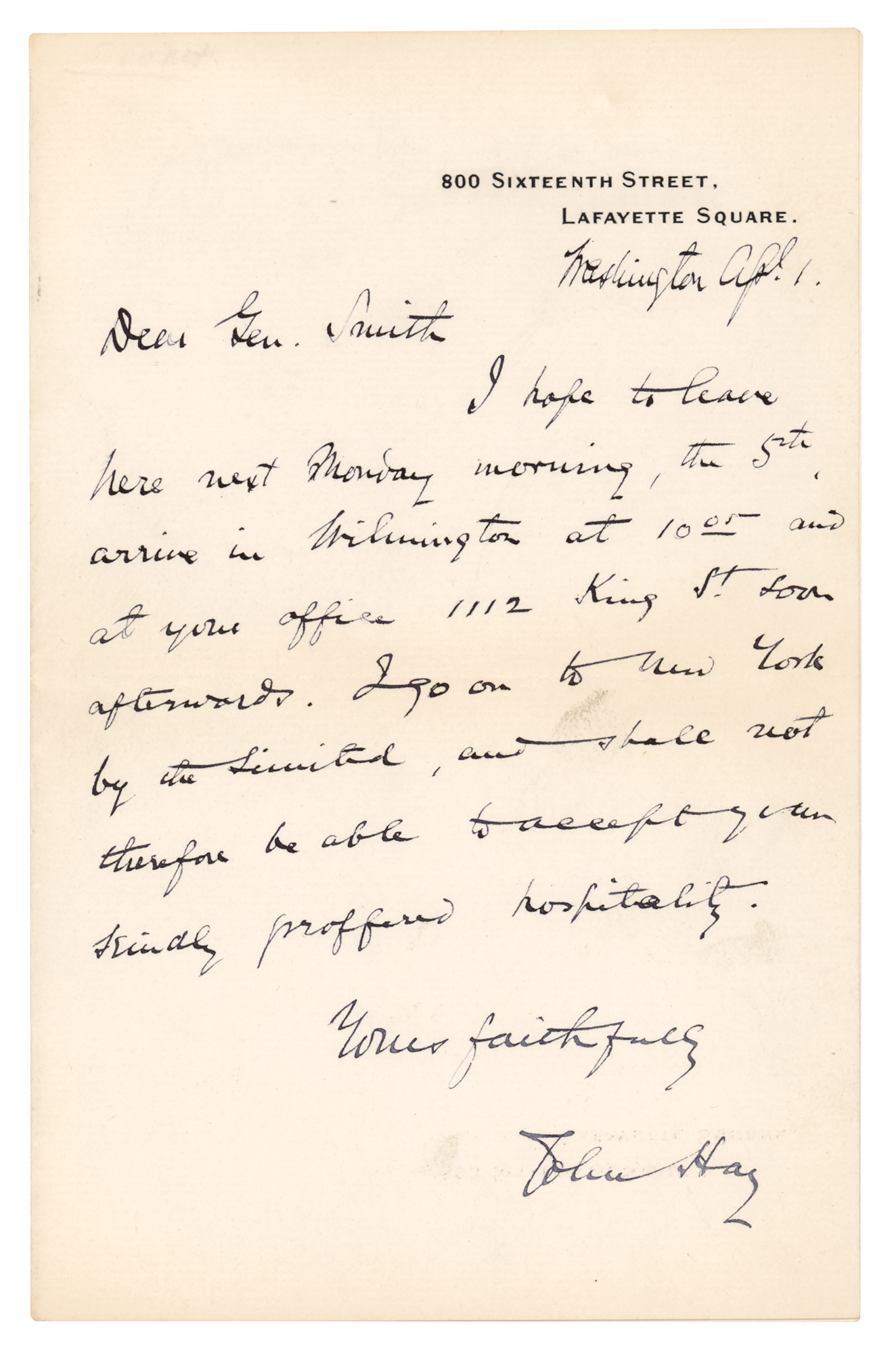 Private secretary (1838–1905) to and, later, biographer of Abraham Lincoln who also served as secretary of state under McKinley and Roosevelt. ALS, one page, 4.5 x 7, personal letterhead, April 1. Handwritten letter to Gen. William Farrar 'Baldy' Smith, in part: "I hope to leave here next Monday morning, the 5th, arrive in Wilmington at 10:05 and at your office 1112 King St. soon afterwards. I go on to New York…and shall not therefore be able to accept your kindly proffered hospitality." In fine condition. Accompanied by the original sales folder from early 20th century antiquarian bookseller Ernest Dressel North.