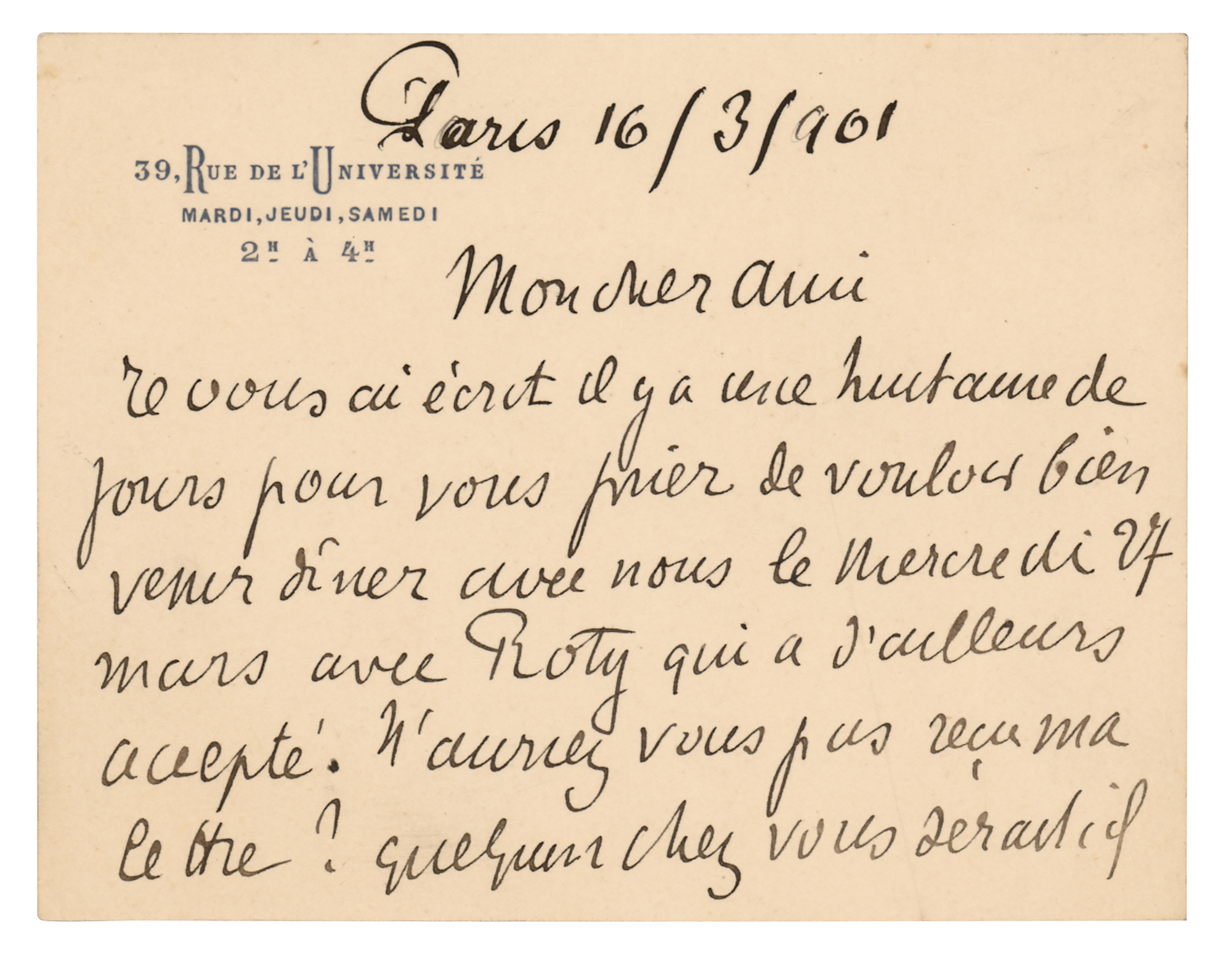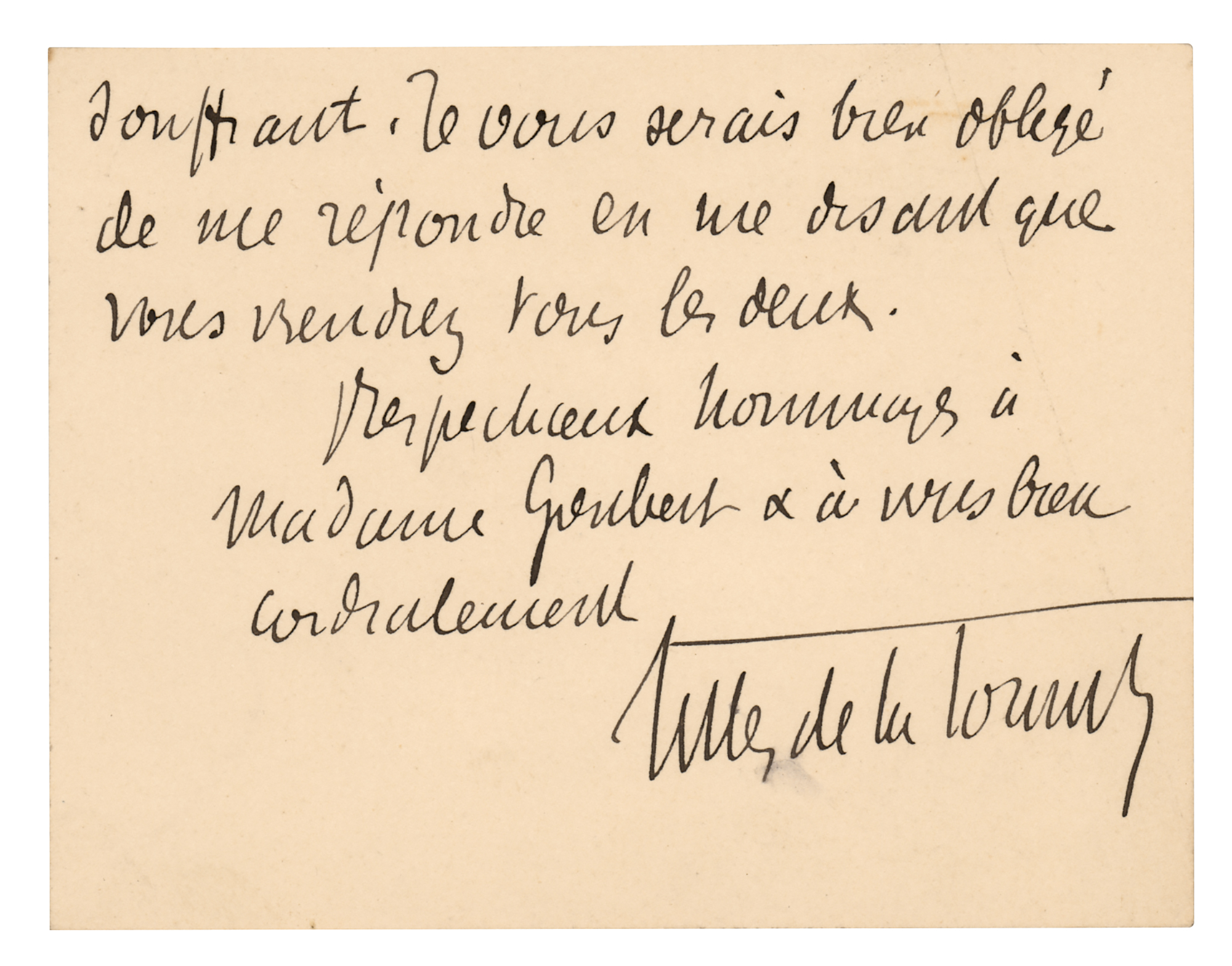 French neurologist (1857–1904) best known as the namesake of Tourette syndrome, a neurological condition characterized by tics; his main contributions in medicine were in the fields of hypnosis and hysteria. ALS in French, signed “Gilles de la Tourette,” one page on two adjoining sheets, 4.5 x 3.5, personal letterhead, March 16, 1901. Untranslated handwritten letter by the notable French neurologist. In fine condition. A very rare autograph of an important scientist, whose name continues to be frequently referenced in popular culture and in medical literature to this day.
