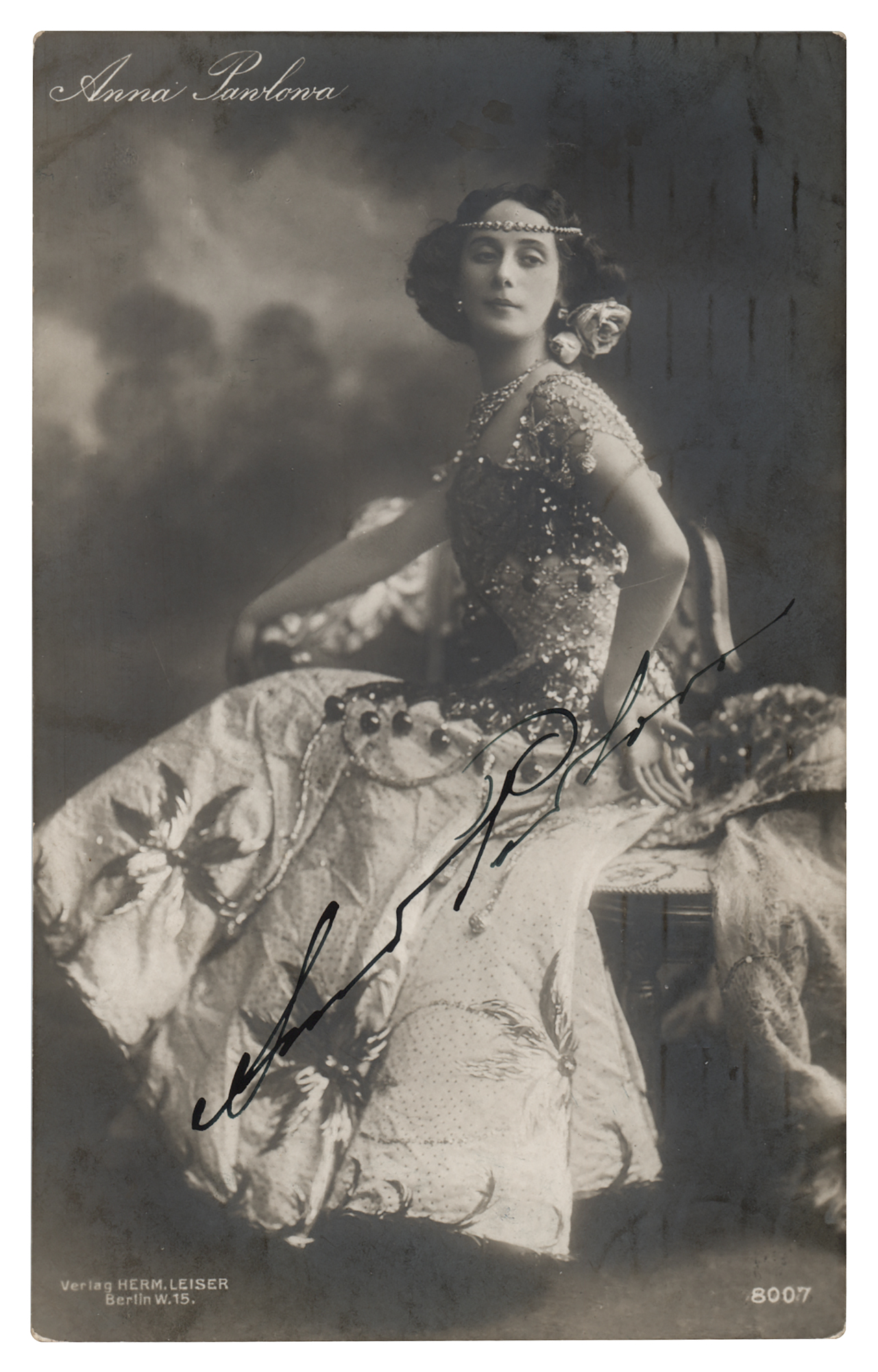 Attractive vintage matte-finish 3.25 x 5.25 postcard photo of the ballerina in exotic costume, boldly signed in fountain pen, "Anna Pavlova." In fine condition, with light postal impressions to the upper right corner.