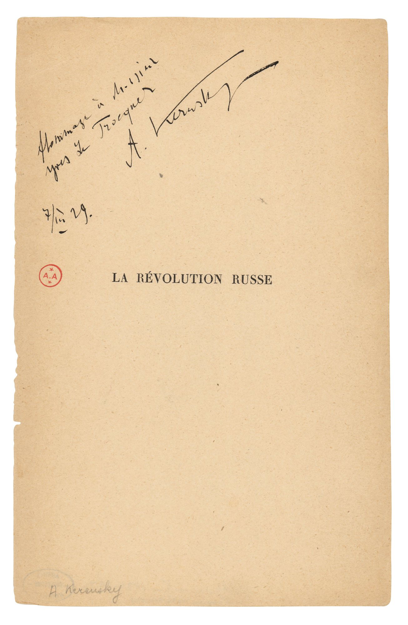 Provisional leader of the Soviet Union (1881–1970) from July to November 1917, when he was unseated by Lenin and forced into exile. Vintage fountain pen signature and inscription in French, "Hommage a Monsieur Yves Le Trocquer, A. Kerensky, 7/III 29,” on an off-white 5.5 x 8.75 page removed from his book La Revolution Russe. Reverse bears the ink stamp of the Artine Artinian Collection. In fine condition.