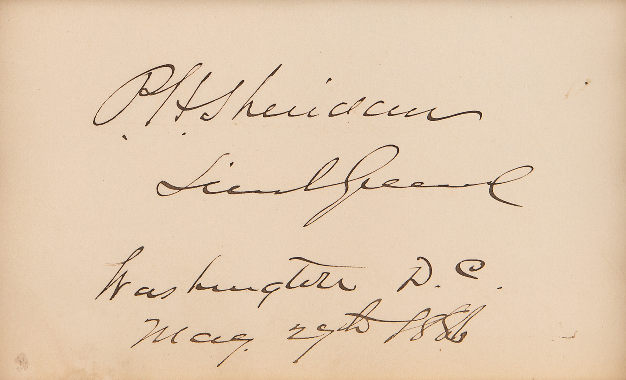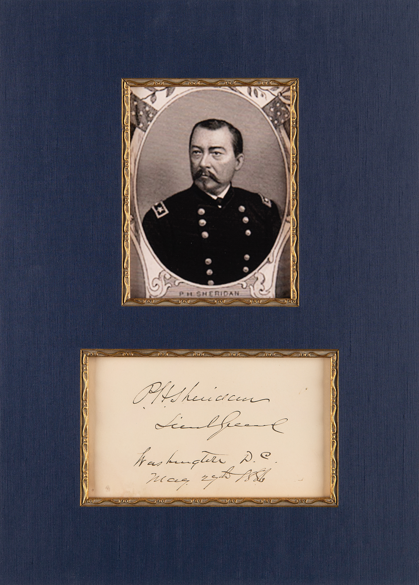 Bold ink signature, "P. H. Sheridan, Lieut. Gen. Washington, D.C. May 29th 1886,” on an off-white 6 x 3.5 album page, ornately cloth-matted with a portrait to an overall size of 10.75 x 14.75. In fine condition.