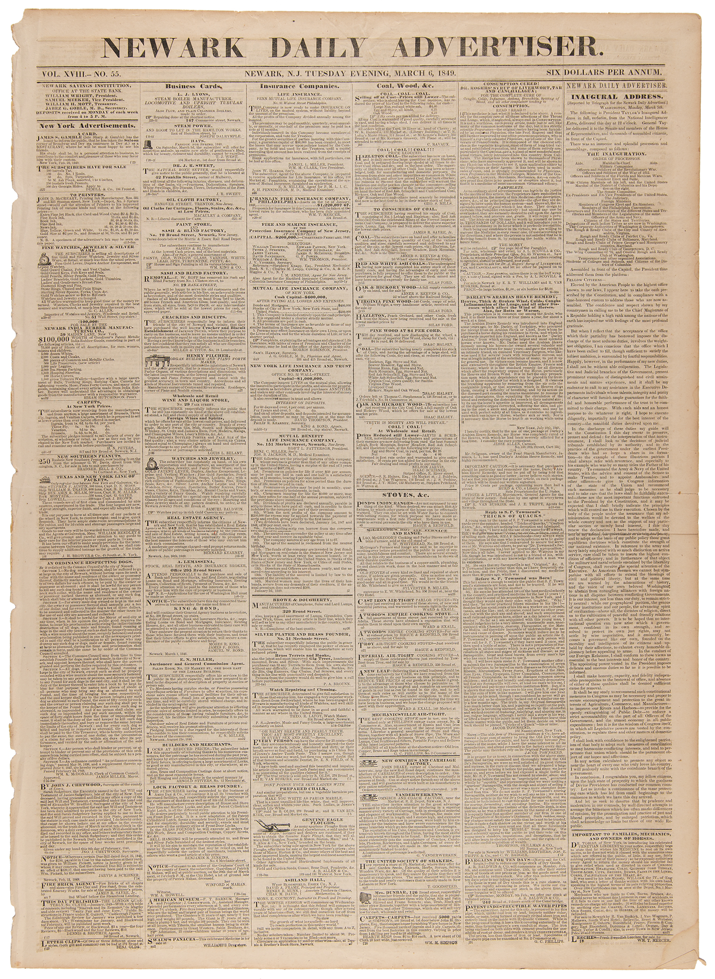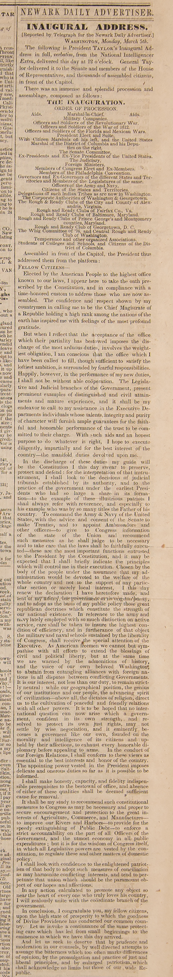 Complete issue of The Newark Daily Advertiser from March 6, 1849, four pages, 16.25 x 22.5, with a front-page article containing full text of the inaugural address of President Zachary Taylor, who became the 12th president of the United States on Monday, March 5, 1849, marking the second instance of an inauguration being rescheduled due to March 4th falling on a Sunday. The start of the address: “The confidence and respect shown by my countrymen in calling me to be the Chief Magistrate of a Republic holding a high rank among the nations of the earth have inspired me with feelings of the most profound gratitude; but when I reflect that the acceptance of the office which their partiality has bestowed imposes the discharge of the most arduous duties and involves the weightiest obligations, I am conscious that the position which I have been called to fill, though sufficient to satisfy the loftiest ambition, is surrounded by fearful responsibilities. Happily, however, in the performance of my new duties I shall not be without able cooperation.” The newspaper’s second page contains further particulars of the ceremonies and proceedings from the inauguration. In very good to fine condition, with wear and small tears to edges, and partial separation to the fragile spine.