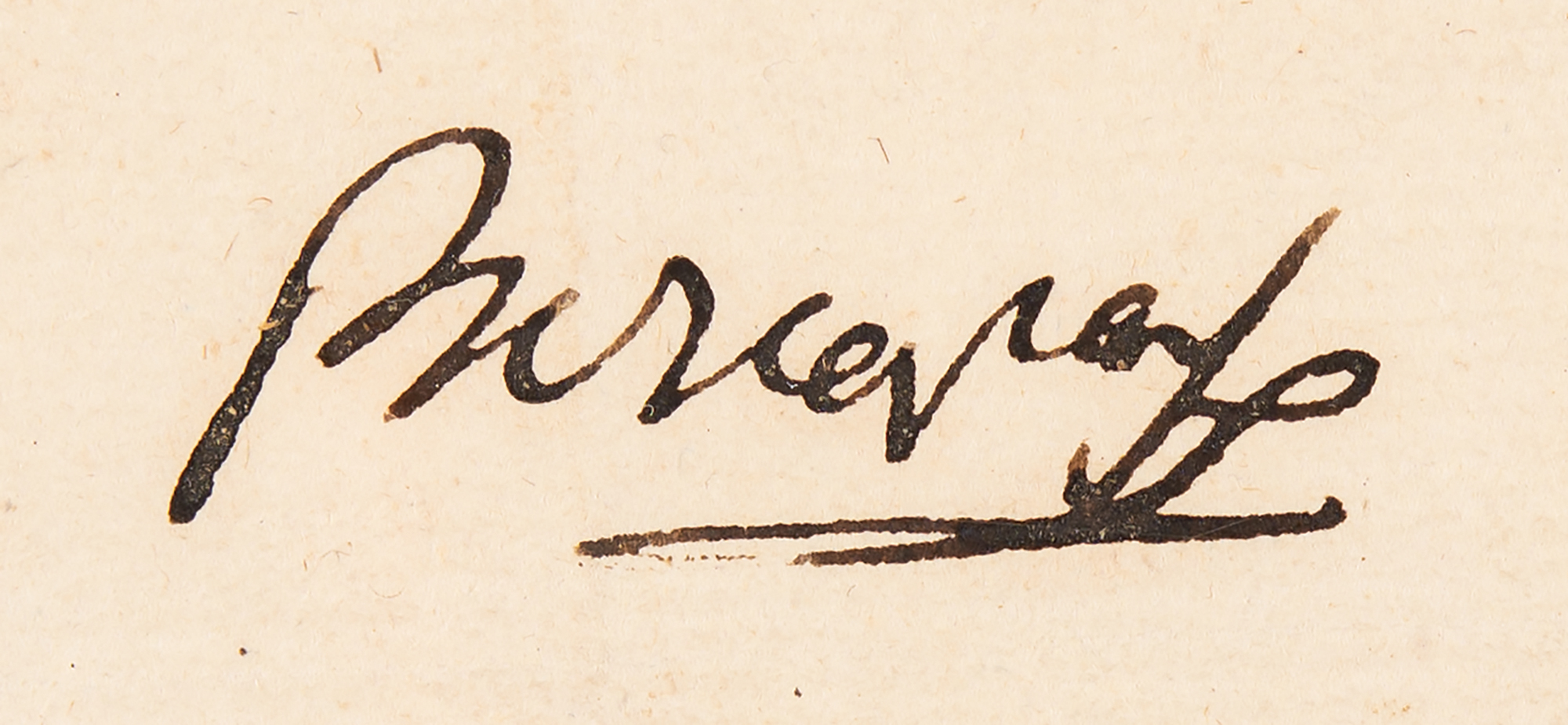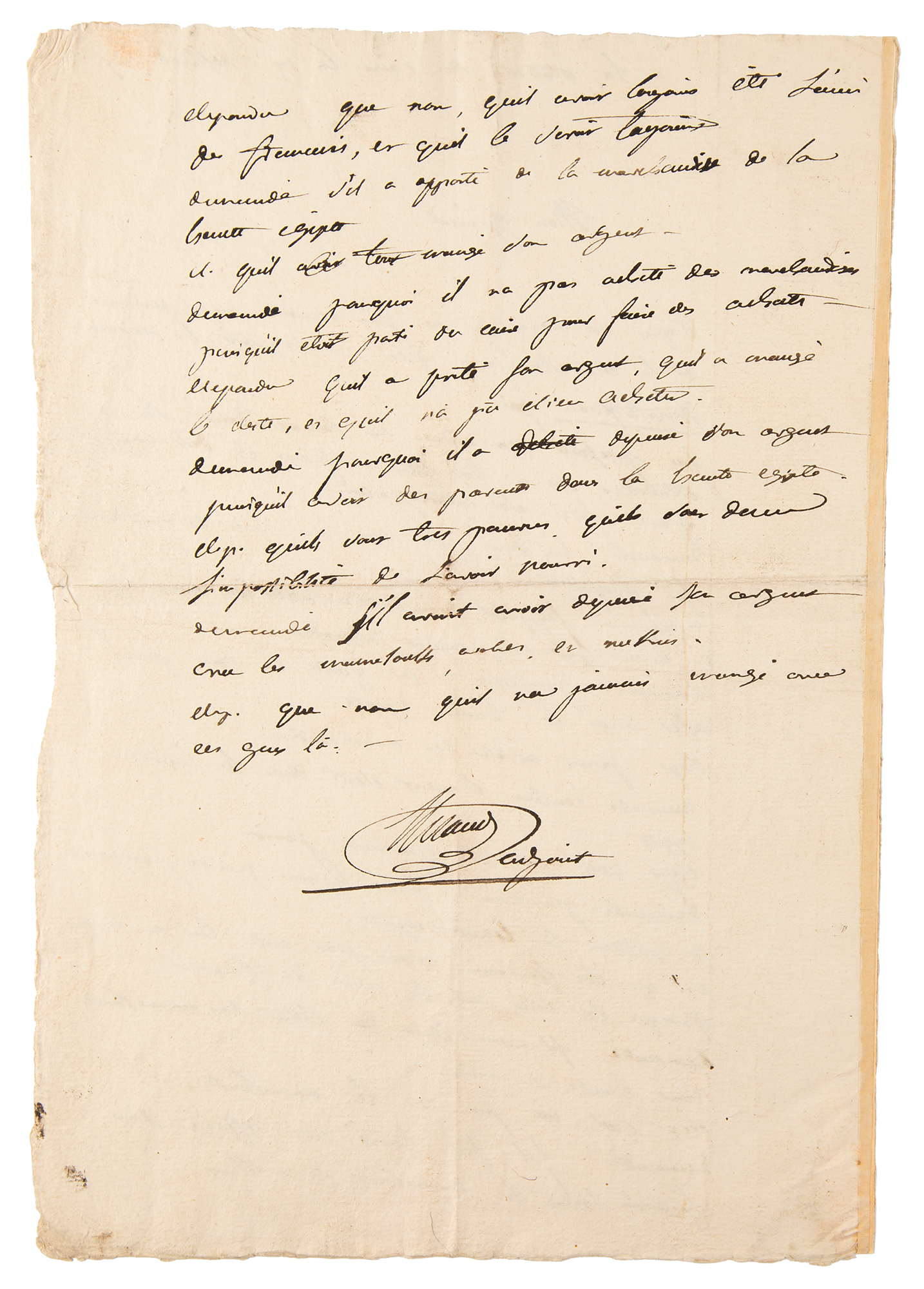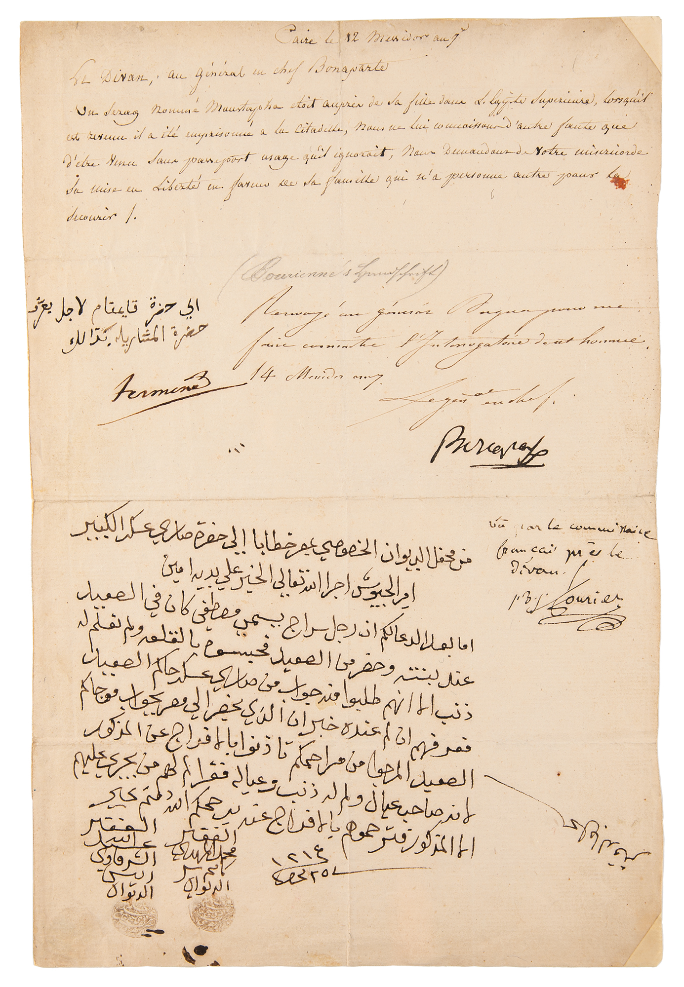 Manuscript DS, in French and Arabic, signed “Bonaparte,” one page, 9 x 13.75, June 30, 1799. A document from the Divan member in Cairo, Egypt, addressed to "general en chef Bonaparte," boldly signed at the center by Napoleon using his surname; this is one of the most complete, legible "Bonaparte" signatures we have ever encountered. The document pertains to Napoleon's request for the records of an interrogation of an Arab named Muustapha who had been arrested for violating passport regulations; the Divan claimed that Muustapha was innocent and sought his release. In very good to fine condition, with light creasing, soiling, and intersecting folds. Accompanied by a related letter signed by an aide, containing the requested account of the interrogation.