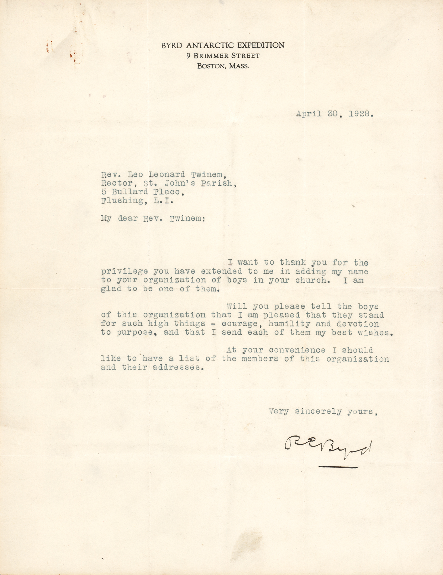 TLS signed “R. E. Byrd,” one page, 8.5 x 11, Byrd Antarctic Expedition letterhead, April 30, 1928. Letter to Rev. Leo Leonard Twinem, in full: "I want to thank you for the privilege you have extended to me in adding my name to your organization of boys in your church. I am glad to be one of them. Will you please tell the boys of this organization that I am pleased that they stand for such high things—courage, humility and devotion to purpose, and that I send each of them my best wishes. At your convenience I should like to have a list of the members of this organization and their addresses." In very good to fine condition, with multiple intersecting folds, and a few small stains and creases.