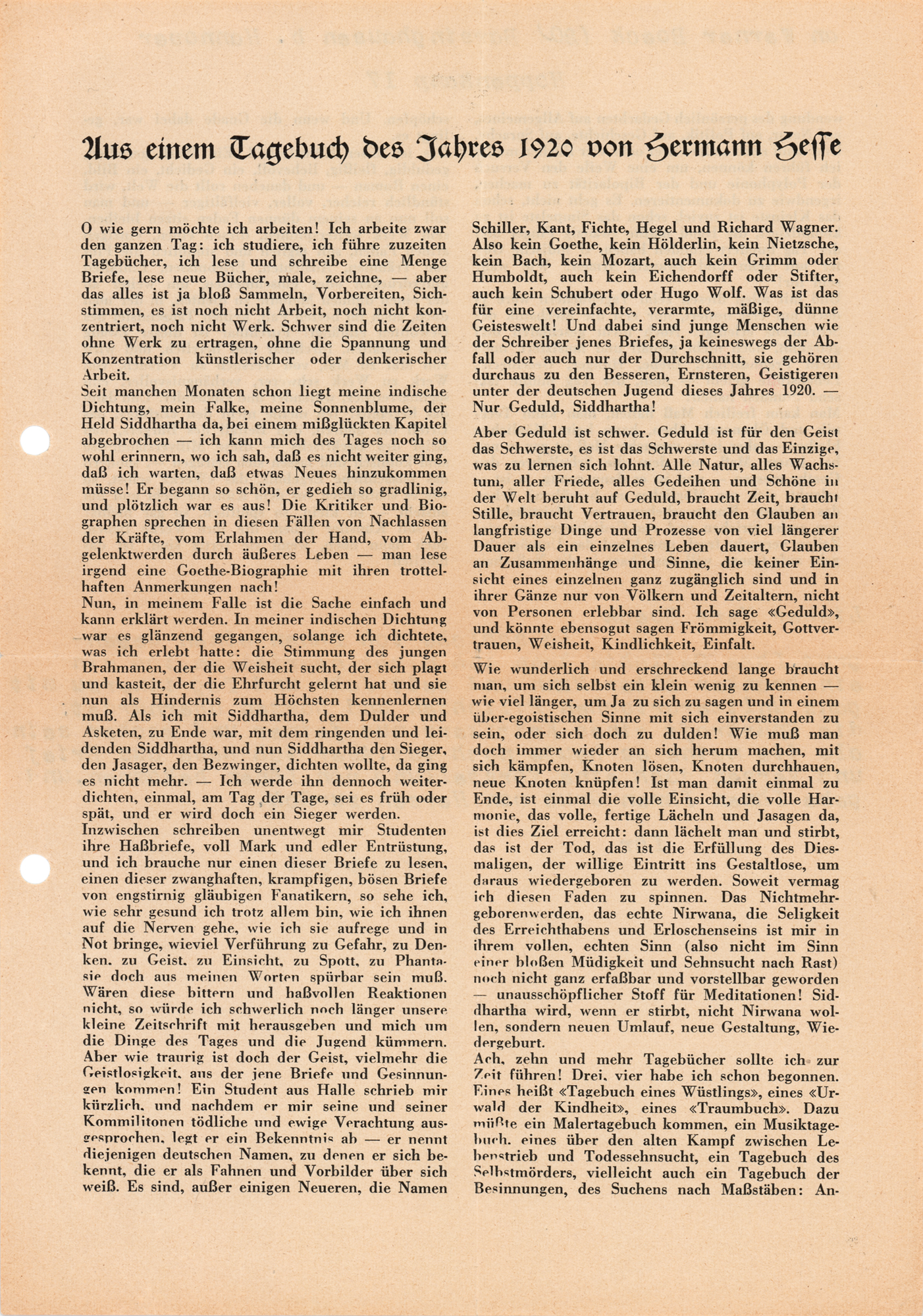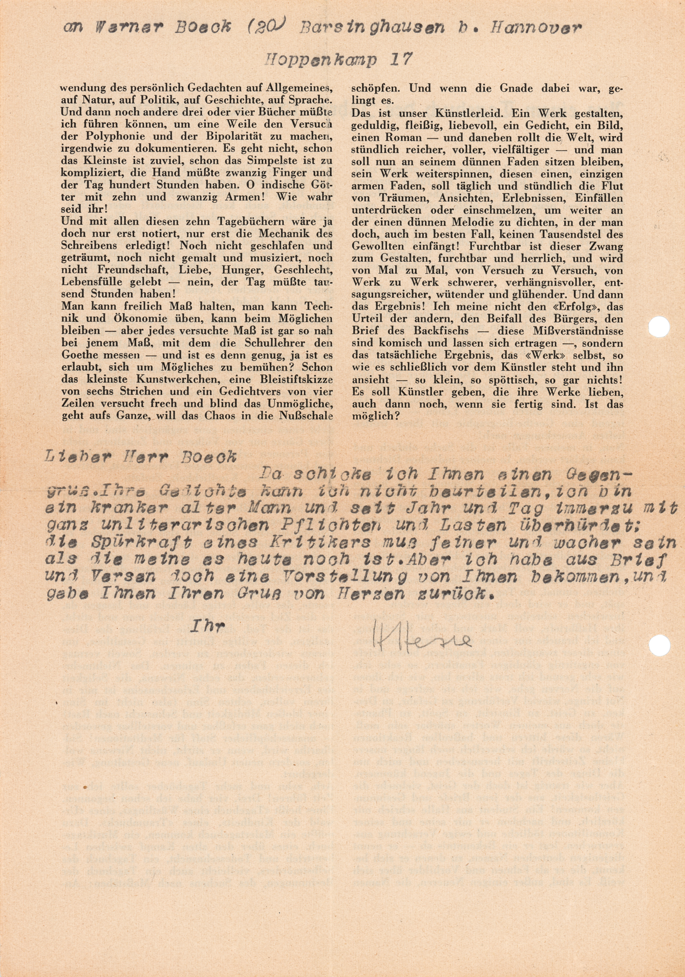 TLS in German, signed in pencil, “H. Hesse,” one page, 6.75 x 9.75, no date. Letter to Werner Boeck, typed in the lower margin of a printed leaf headed "Aus dem Tagebuch des Jahres 1920 von Hermann Hesse." In full (translated): "That's how I feel. My reading can't be helped, I'm a sharp change of heart and mind, and my thoughts and feelings are immersed in many unliterary phrases and are clearly expressed; the story is very detailed and I think it's even better now. Therefore, I have a brief and a sentence that I can use to describe what I've learned, and I can easily relate to my own experiences." In fine condition, with some faint toning.