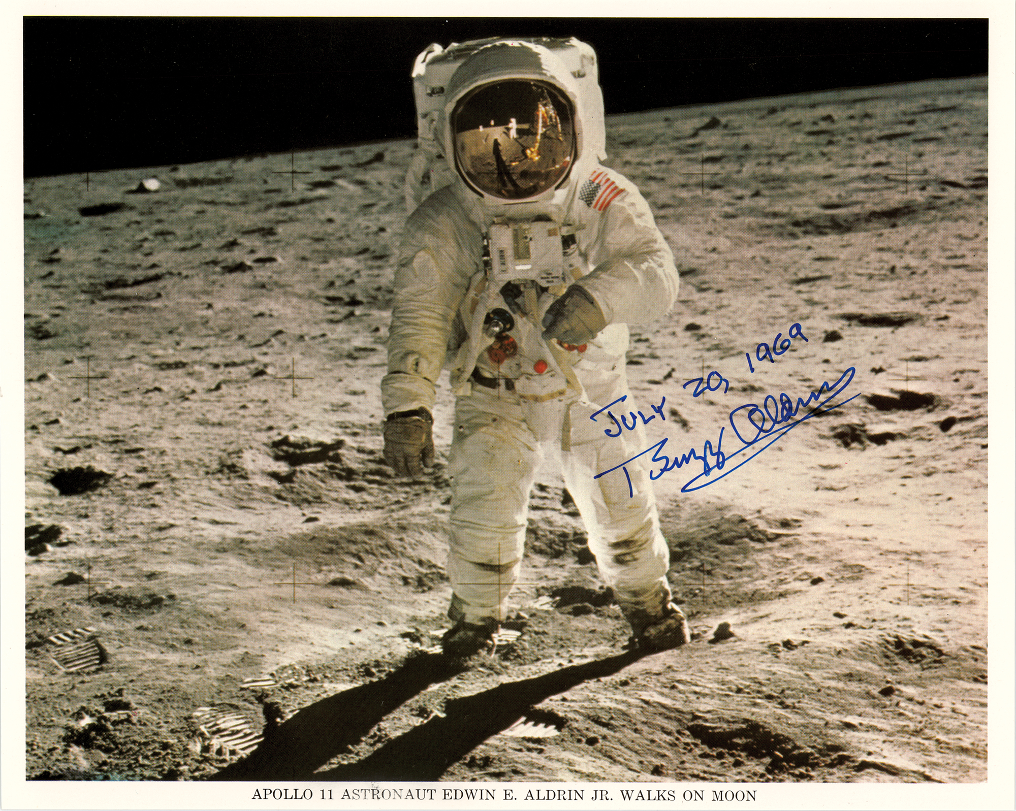 Official color 10 x 8 NASA lithograph of the iconic Apollo 11 'visor shot' of Buzz Aldrin taken by Neil Armstrong during their Apollo 11 EVA, signed in blue felt tip, "July 20, 1969, Buzz Aldrin." In very fine condition.