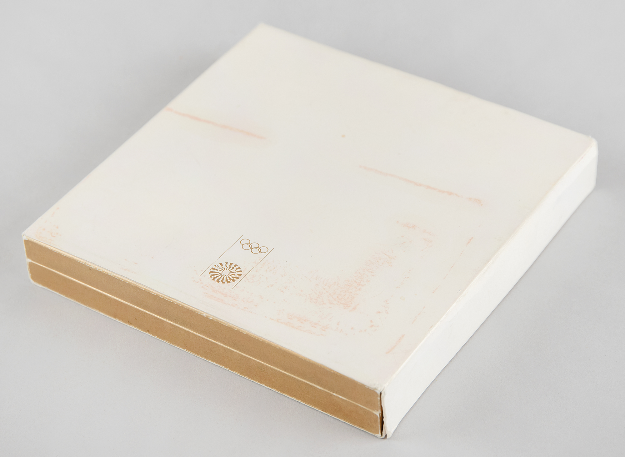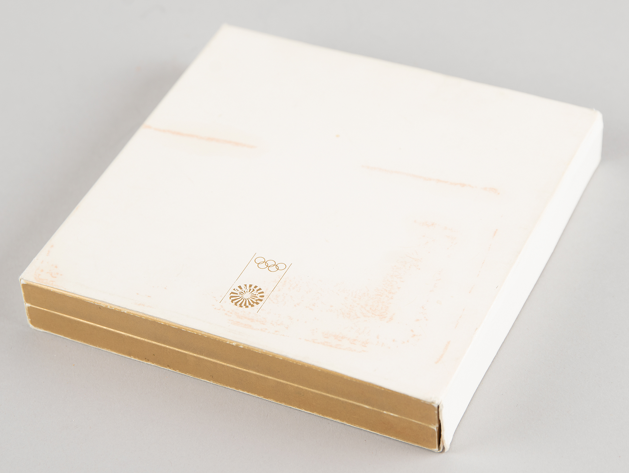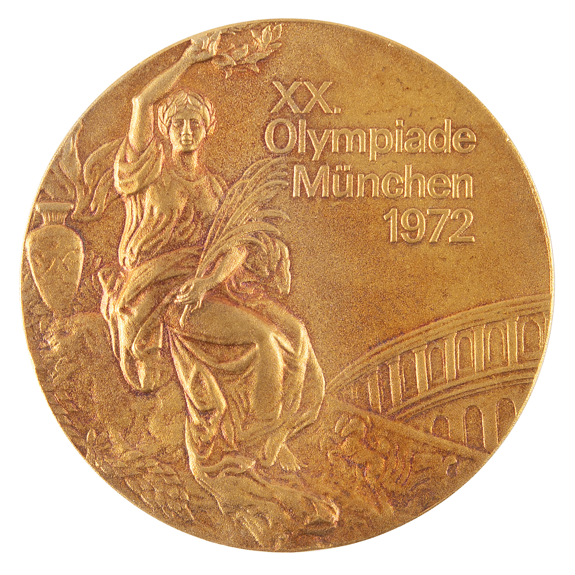 Highly sought-after unawarded winner's medal issued for the Munich 1972 Summer Olympics. Gilt silver, 66 mm, 158 gm (without chain) or 211 gm (with chain), by Gerhard Marcks; manufactured by the Bavarian Mint. The front is inscribed, “XX. Olympiade Munchen 1972,” and depicts the 'Seated Victory' with the Colosseum in the background; the reverse portrays the mythological twins Castor and Pollux, the patrons of competitive sport and friendship, with the artist's monogram below. The medal bears overall toning, and the loop to the upper edge has snapped cleanly at the base; the detached loop is present. Complete with its original golden chain, hinged plastic presentation box, and cardboard slipcover, which bears staining and marks to the top. This was the first winner's medal since 1928 to feature a new design on the reverse, replacing the traditional depiction of a victorious athlete carried by a jubilant crowd.