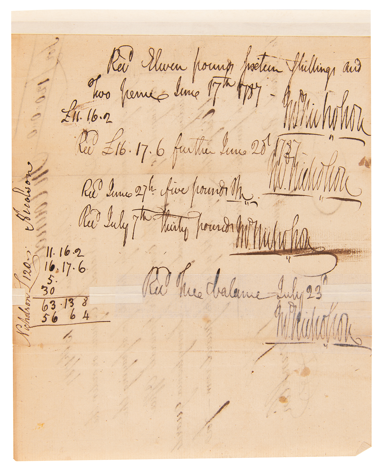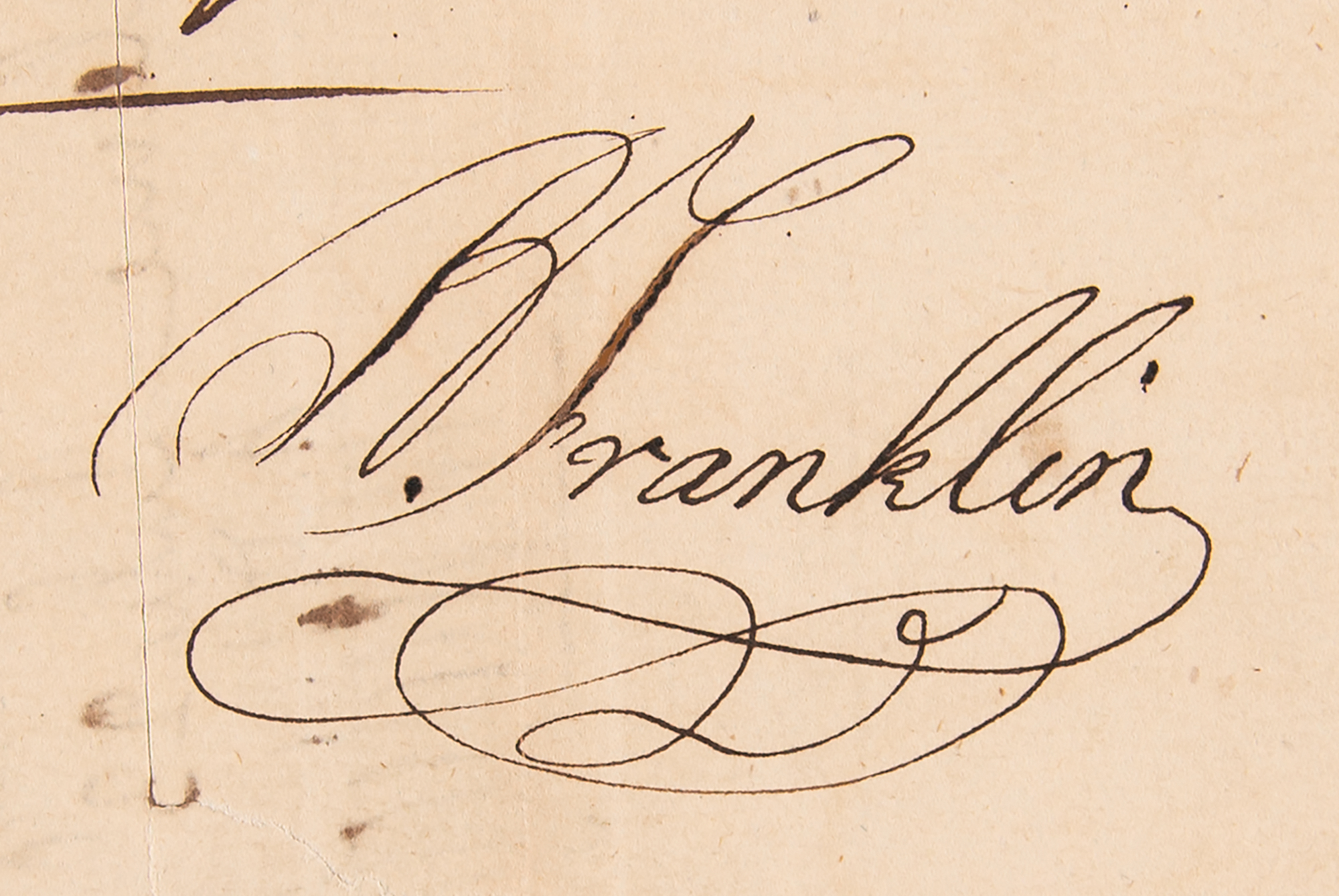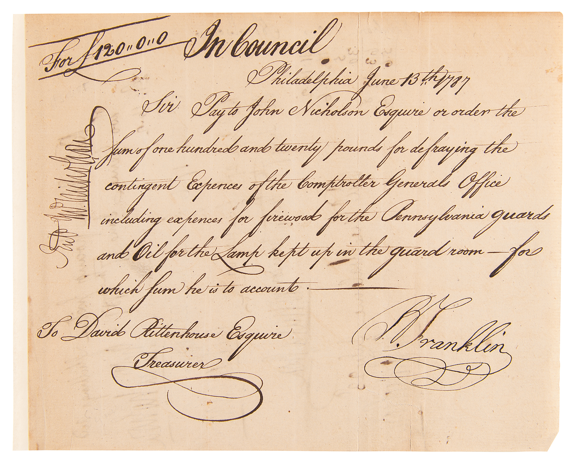 Manuscript DS signed "B. Franklin," one page, 7.75 x 6.5, June 13, 1787. Pay order issued to Treasurer David Rittenhouse, in part: "Pay to John Nicholson Esquire or order the sum of one hundred and twenty pounds for defraying the contingent Expences of the Comptroller General's Office including expences for firewood for the Pennsylvania guards and Oil for the Lamp kept in the guard room." Prominently signed at the conclusion by Franklin and endorsed several times by Nicholson on the reverse. In fine condition, with a thin old mounting strip along the left edge, and partial fold separations repaired on the reverse.
