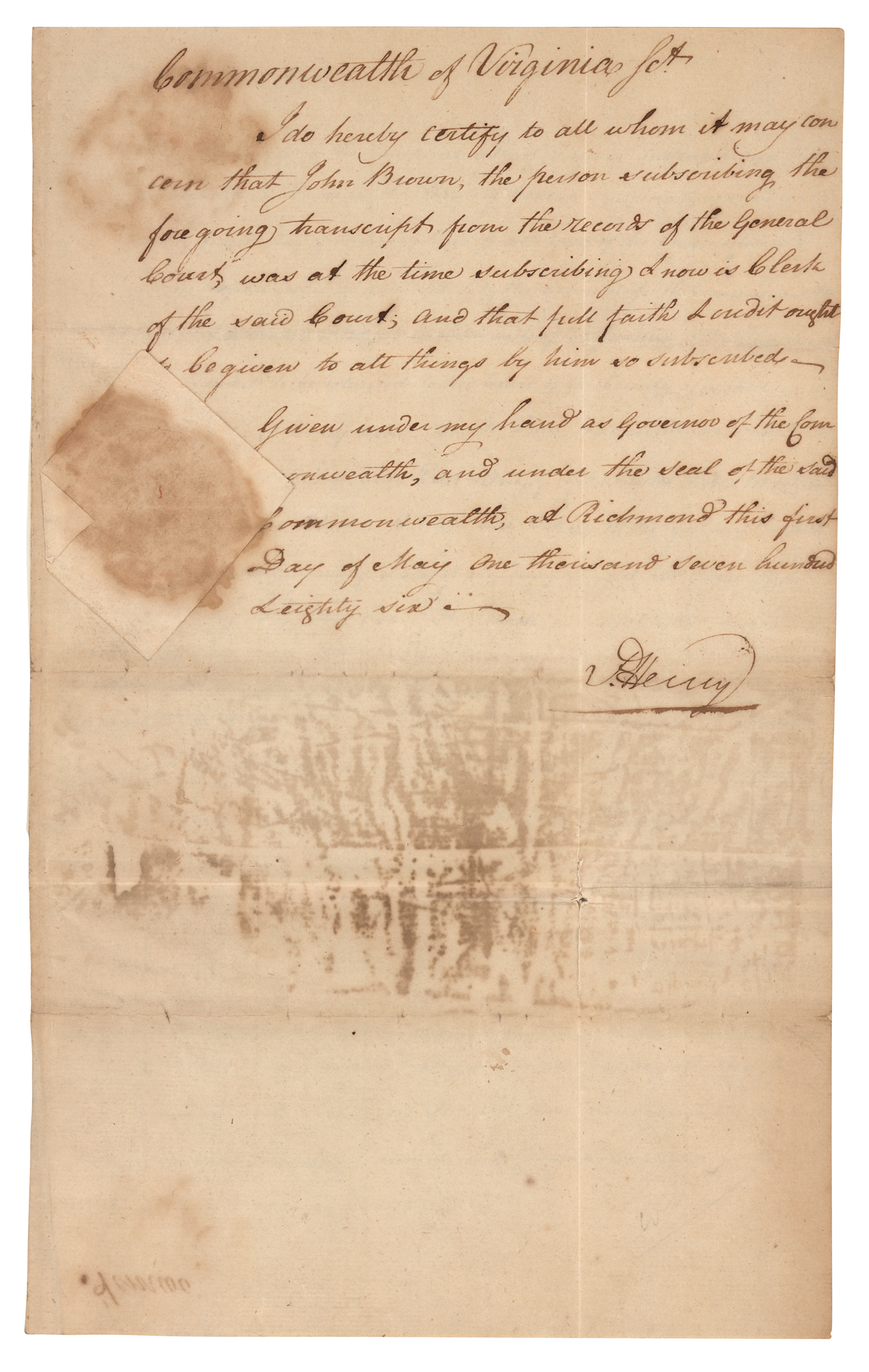 Manuscript DS, signed "P. Henry," one page, 7.25 x 11.75, May 1, 1786. As governor of Virginia, Henry certifies that "John Brown, the person subscribing the foregoing transcript from the records of the General Court, was at the time subscribing & now is Clerk of the said Court; and that full faith & credit ought to be given to all things by him so subscribed." Signed at the conclusion by Henry; attached is Brown's true manuscript copy of a document related to a court case. Folded and tipped into Patrick Henry by Moses Coit Tyler. In very good to fine condition, with scattered staining, and some old repairs to fold splits.