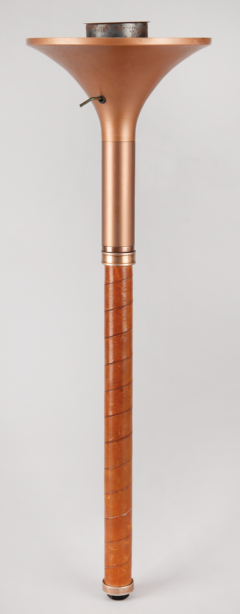 Rare and unusual 1980 Lake Placid Olympics torch carried by DeForrest Jackson as Georgia's runner in the official torch relay, comprised of bronze-colored leather and metal, measuring 28.5˝ in length and 8.5˝ at its widest point, designed by Don McFarland and manufactured by Cleanweld Turner. The torch design and materials symbolized a blend of modern technology and a reference to Ancient Greece. The central ring lacks the Lake Placid emblem and text seen on many torches, as issued for this variant; the torch bowl also has a rare metal switch seen on few other examples of Lake Placid 1980 Winter Olympic relay torches, evidently designed to control the burn rate. The bottom brass ring, which exhibits some light wear, is engraved with the maker's information, "Cleanweld / Turner, Sycamore, Illinois” and marked “102.” The burner bowl remains in place. The torch exhibits some wear and scuffing to its leather-wrapped handle, as well as general overall wear from use in the relay.