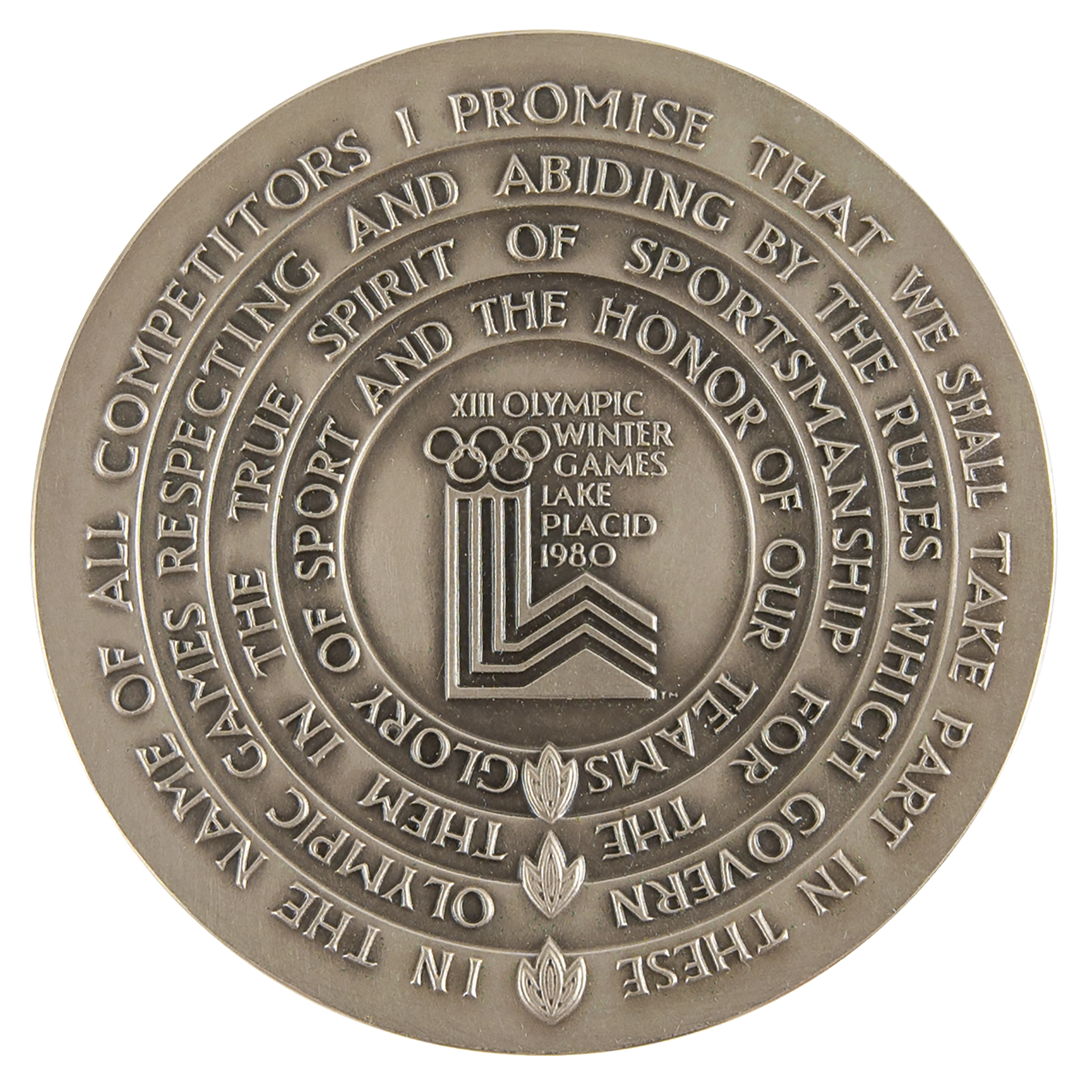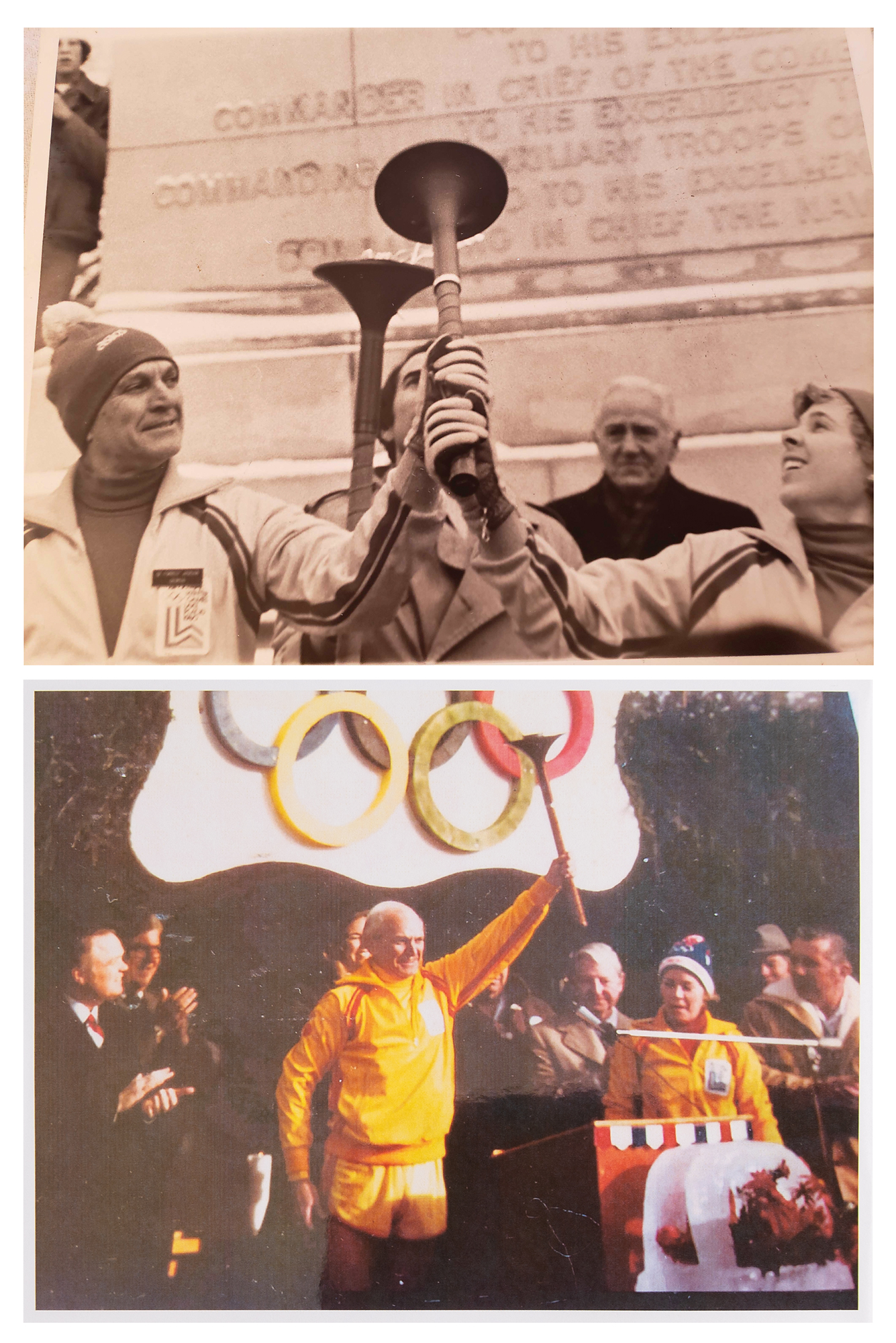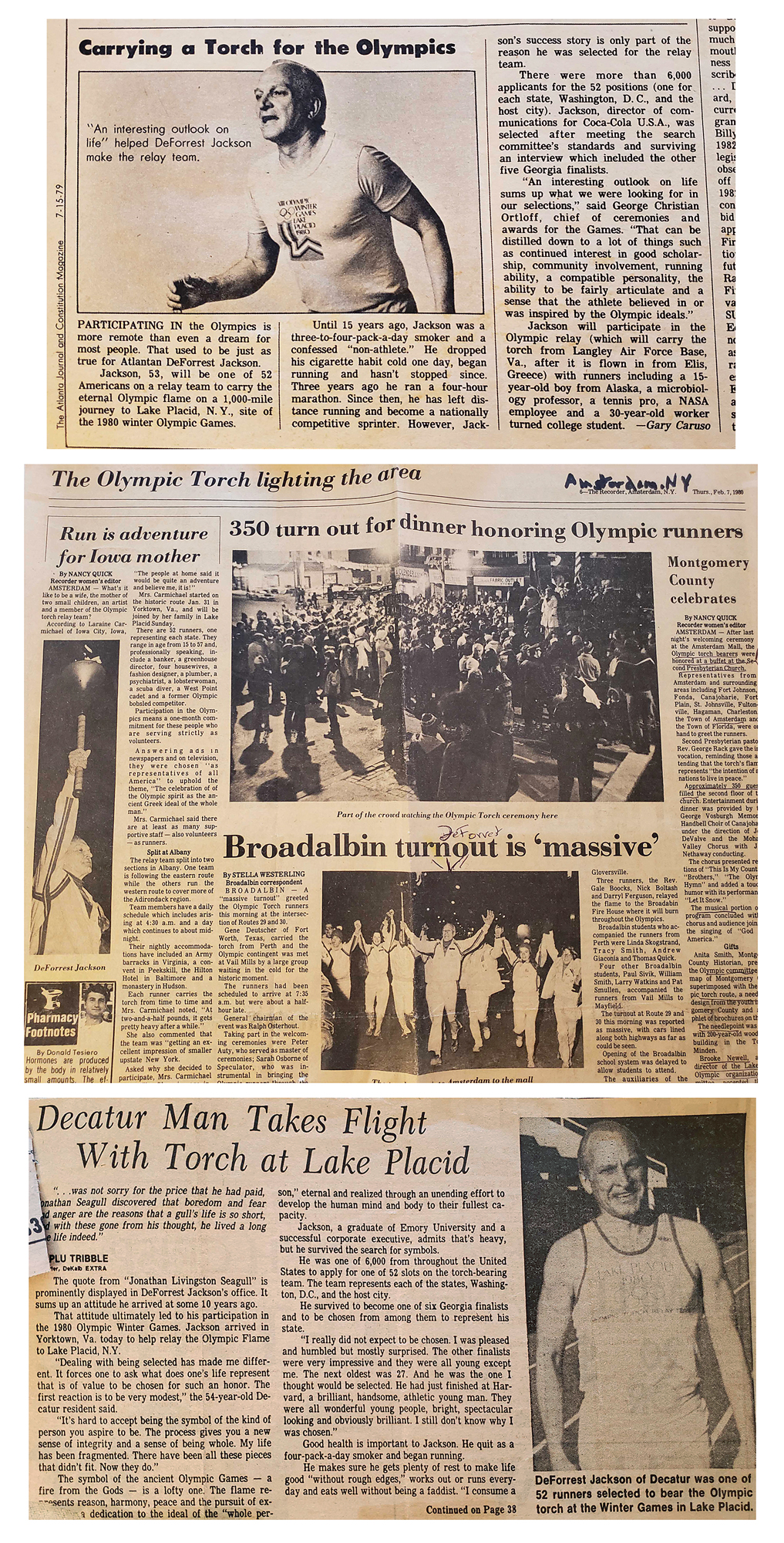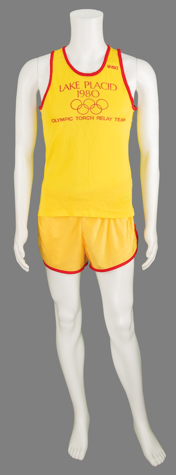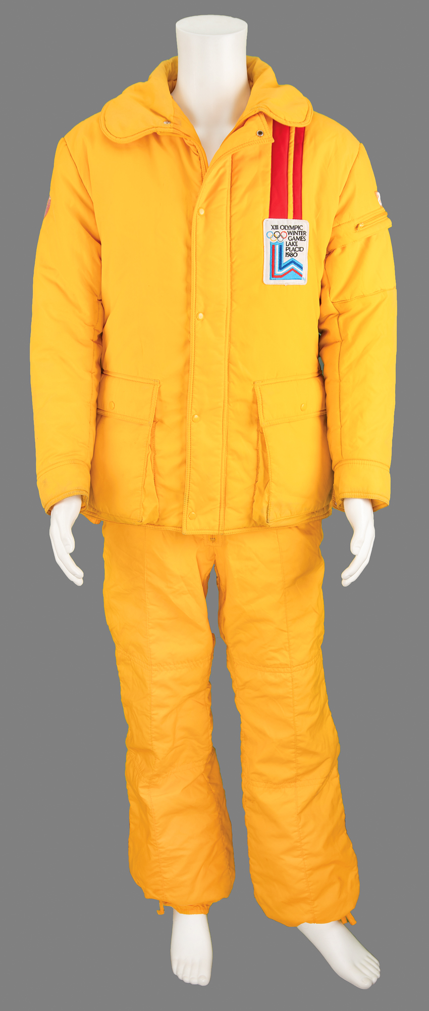 Additionally includes several uniform pieces and souvenirs issued to DeForrest Jackson to commemorate his role as a member of the Lake Placid 1980 Olympic Torch Relay Team: a thick, bright yellow winter jacket featuring a "XIII Olympic Winter Games Lake Placid 1980" embroidered patch on the chest, with matching winter overalls and a pair of gloves, all made by Asics; a "Lake Placid 1980 Olympic Torch Relay Team" tank top with matching running shorts, both made by Asics; a large 5' by 3' blue-and-white flag of the Lake Placid 1980 Olympic Winter Games; and an official nickel-silver participation medal issued for the Lake Placid 1980 Winter Olympics, housed in its original hinged case, featuring modernist relief views of the nine winter sports on the front, with Lake Placid Games emblem encircled by the raised words of the Olympic oath in four concentric circles on the reverse. Also accompanied by photocopies of three newspaper articles about DeForrest Jackson's participation in the Lake Placid 1980 torch relay.