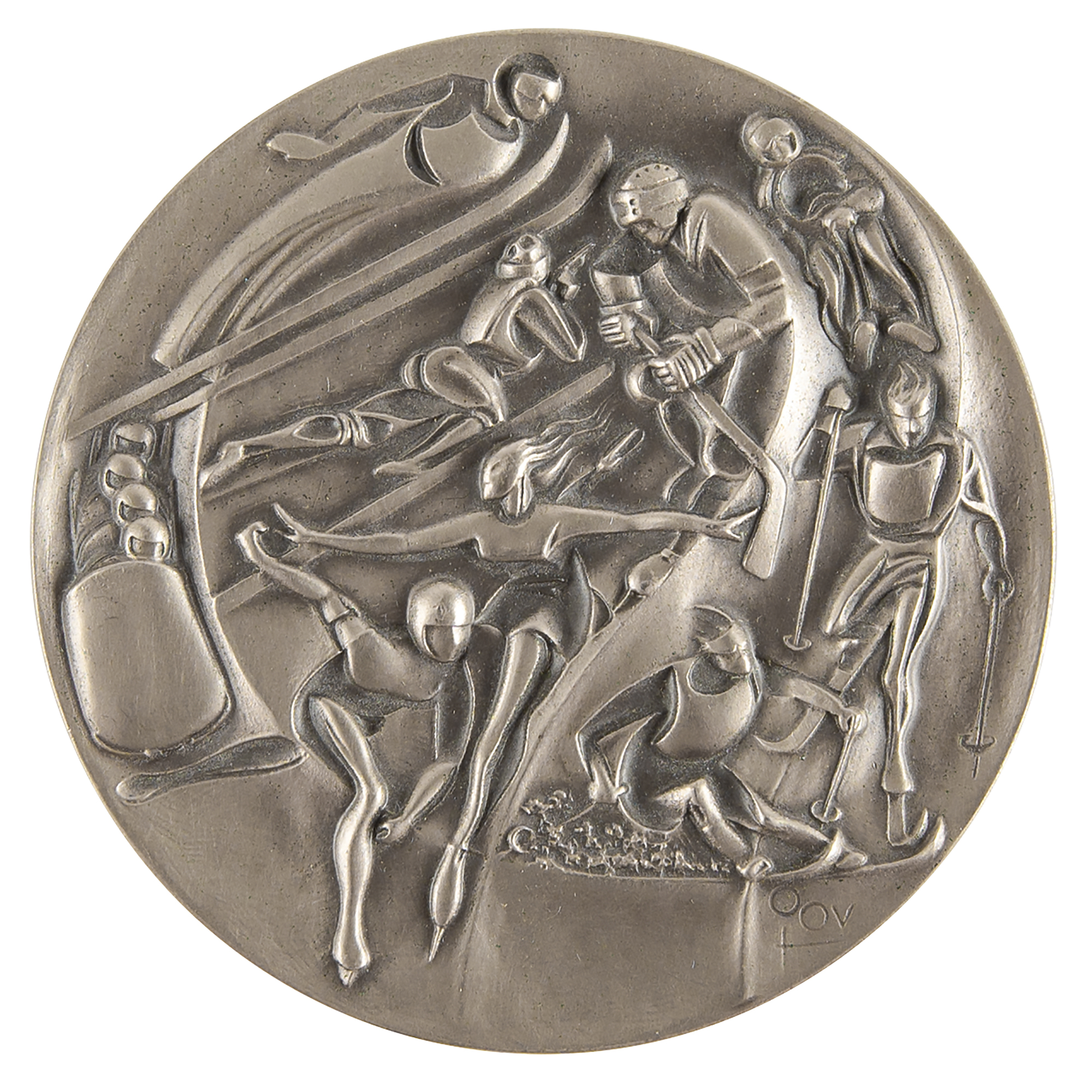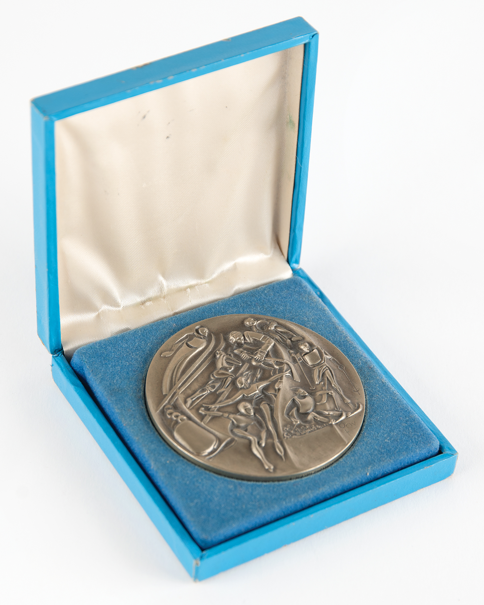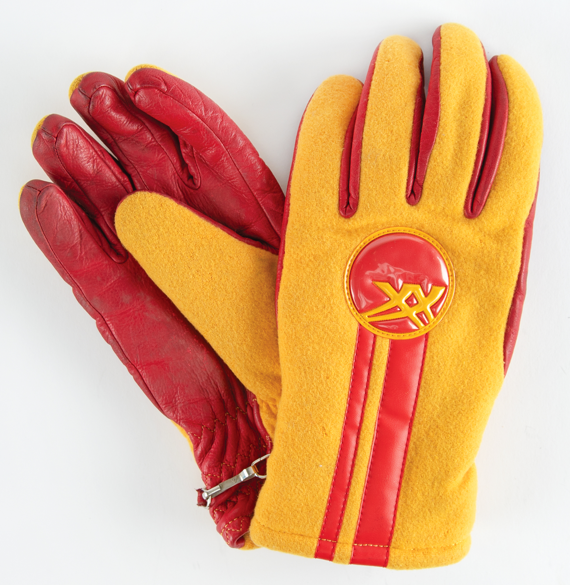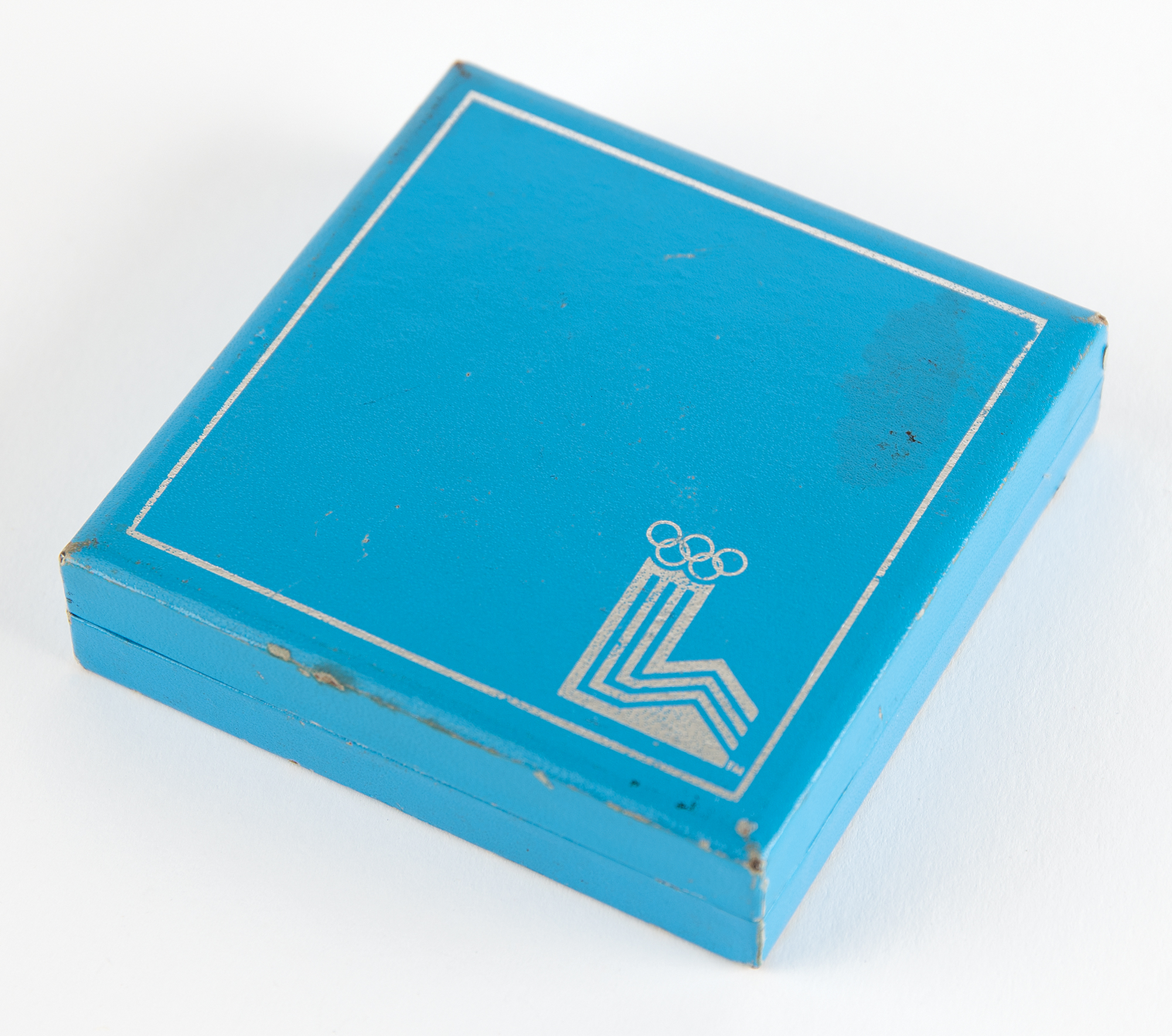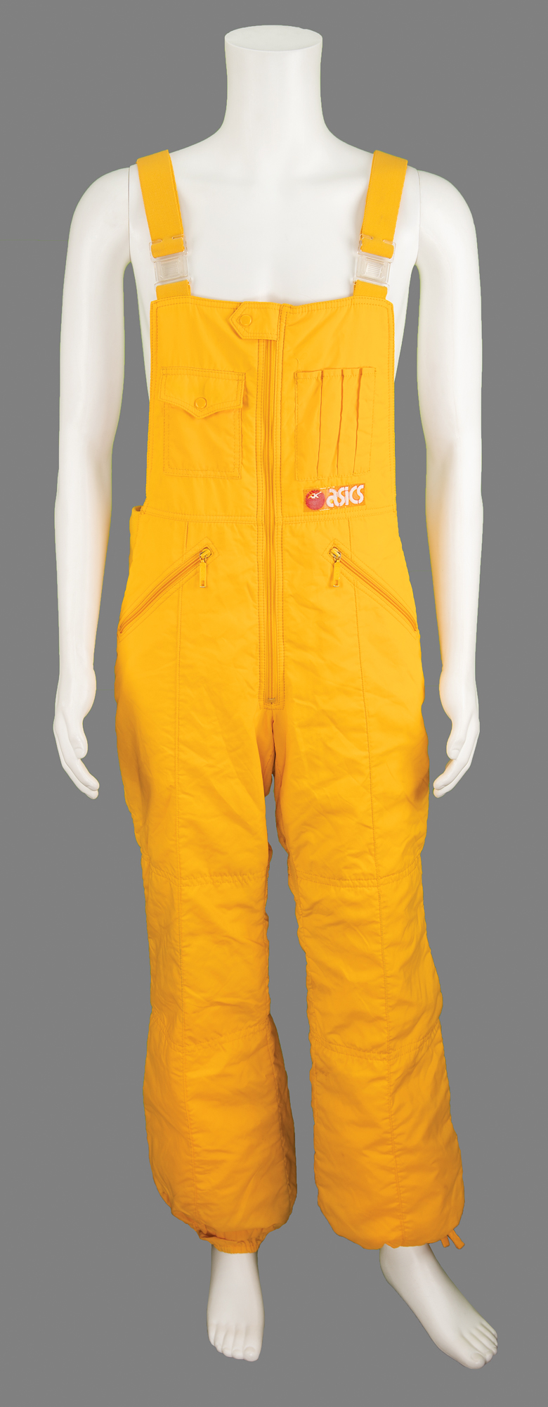 Additionally includes several uniform pieces and souvenirs issued to DeForrest Jackson to commemorate his role as a member of the Lake Placid 1980 Olympic Torch Relay Team: a thick, bright yellow winter jacket featuring a "XIII Olympic Winter Games Lake Placid 1980" embroidered patch on the chest, with matching winter overalls and a pair of gloves, all made by Asics; a "Lake Placid 1980 Olympic Torch Relay Team" tank top with matching running shorts, both made by Asics; a large 5' by 3' blue-and-white flag of the Lake Placid 1980 Olympic Winter Games; and an official nickel-silver participation medal issued for the Lake Placid 1980 Winter Olympics, housed in its original hinged case, featuring modernist relief views of the nine winter sports on the front, with Lake Placid Games emblem encircled by the raised words of the Olympic oath in four concentric circles on the reverse. Also accompanied by photocopies of three newspaper articles about DeForrest Jackson's participation in the Lake Placid 1980 torch relay.