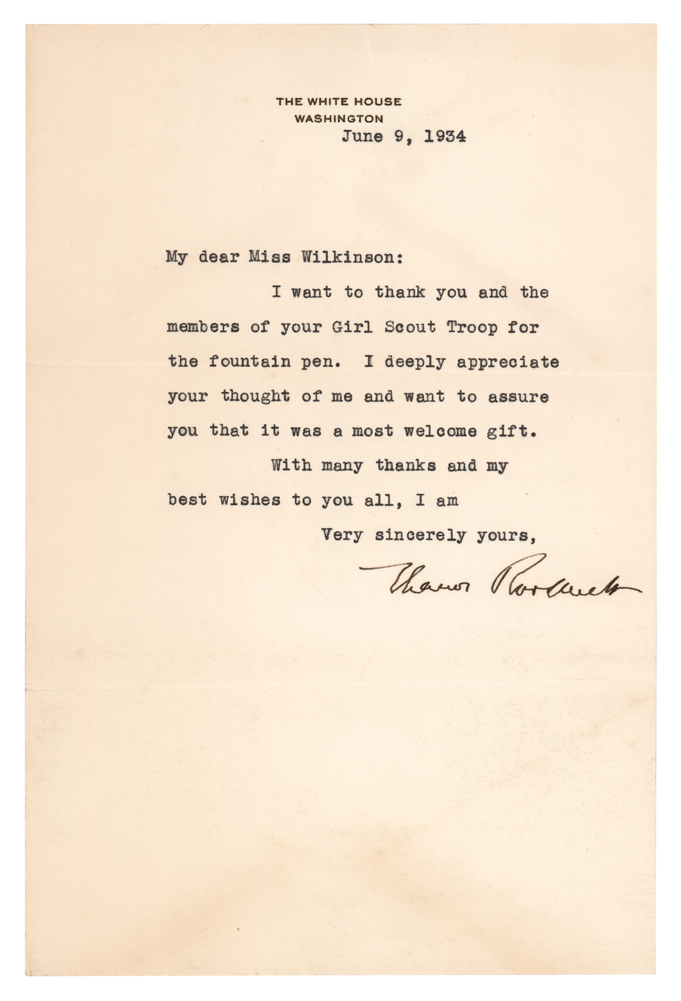TLS as first lady, one page, 6 x 9.25, White House letterhead, June 9, 1934. Letter to Miss Florence H. Wilkinson, captain of Girl Scout Troop No. 2, Grafton, West Virginia, in part: "I want to thank you and the members of your Girl Scout Troop for the fountain pen. I deeply appreciate your thought of me and want to assure you that it was a most welcome gift." In fine condition, with light scattered creasing. Accompanied by the original White House mailing envelope.