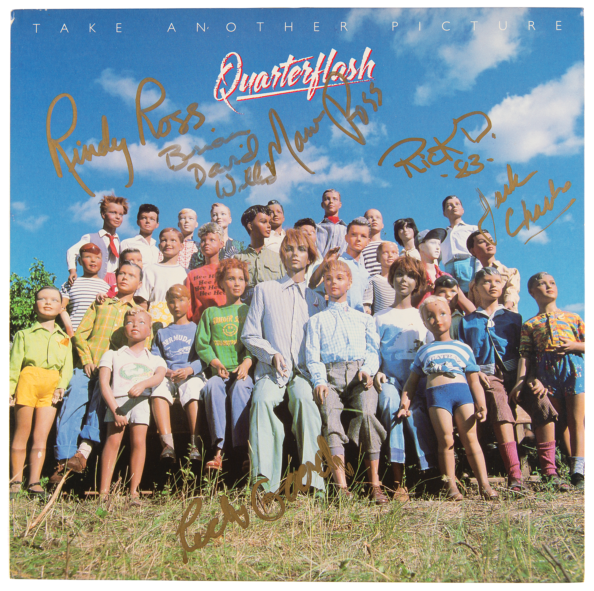 Take Another Picture album by Quarterflash, signed on the front cover in gold ink by Rindy Ross, Rich Gooch, Brian David Willis, Marv Ross, Rick DiGiallonardo, and Jack Charles. In fine condition. The record is included. Consignor notes that the signatures were obtained at the Fairlawn Hilton prior to the band's show at the Blossom Music Center in Cuyahoga Falls, Ohio.
