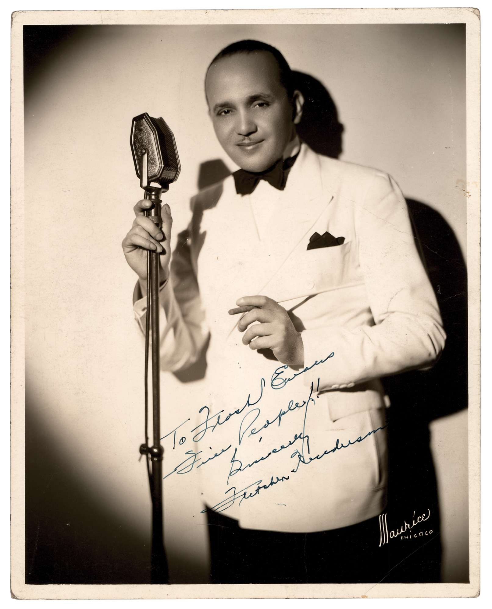 American pianist, bandleader, arranger, and composer (1897–1952) who was important in the development of big band jazz and swing music. He was one of the most prolific black musical arrangers and, along with Duke Ellington, is considered one of the most influential arrangers and bandleaders in jazz history. Vintage semi-glossy 8 x 10 photo of Henderson at the microphone by Maurice of Chicago, signed and inscribed in fountain pen, "To Flash Evans, fine people! Sincerely, Fletcher Henderson.” In very good condition, with two moderately heavy diagonal creases intersecting at Fletcher's mouth. Flash Evans was a dancer and stand-up comedian of the era.